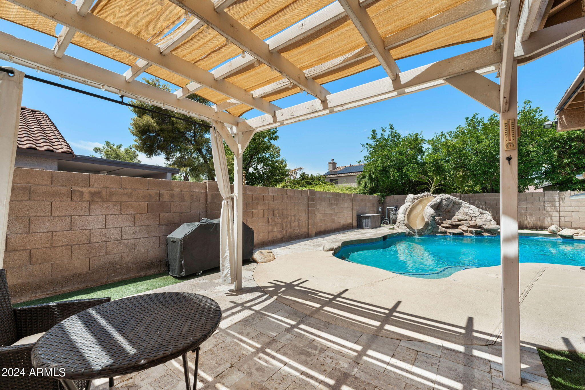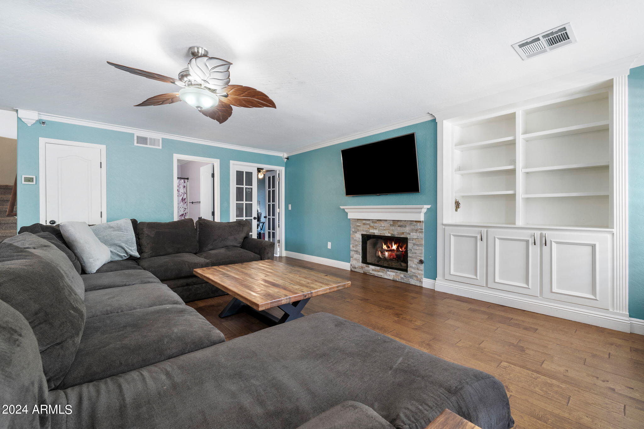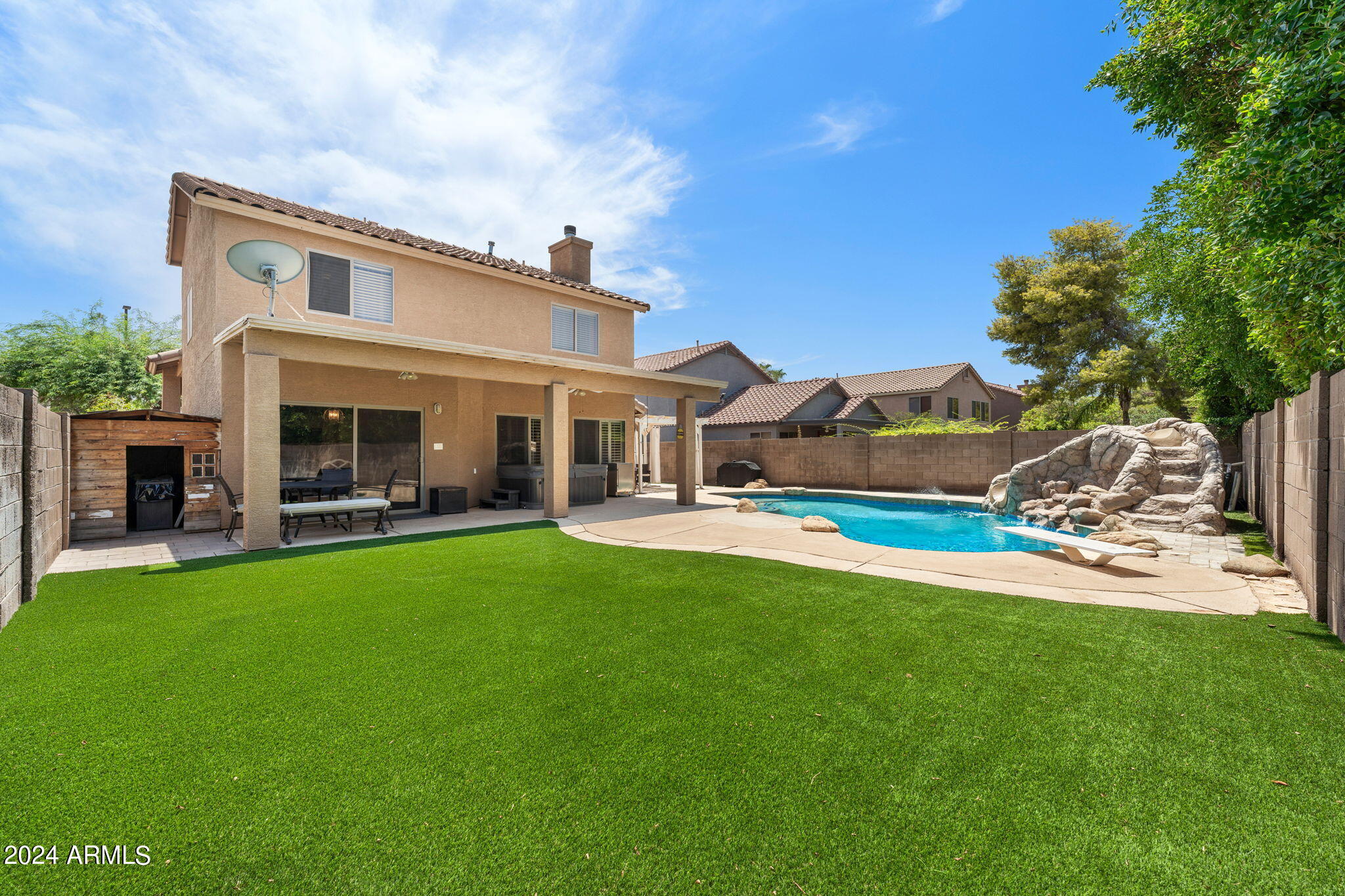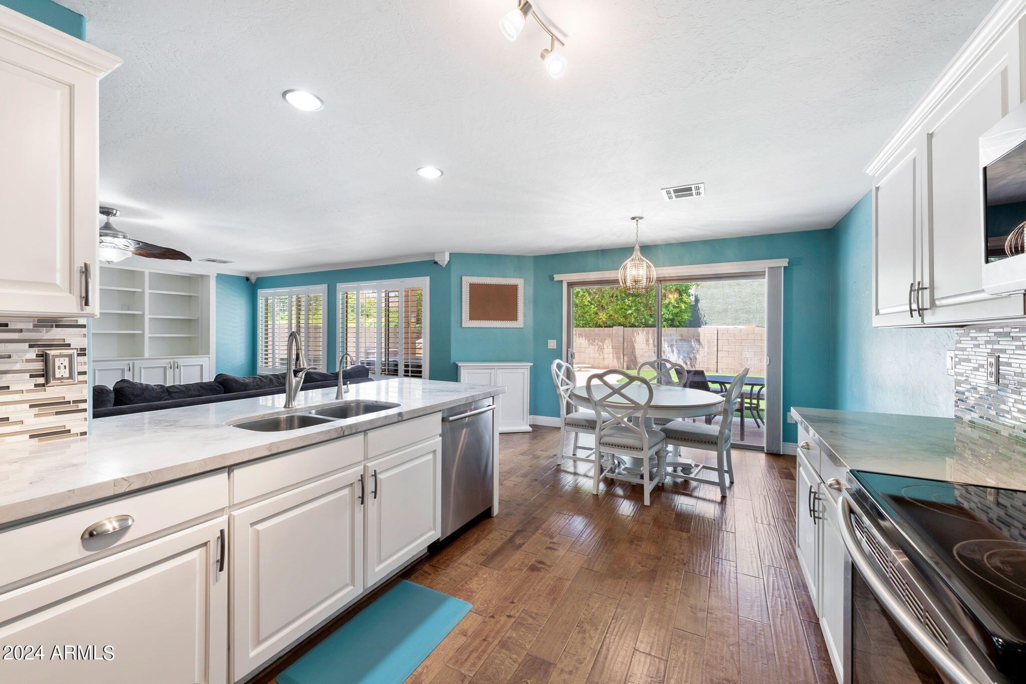 Experience luxury living in this exquisite 5-bedroom, 3-bathroom home nestled in a prestigious golf community, designed for ultimate comfort and entertaining.Inside, the home showcases a harmonious blend of hardwood flooring and plush carpet, highlighted by a gas fireplace with a striking stone wall. The living room features a custom built-in bookcase, adding a touch of sophistication, while the plantation shutters installed in 2022 enhance privacy and elegance.The chef's kitchen is a culinary delight with granite countertops, stainless steel appliances, and a large walk-in pantry. Granite countertops extend to two bathrooms, with quartz countertops adorning the additional bathroom.