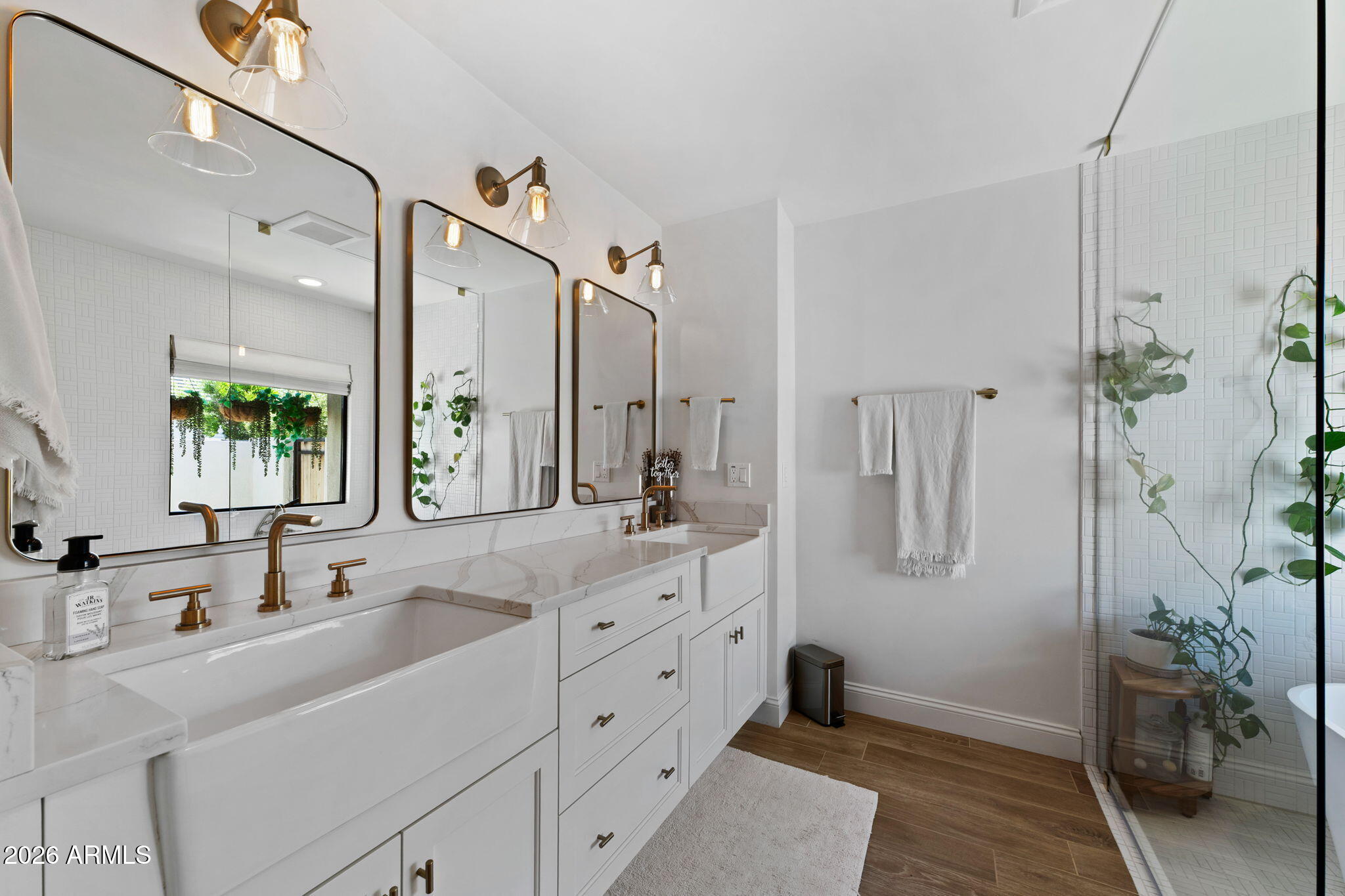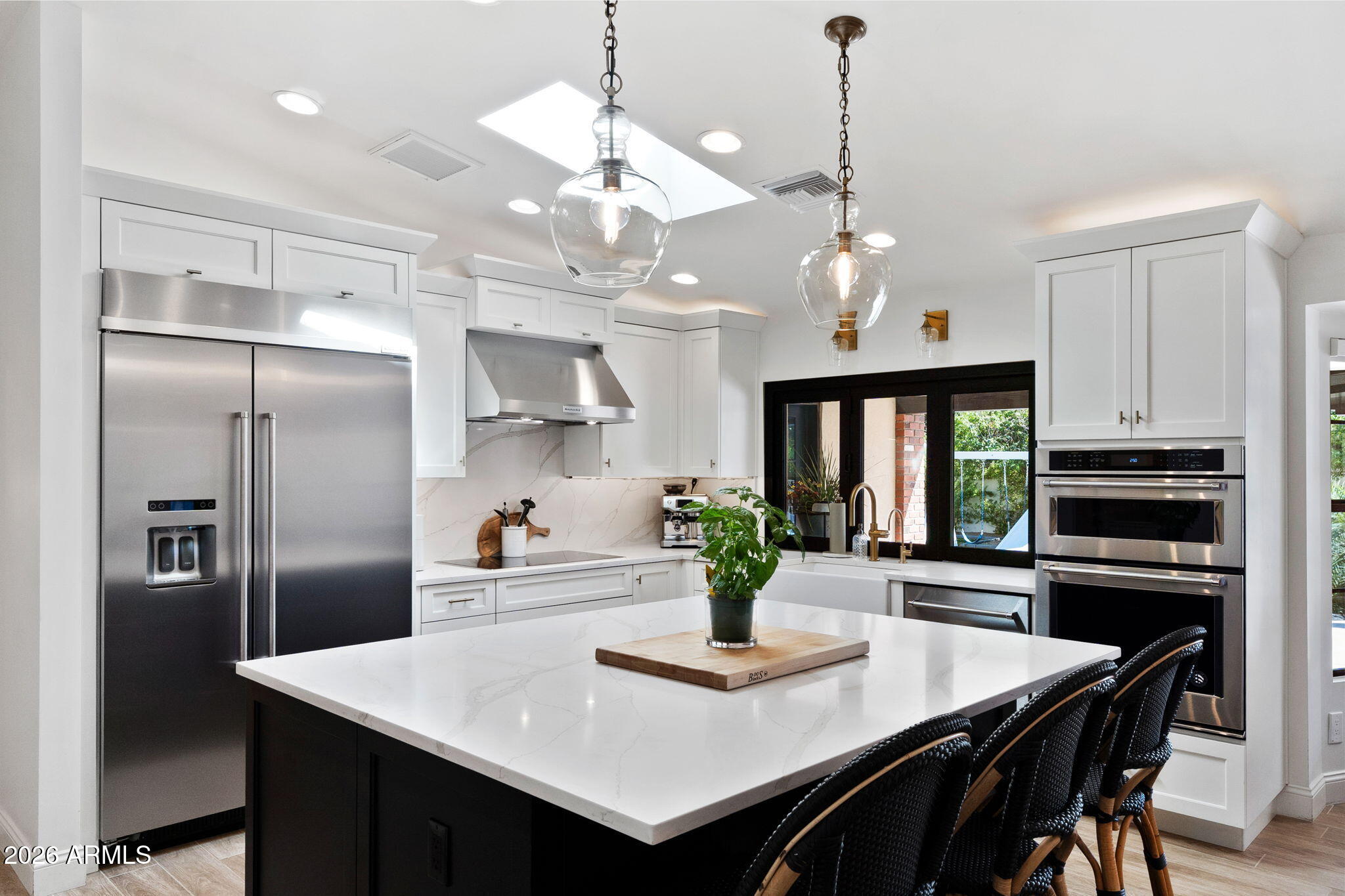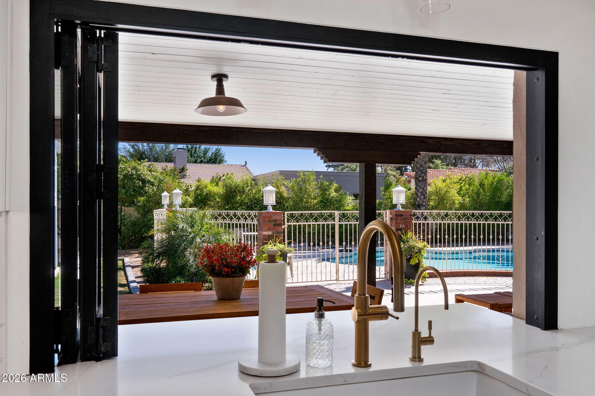 This stunning single-level Tempe home was thoughtfully redesigned in 2020 into a modern, open-concept showpiece. Situated on a large corner lot with no HOA, every inch of the layout has been optimized, creating a perfect blend of style, comfort, and functionality. Featuring an attached CASITA! The heart of the home is the chef's kitchen, featuring KitchenAid appliances, an induction cooktop, quartz countertops, a butler's pantry, and convenient power outlets above and below the counters. The details throughout this home are noted the moment you walk through the doors, recessed lighting, and tile plank flooring throughout adds architectural interest and sophistication. The oasis awaits in the backyard, as you enter via accordion glass doors that open fully to the backyard, seamlessly blending indoor and outdoor living. Step outside to your private resort-style retreat featuring a redone pool and spa with new plaster and decking, an outdoor grilling area, landscape lighting, and a drip irrigation system. Major system upgrades include a durable metal roof with foam insulation (2020), two high-efficiency 17 SEER HVAC units installed in 2020, and an 80-gallon water heater. The home also features a whole-house water softener, reverse osmosis in the kitchen, a redesigned HVAC system, and a hot-water recirculation system for faster delivery to the primary bath. All bedrooms feature walk-in closets, and the home includes a versatile attached casita and guest space of approximately 400 sq ft with its own bedroom and full bathroom, accessible from the garage or backyard--ideal for guests, multi-generational living, or a private office.