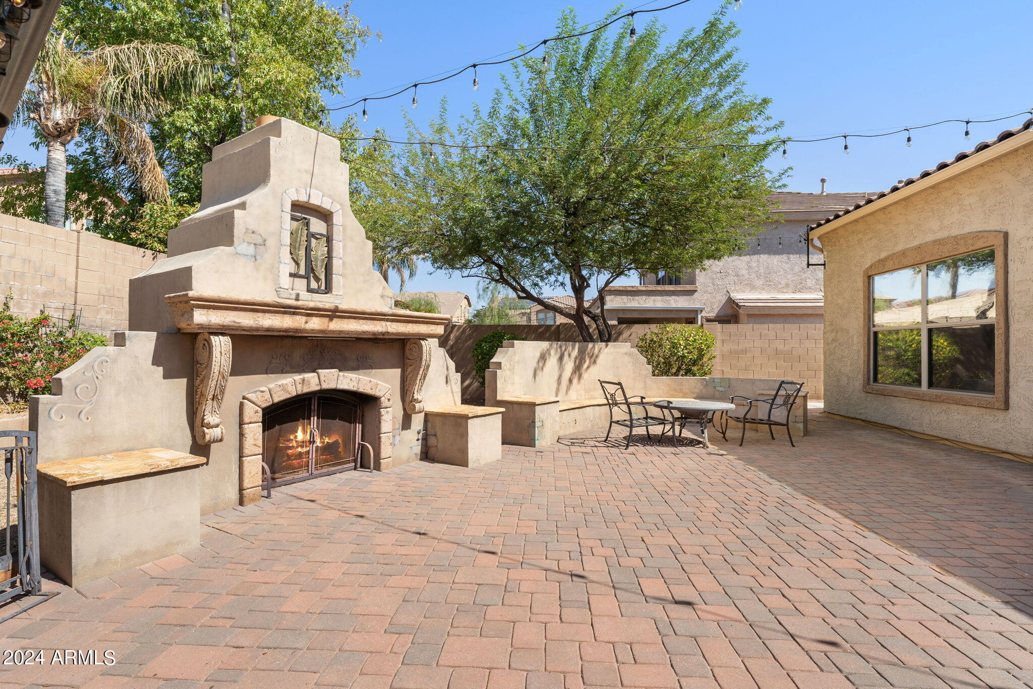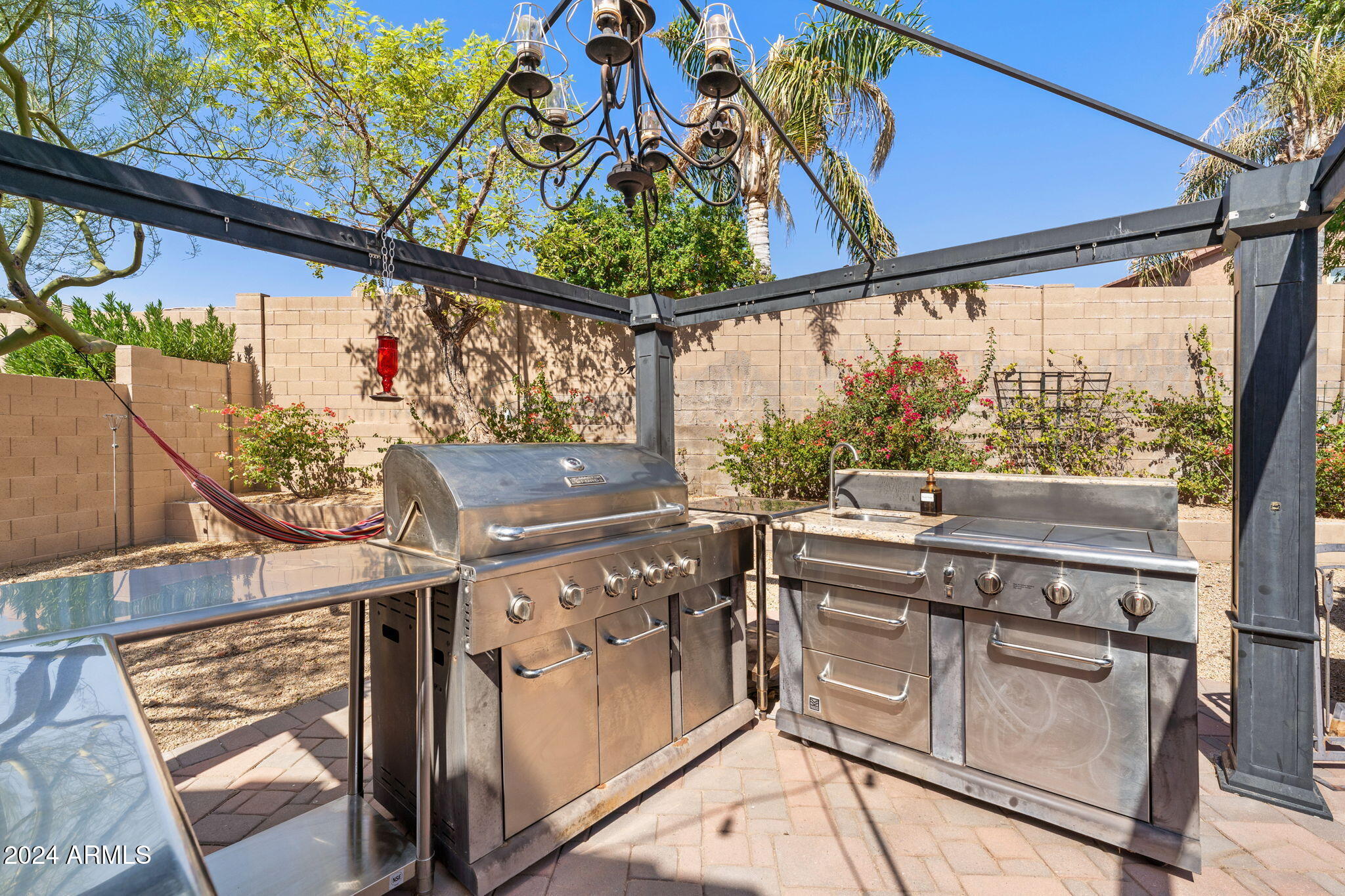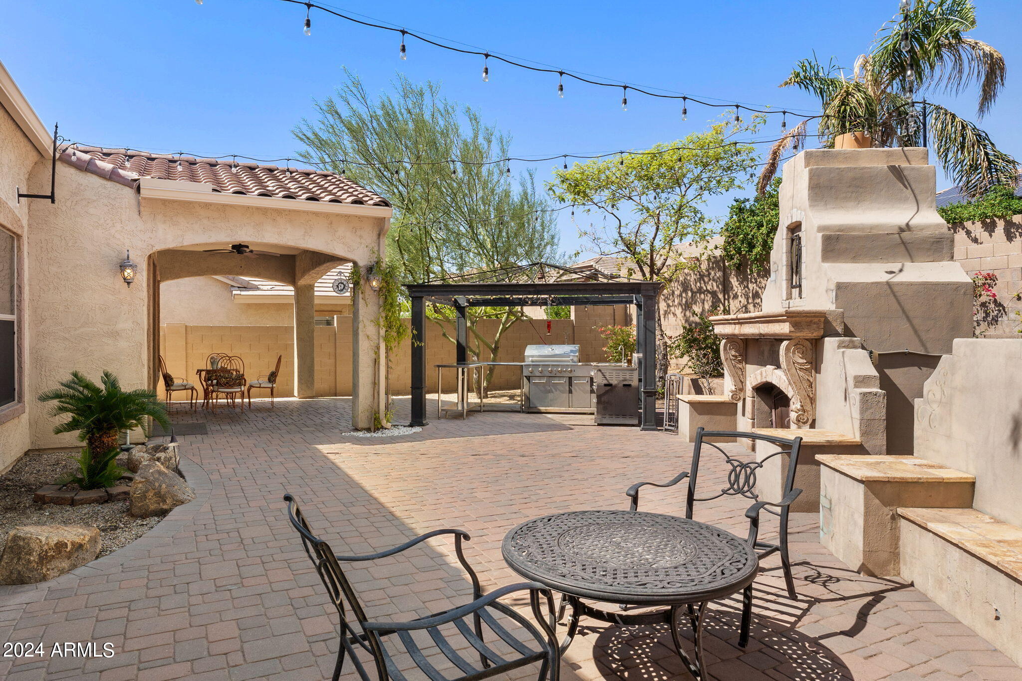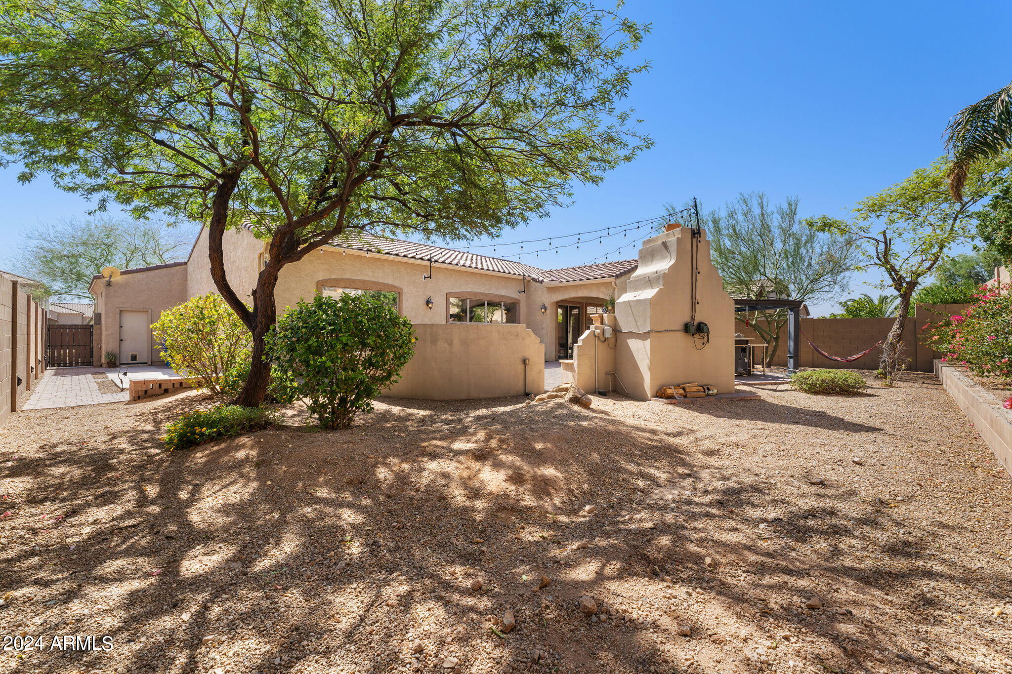 Welcome to this stunning 3-bedroom, 2-bathroom home where modern elegance meets functional living. Step inside to find beautiful tile flooring throughout, a sleek kitchen with granite countertops, and stainless steel appliances that make cooking a joy. The spacious master suite boasts a large walk-in closet, while the second bathroom features double sinks for added convenience. A bonus room off the entryway is perfect for a home office or creative space. Outside, the backyard is an entertainer's dream with a paver patio, gas outdoor fireplace, and a built-in cooking area. Enjoy low-maintenance desert landscaping including a beautiful Taiwan plant, plus an installed alarm system for peace of mind.