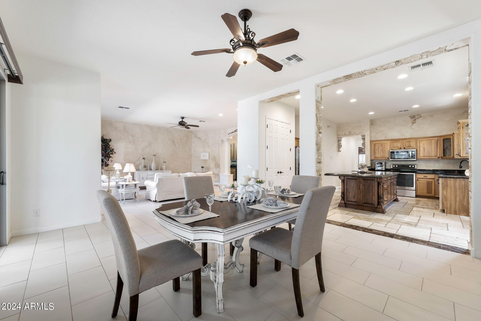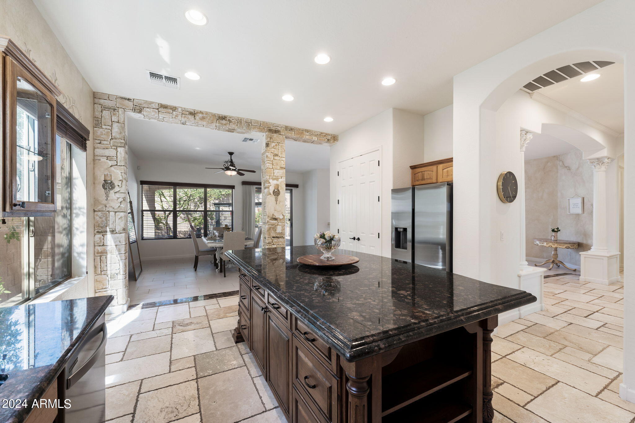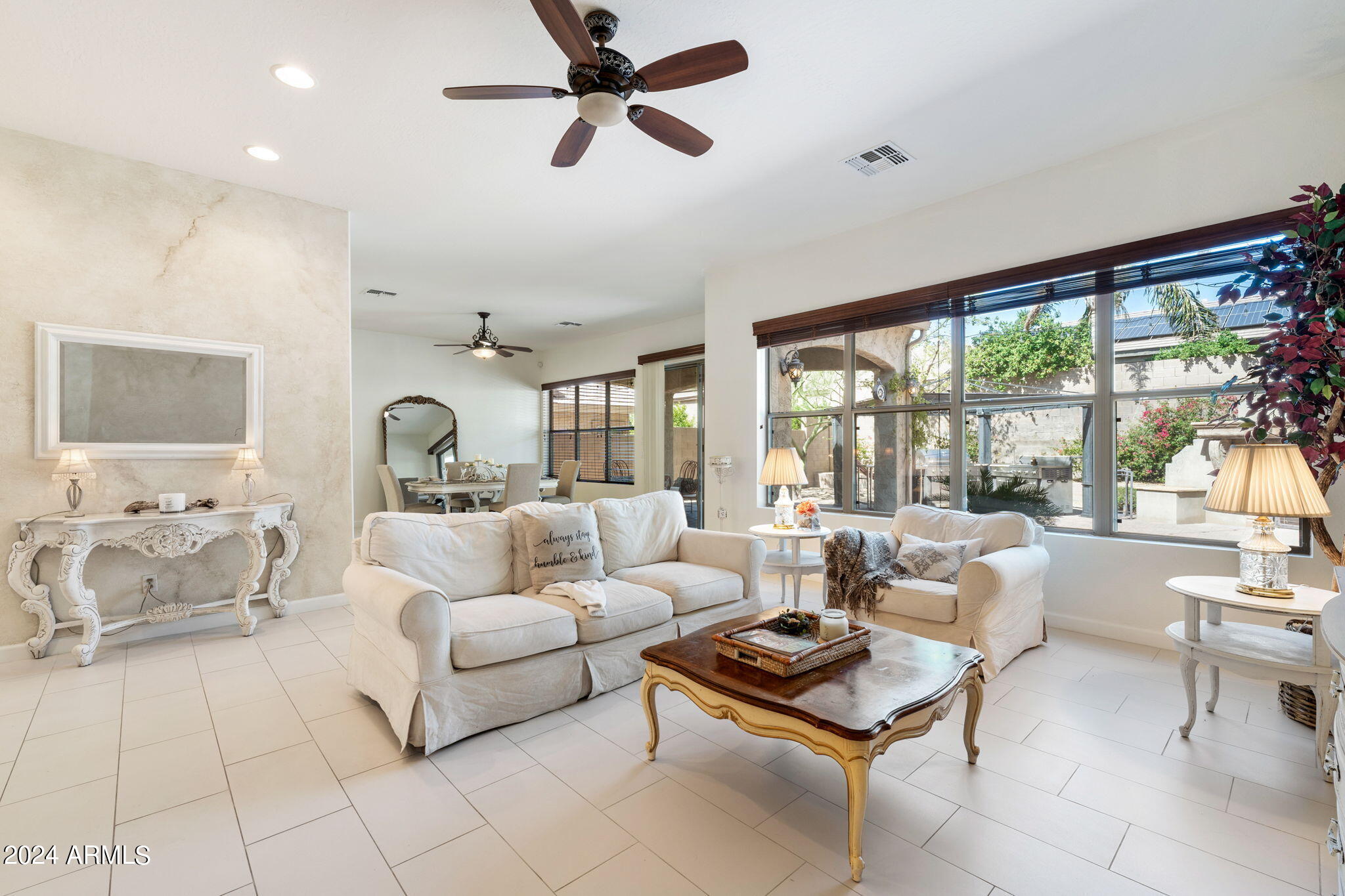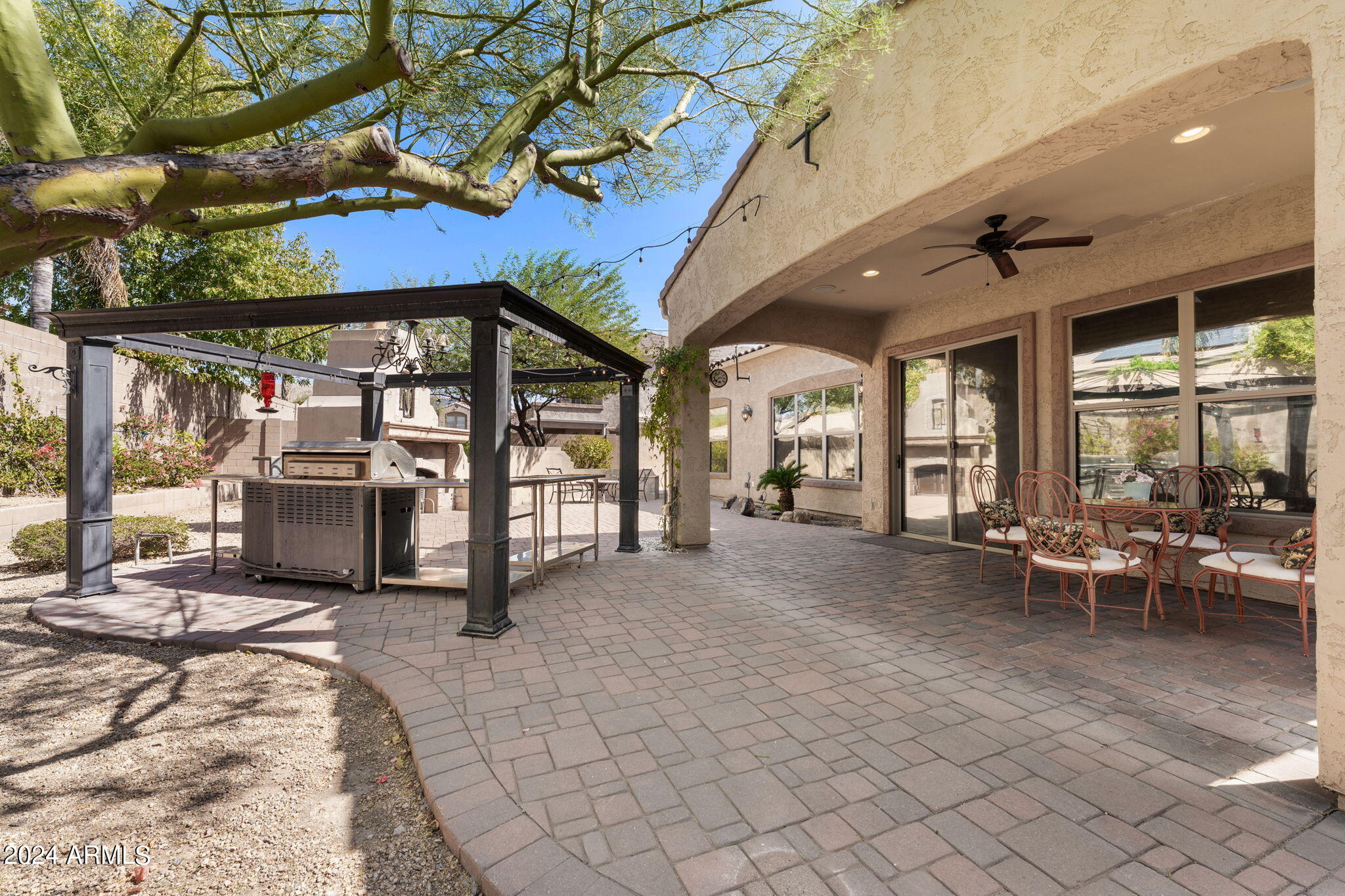 Welcome to this stunning 3-bedroom, 2-bathroom home where modern elegance meets functional living. Step inside to find beautiful tile flooring throughout, a sleek kitchen with granite countertops, and stainless steel appliances that make cooking a joy. The spacious master suite boasts a large walk-in closet, while the second bathroom features double sinks for added convenience. A bonus room off the entryway is perfect for a home office or creative space. Outside, the backyard is an entertainer's dream with a paver patio, gas outdoor fireplace, and a built-in cooking area. Enjoy low-maintenance desert landscaping including a beautiful Taiwan plant, plus an installed alarm system for peace of mind.