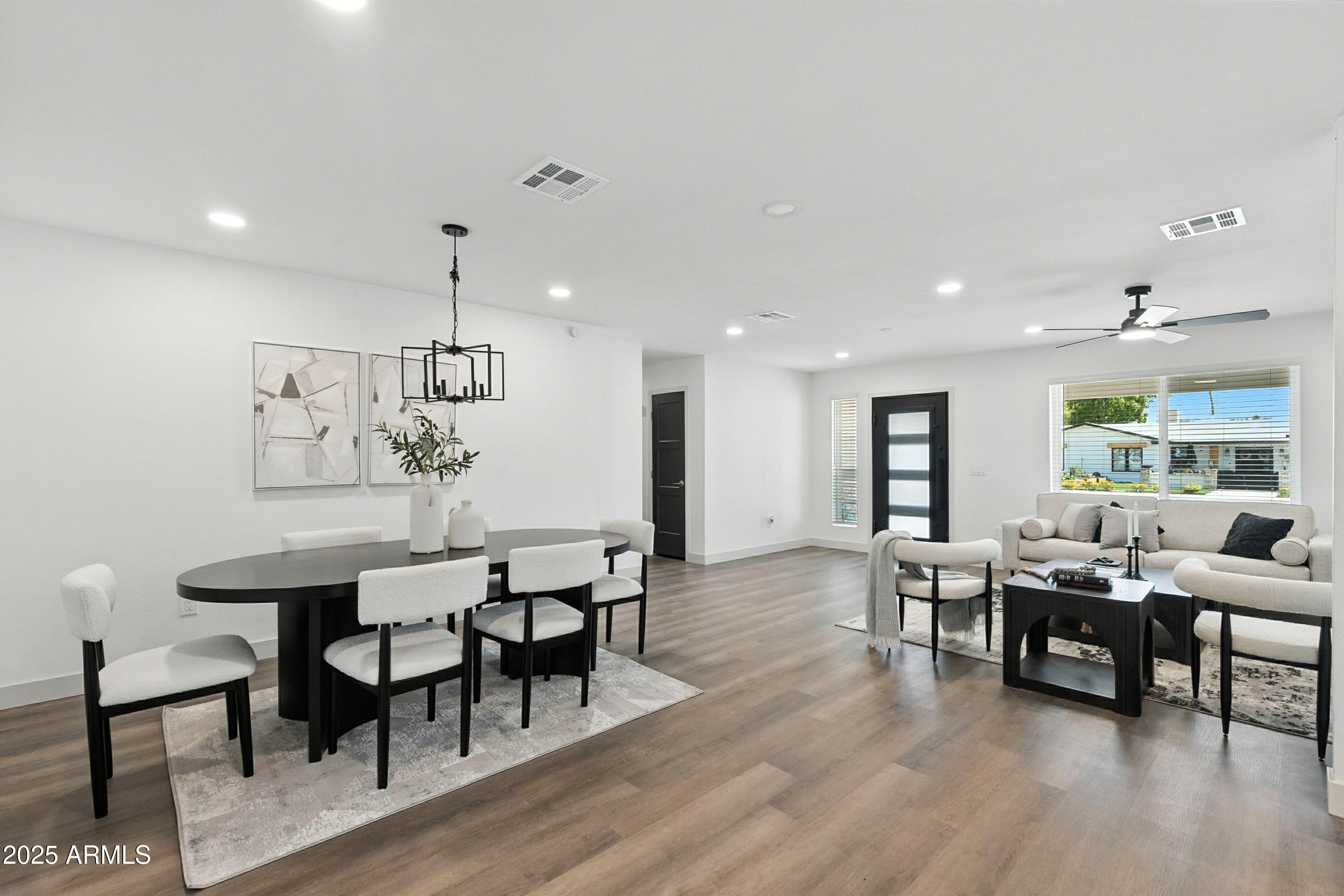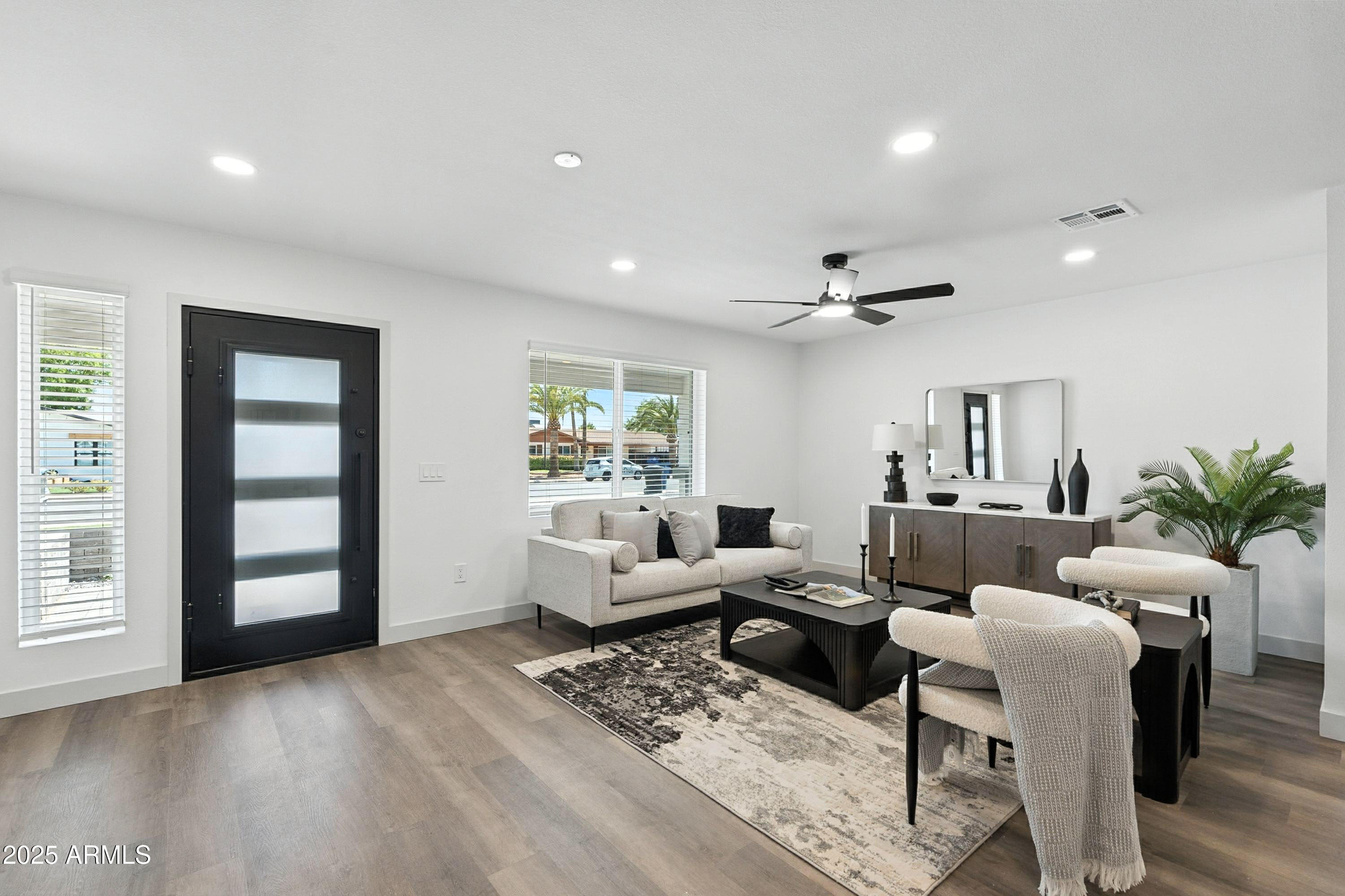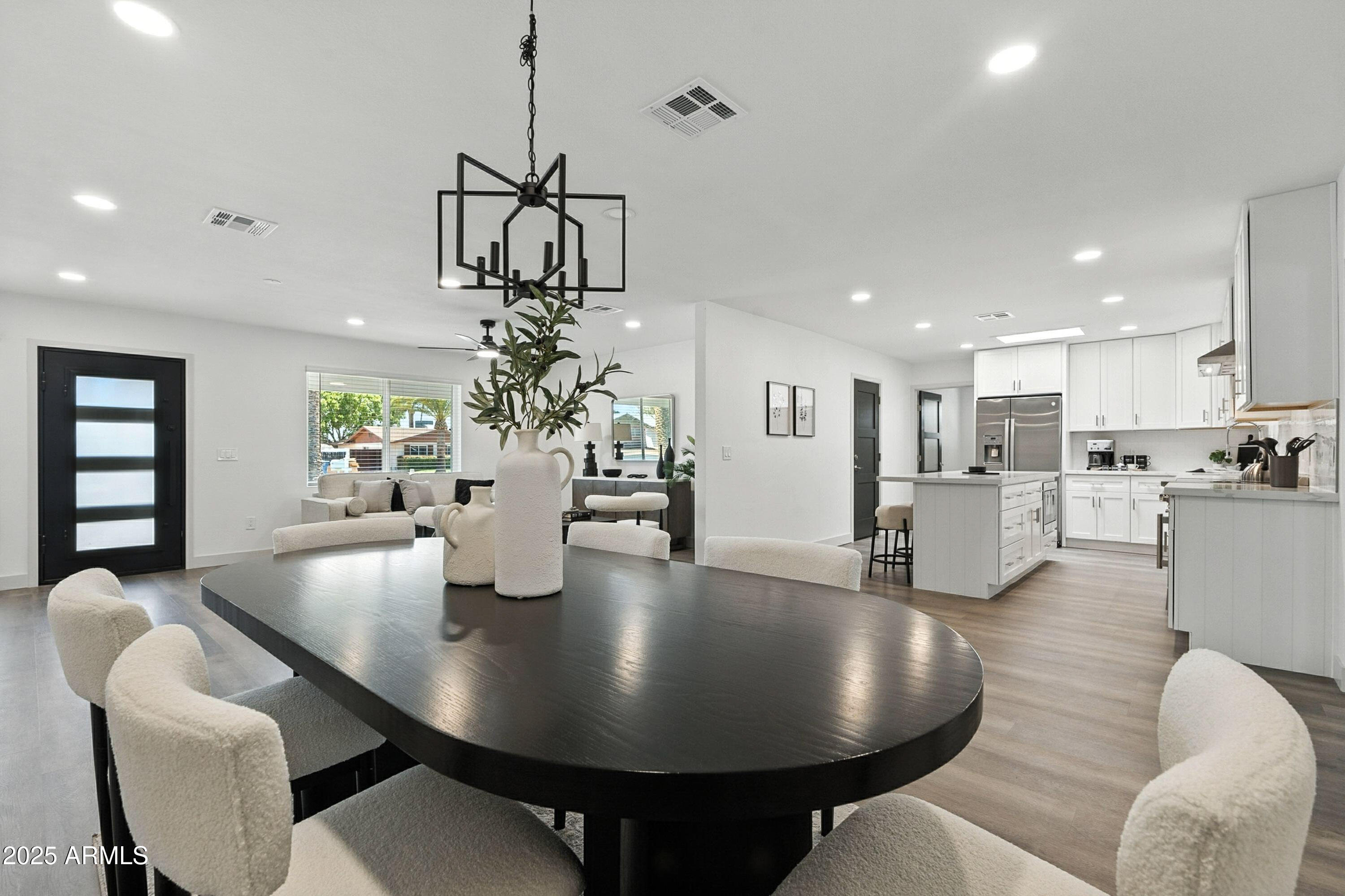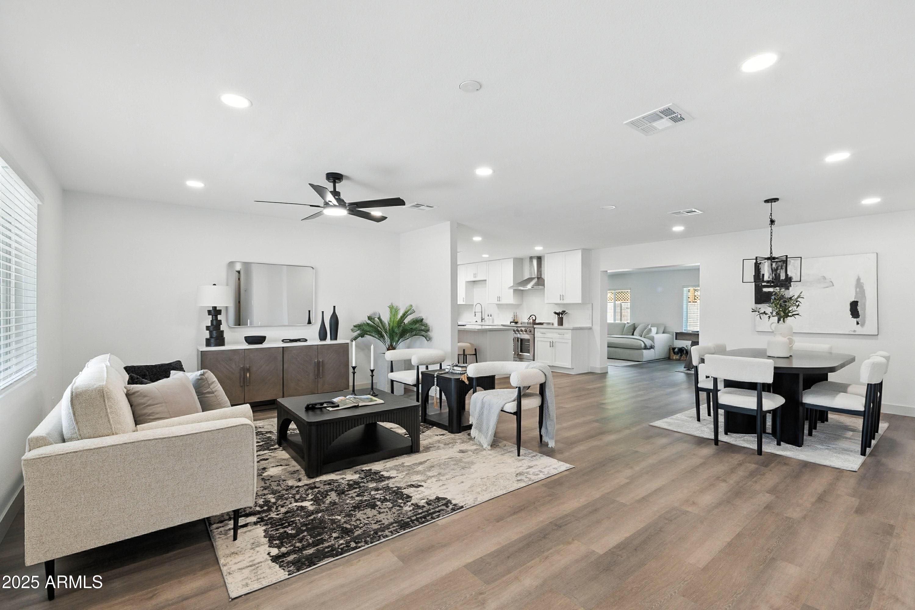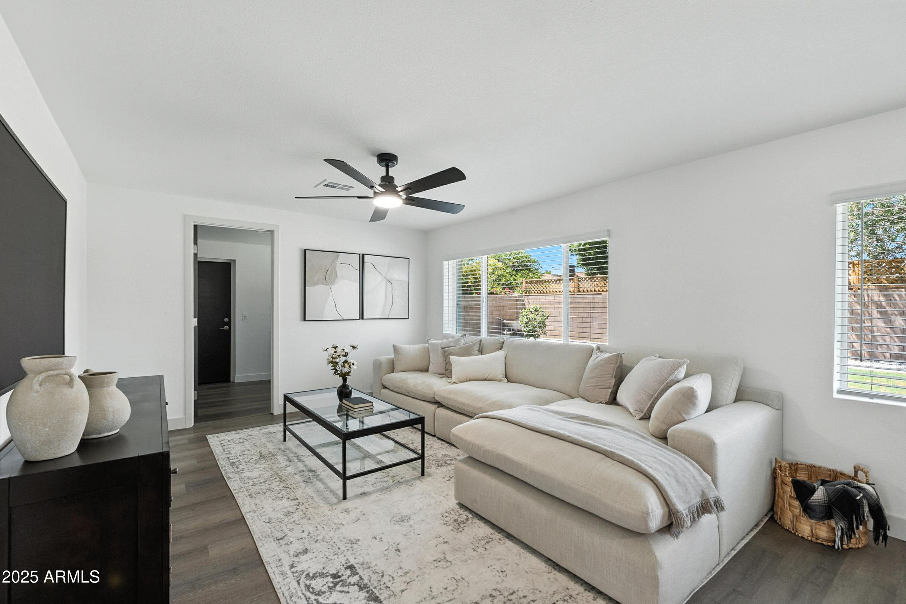 Discover this stunning single-story home featuring 4 spacious bedrooms and 2 modern bathrooms. The open floor plan boasts durable vinyl flooring, a bright kitchen with white cabinets, sleek quartz countertops, stainless steel appliances, and ample storage. Relax on the inviting front porch or entertain on the covered patio overlooking the fenced backyard. A 2-car garage and extended driveway provide plenty of parking and convenience. This home combines style, comfort, and functionality, making it perfect for everyday living and entertaining. Don't miss the chance to make this beautifully designed property your new home!