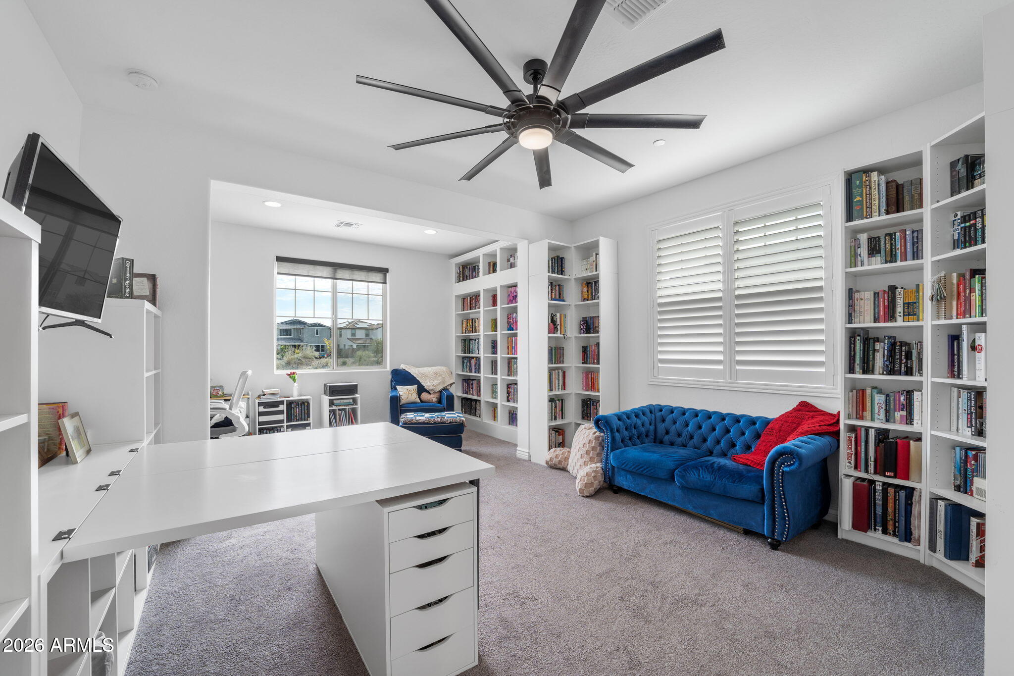 The luxurious primary suite is a private retreat with his-and-hers walk-in closets and a spa-style bath showcasing dual vanities, custom flooring, a soaking tub, and a walk-in rain shower. Upstairs, the staircase leads to a thoughtfully designed second level with a loft, bonus room, additional office area filled with natural light, a tech center, and spacious secondary bedroomsincluding a Jack-and-Jill bathroom and a bedroom with a custom built-in bookshelf.