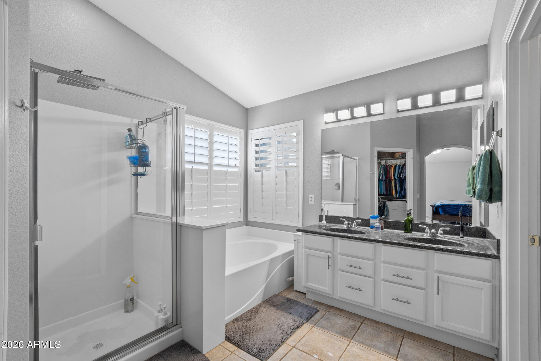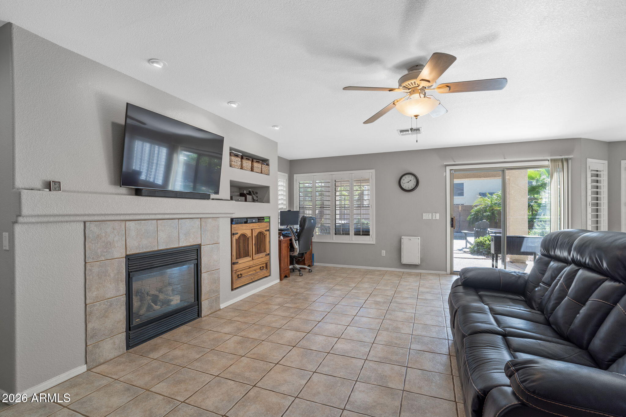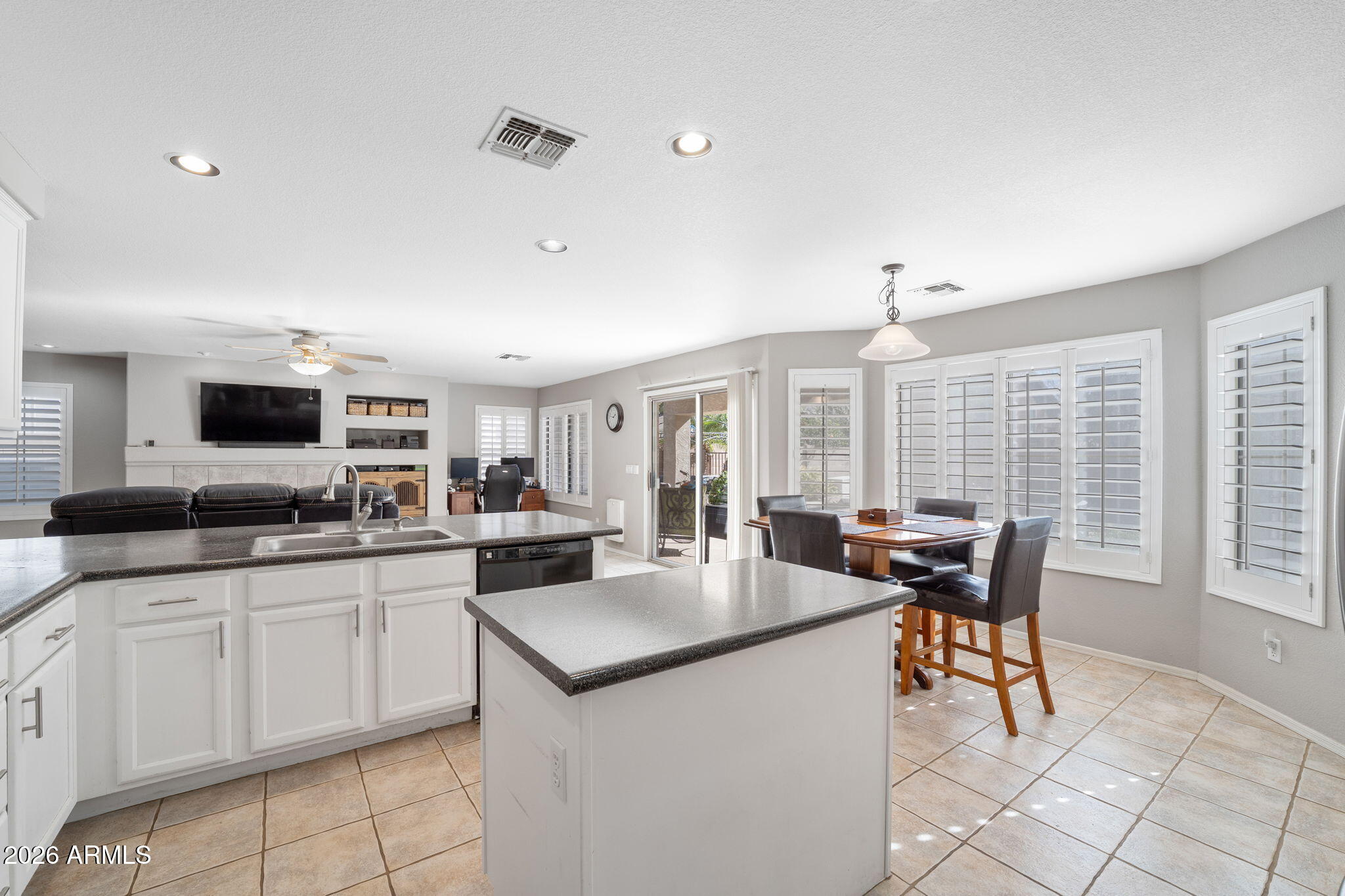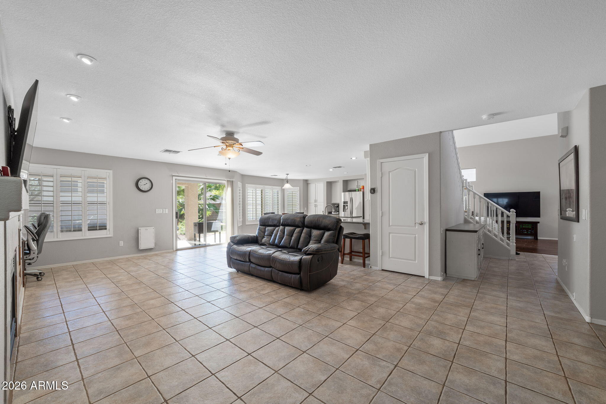 Welcome to Higley Groves, where comfort, space, and convenience come together in this beautiful 4-bedroom, 3-bath home with a 2.5-car garage. Ideally situated near the main park and greenbelt, this home is also within walking distance to an elementary school and just minutes from shopping, dining, and easy access to the US-60. Inside, you'll find a functional and inviting layout featuring plank tile and tile flooring throughout the main living areas, with carpet upstairs for added comfort. Shutter blinds enhance every room, and the fireplace creates a cozy focal point in the living space. The eat-in kitchen offers plenty of room for gathering and everyday meals. The spacious primary suite includes a spa tub and separate walk-in shower, creating a relaxing retreat. Additional highlights include a dog door, garage storage cabinets, and covered patios in both the front and backperfect for enjoying Arizona living year-round.