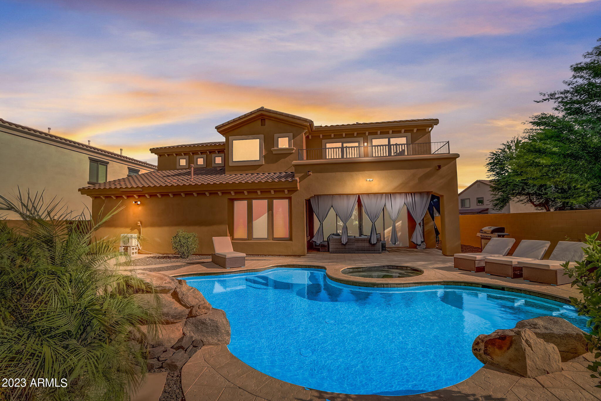 Welcome to Arizona living at its finest! This spacious TW Lewis home in Power Ranch's master-planned community offers a world of luxury. Recently updated with fresh paint, hardwood floors, and a stunning fireplace, this home is both cozy and elegant. Downstairs, you'll find a bedroom, bathroom, and office space, along with a formal dining area, a great room, and a gourmet kitchen featuring new appliances. Upstairs boasts four bedrooms and three and a half baths, including a lavish master suite with a private balcony. There's no shortage of space or comfort here, and even a bonus room for your needs. The backyard is a desert oasis with a private pool, spa, and beautiful landscaping. Located in a quiet cul-de-sac, this home offers a serene and private setting, and the Power Ranch community provides a host of amenities and is part of an award-winning school district. Don't miss this opportunity to live the Arizona dream with low HOA fees and an array of nearby dining and shopping options!