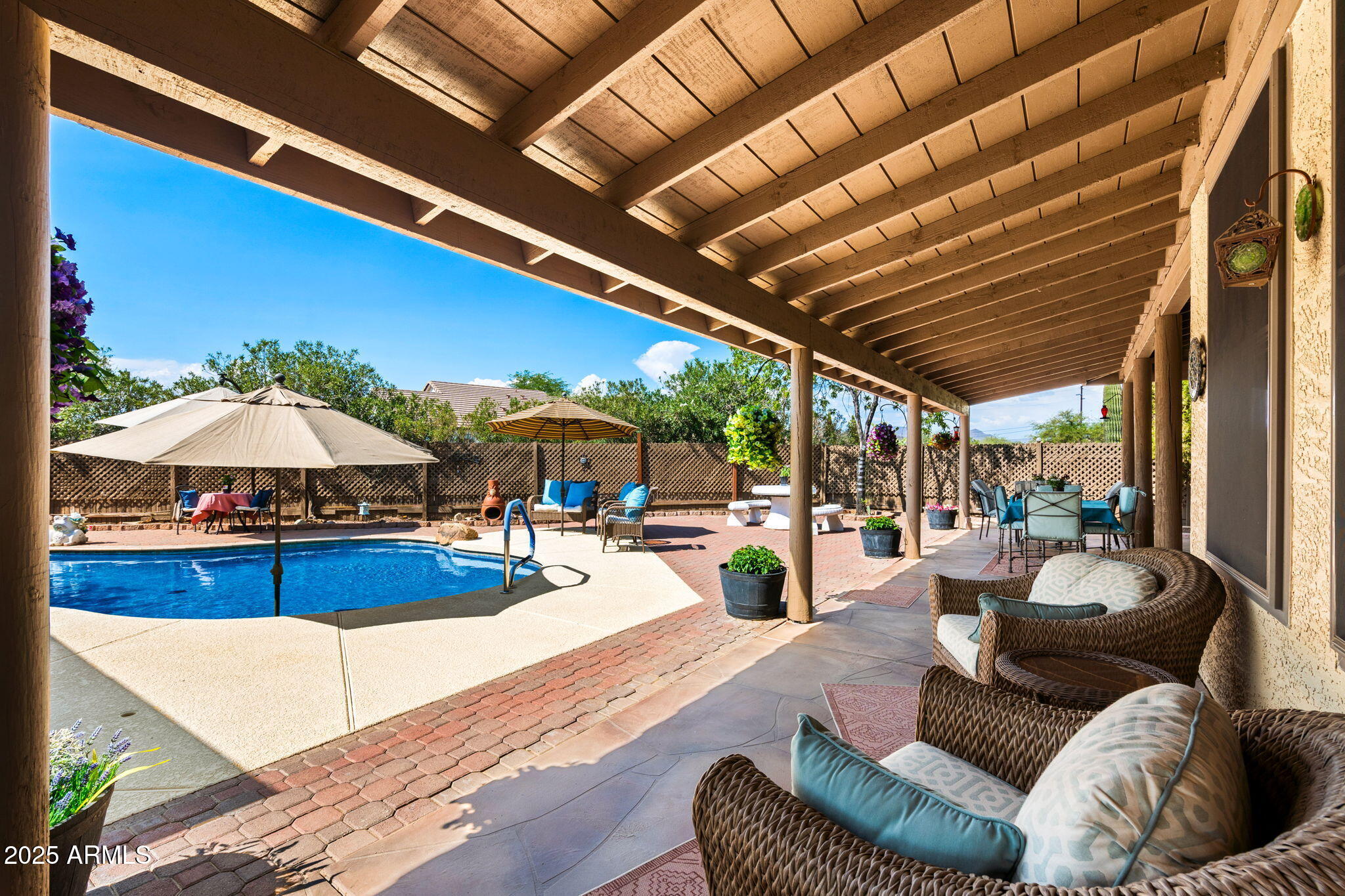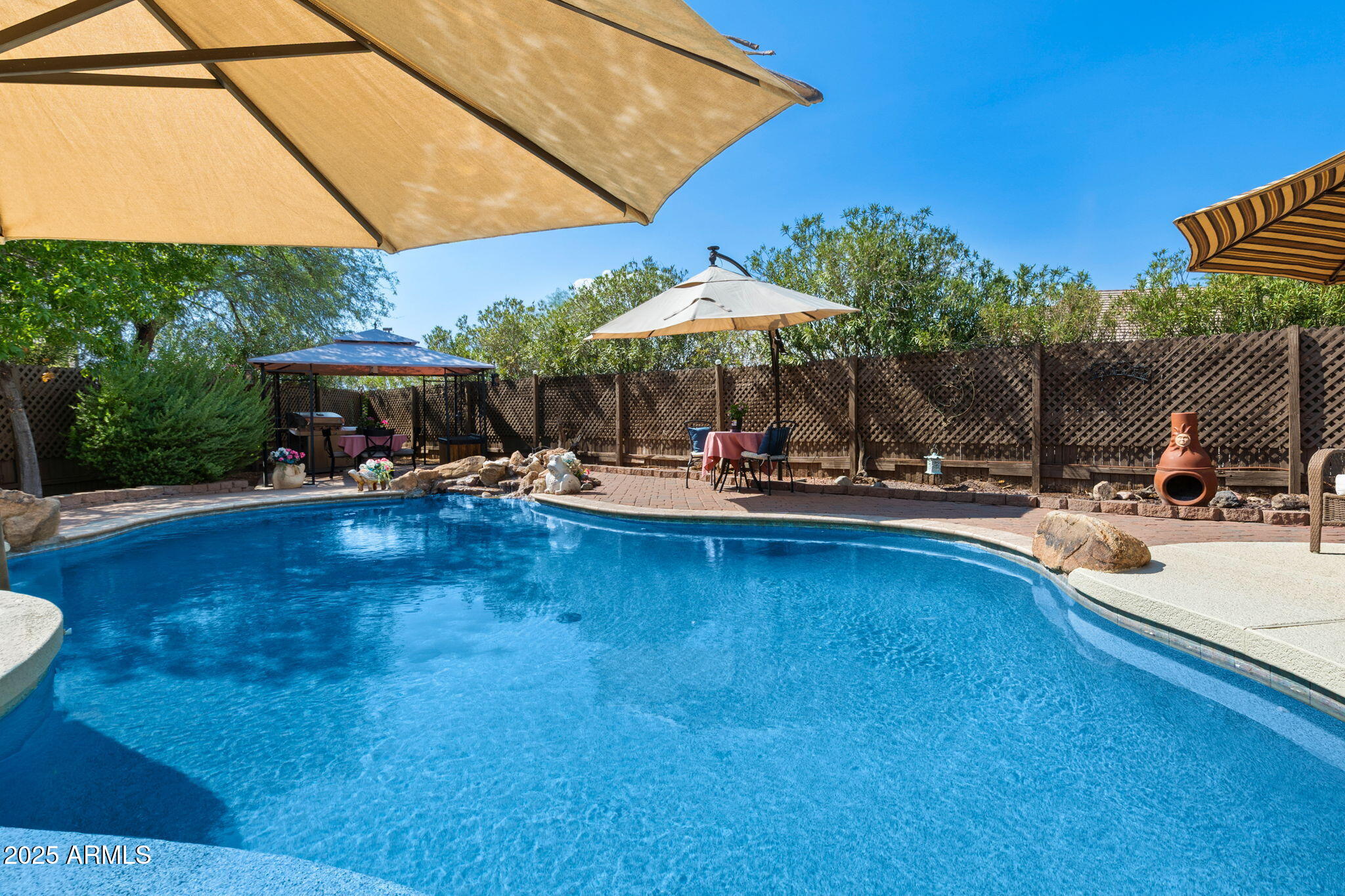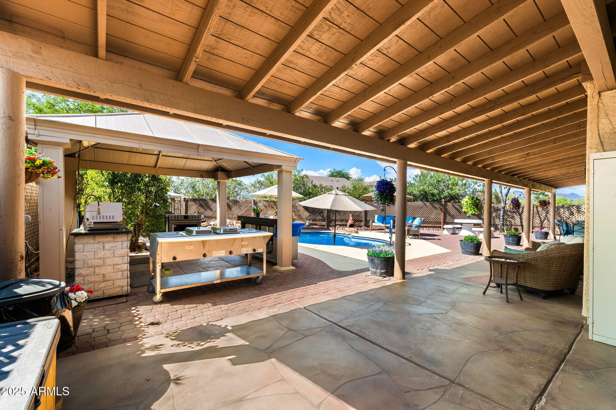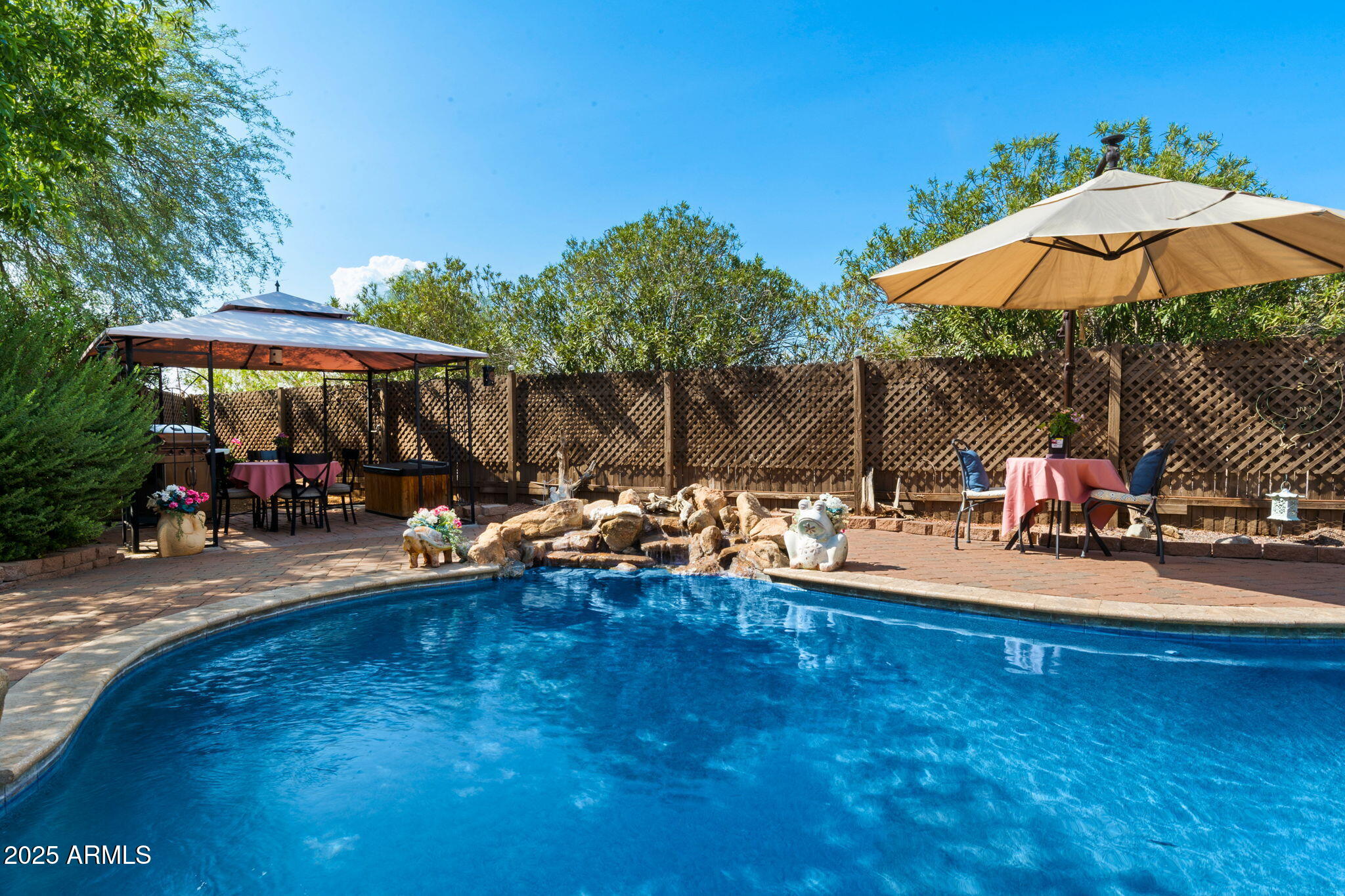 Step outside and discover what truly sets this property apart. The sparkling 5-foot deep pool with a waterfall feature invites you to relax under the Arizona sun, while the extended canopy patio and outdoor cooking area (with gas grill, steam table, and stove) make hosting effortless. For hobbyists, travelers, or car enthusiasts, the detached garage with upgraded 400-amp power can house up to 5-6 cars when empty and includes RV shelter with 3 hookups.