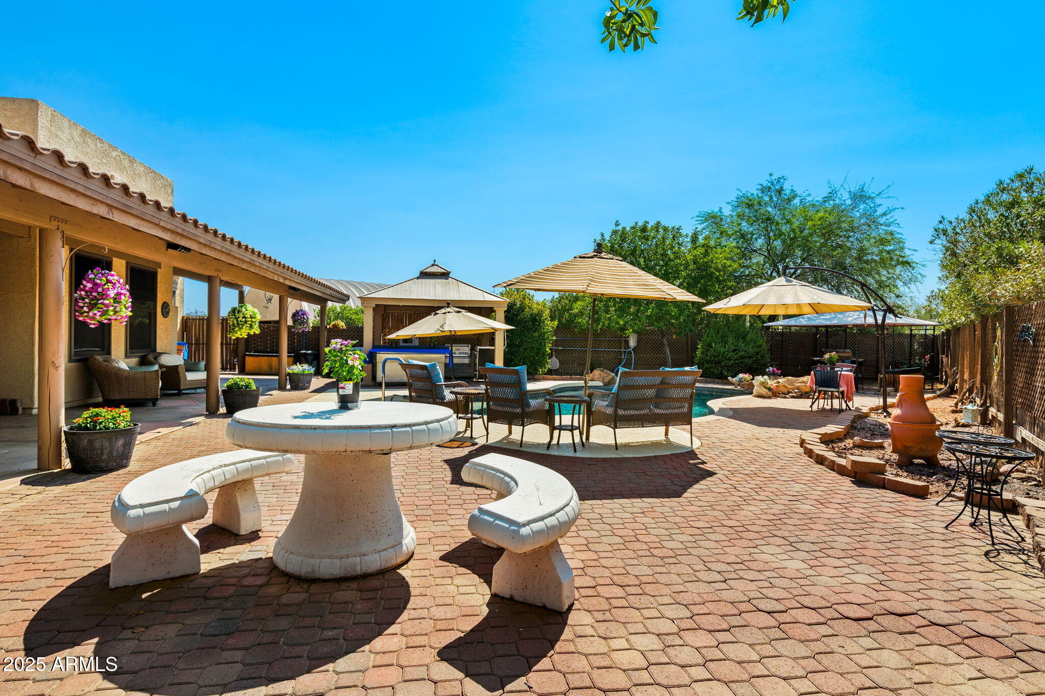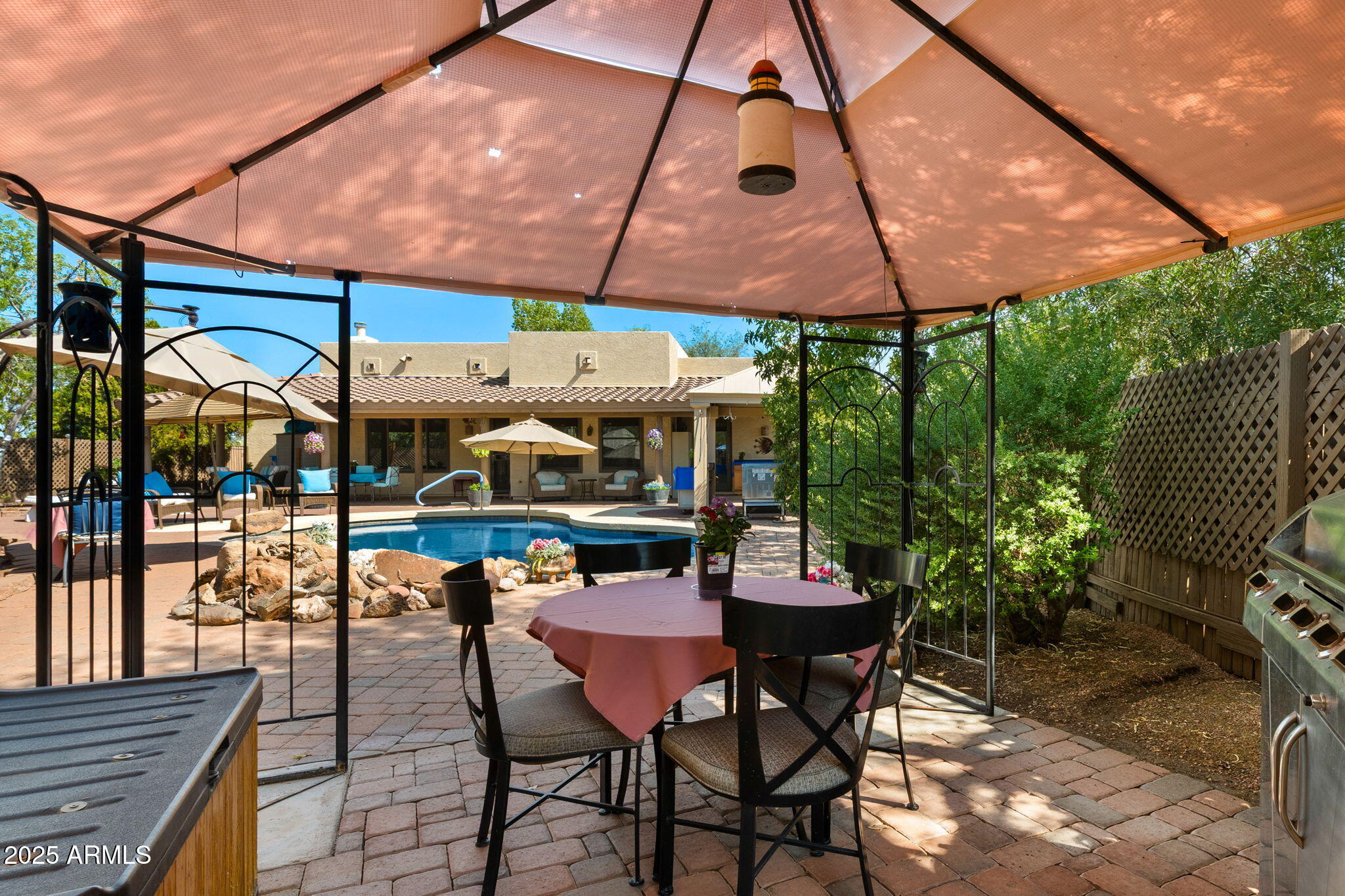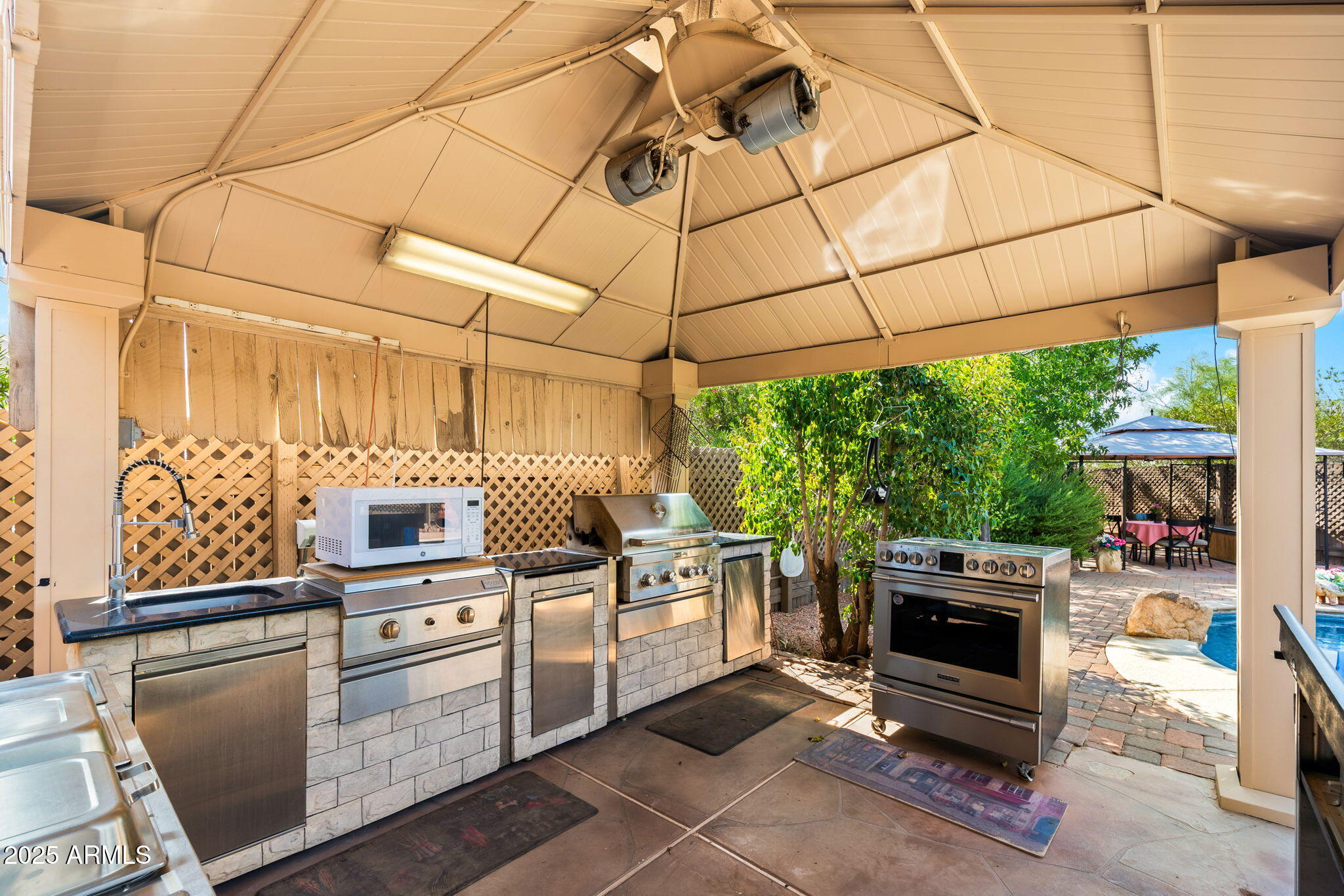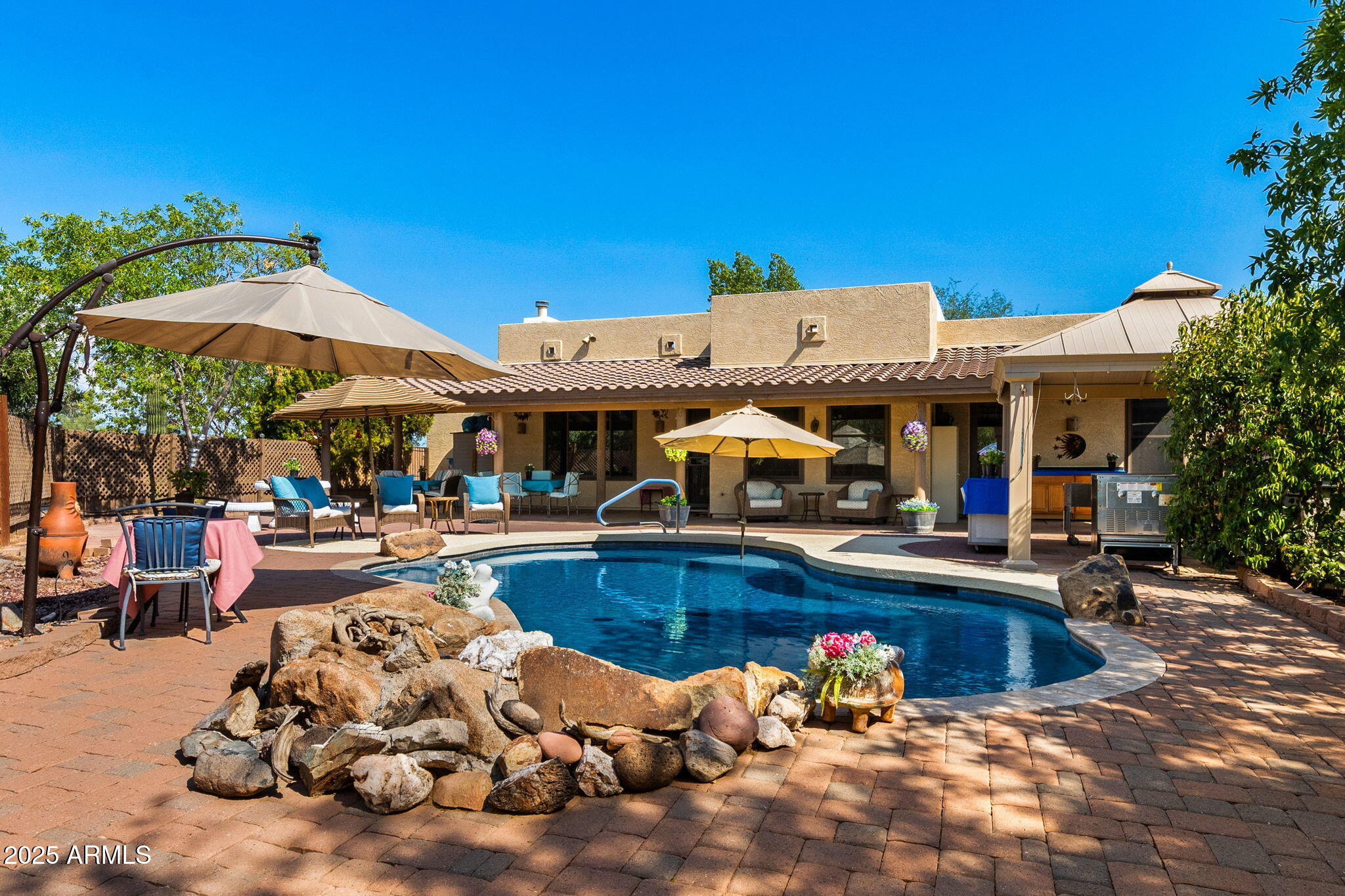 Step outside and discover what truly sets this property apart. The sparkling 5-foot deep pool with a waterfall feature invites you to relax under the Arizona sun, while the extended canopy patio and outdoor cooking area (with gas grill, steam table, and stove) make hosting effortless. For hobbyists, travelers, or car enthusiasts, the detached garage with upgraded 400-amp power can house up to 5-6 cars when empty and includes RV shelter with 3 hookups.