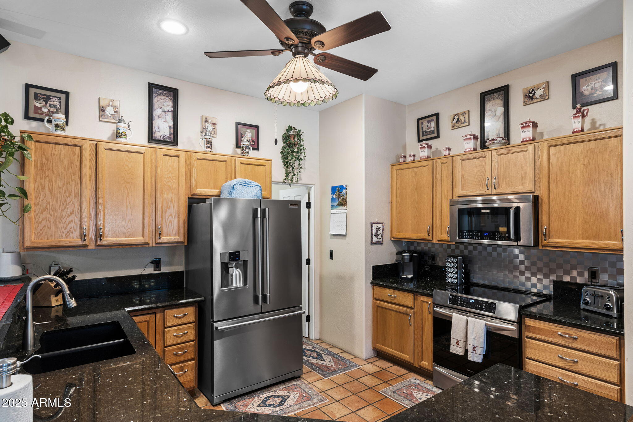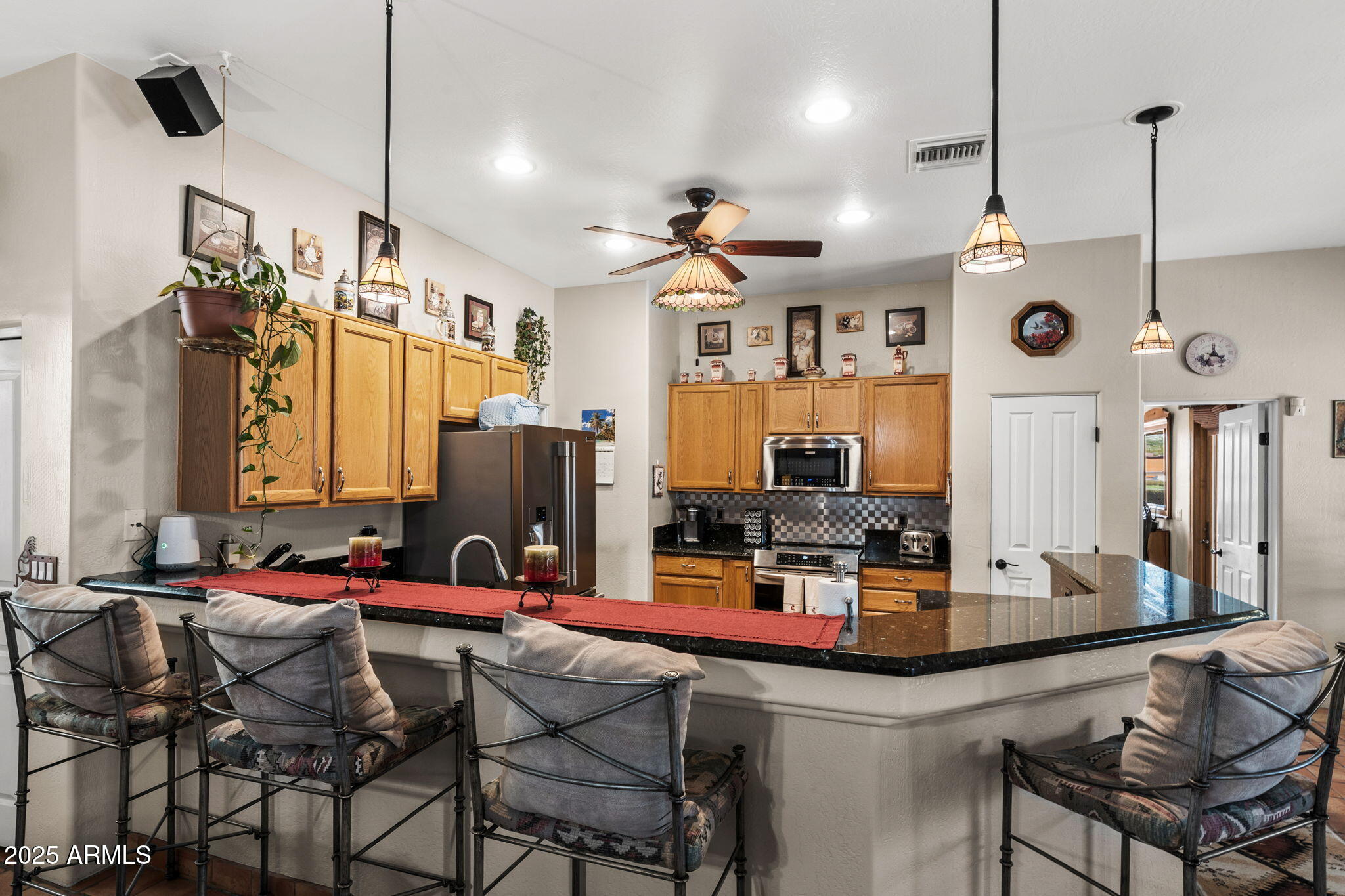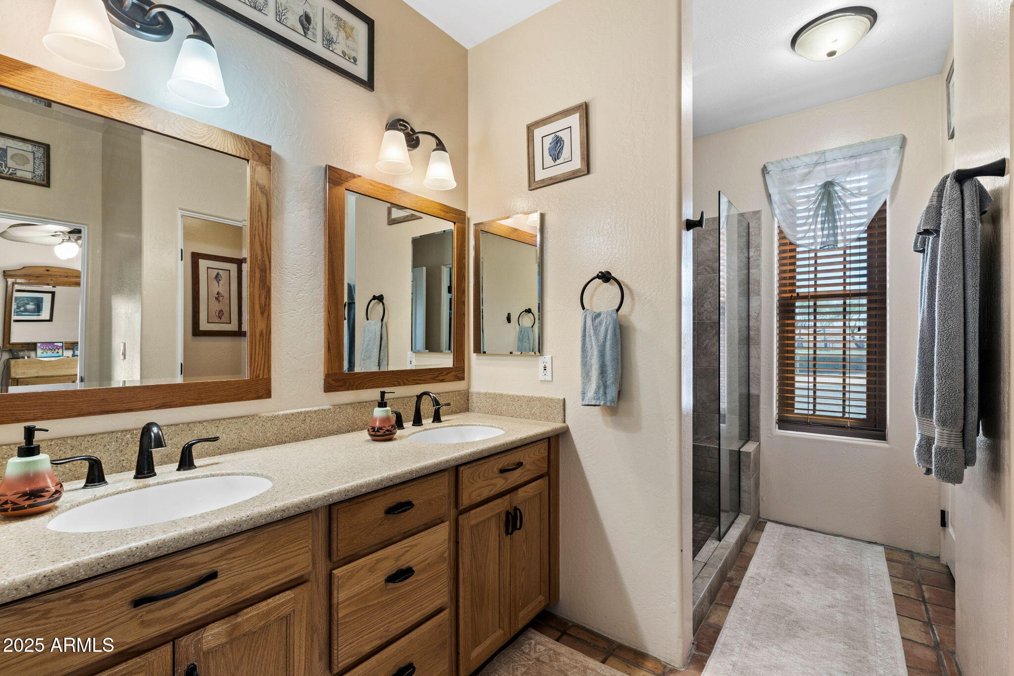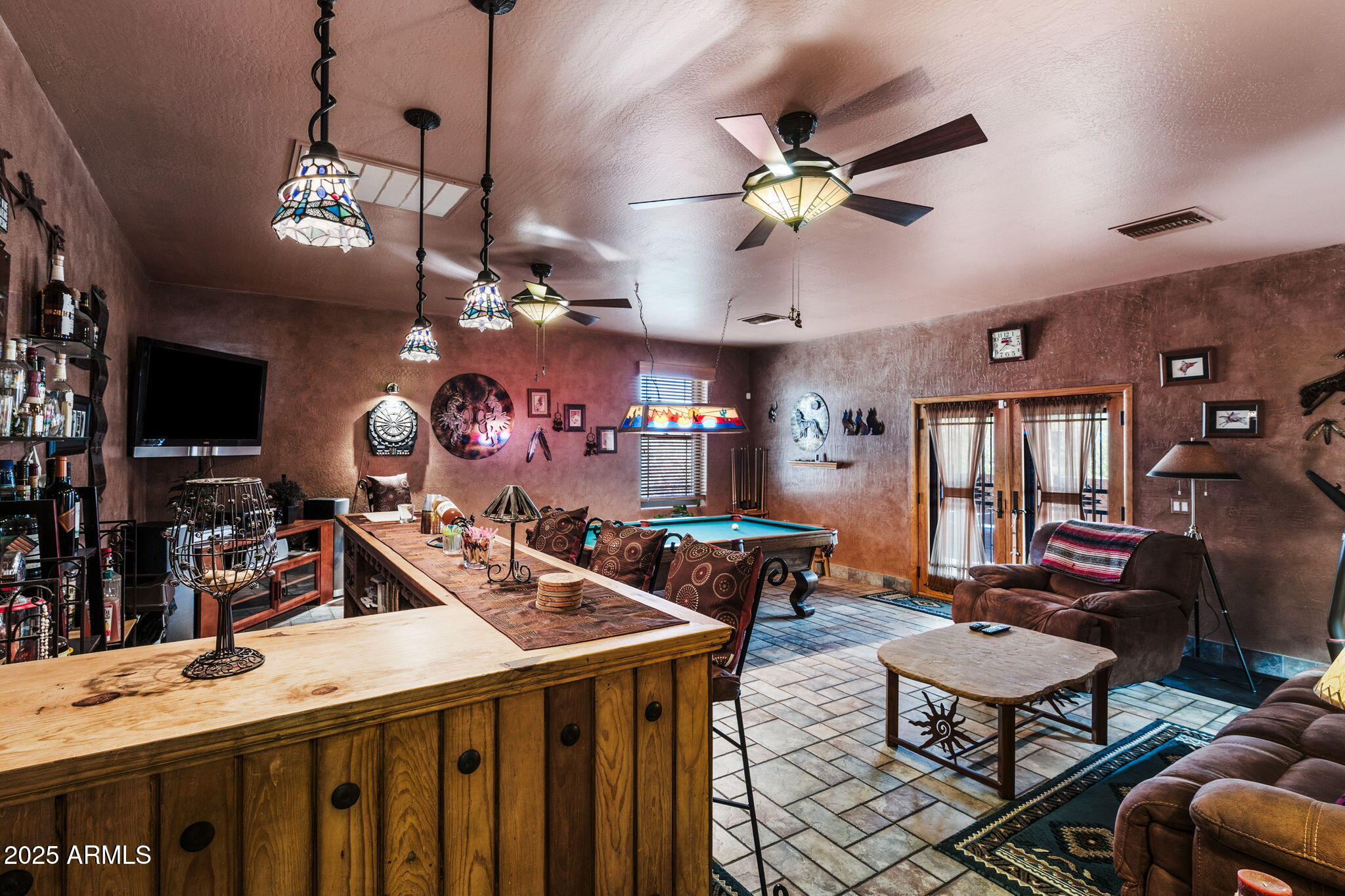 Step outside and discover what truly sets this property apart. The sparkling 5-foot deep pool with a waterfall feature invites you to relax under the Arizona sun, while the extended canopy patio and outdoor cooking area (with gas grill, steam table, and stove) make hosting effortless. For hobbyists, travelers, or car enthusiasts, the detached garage with upgraded 400-amp power can house up to 5-6 cars when empty and includes RV shelter with 3 hookups.