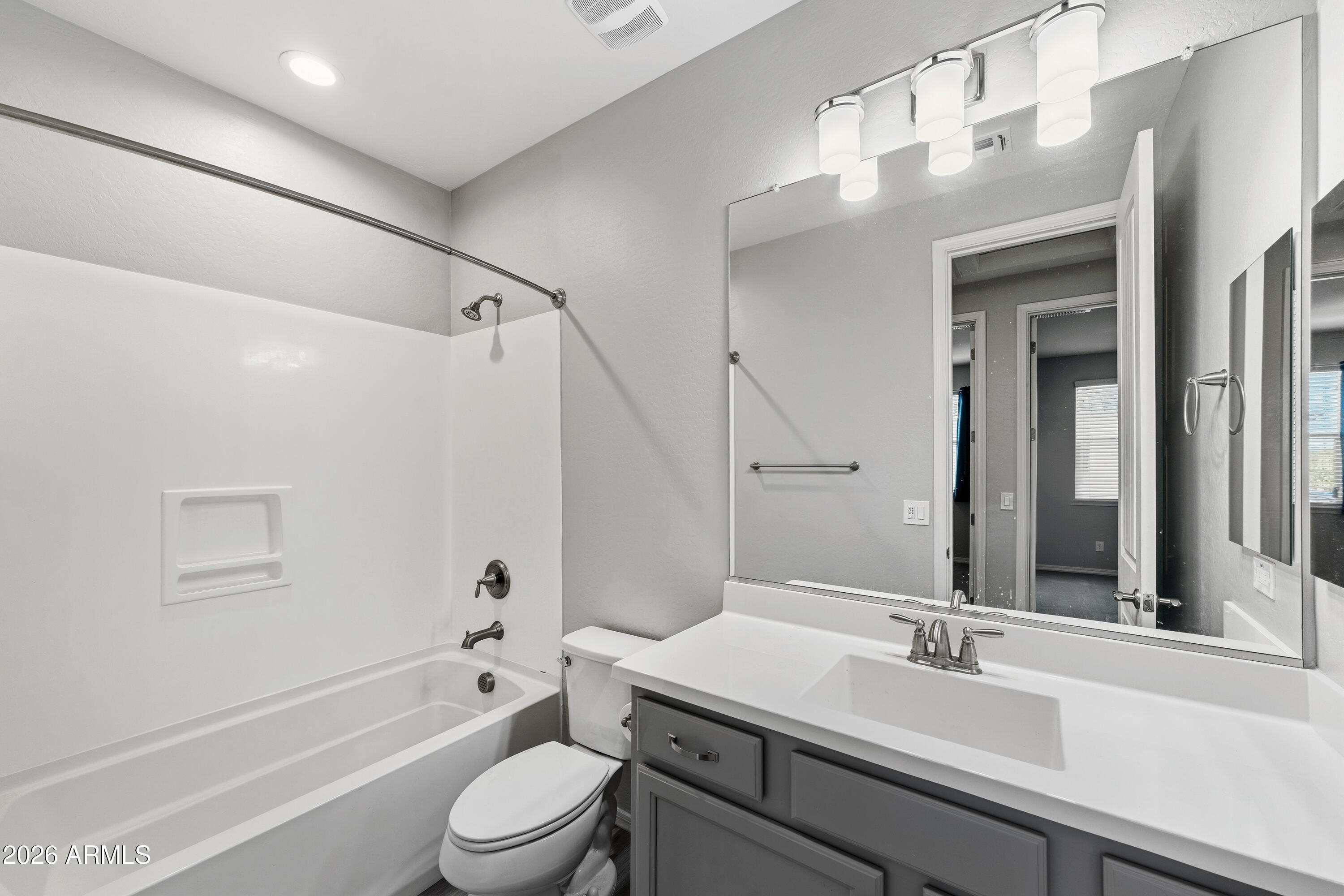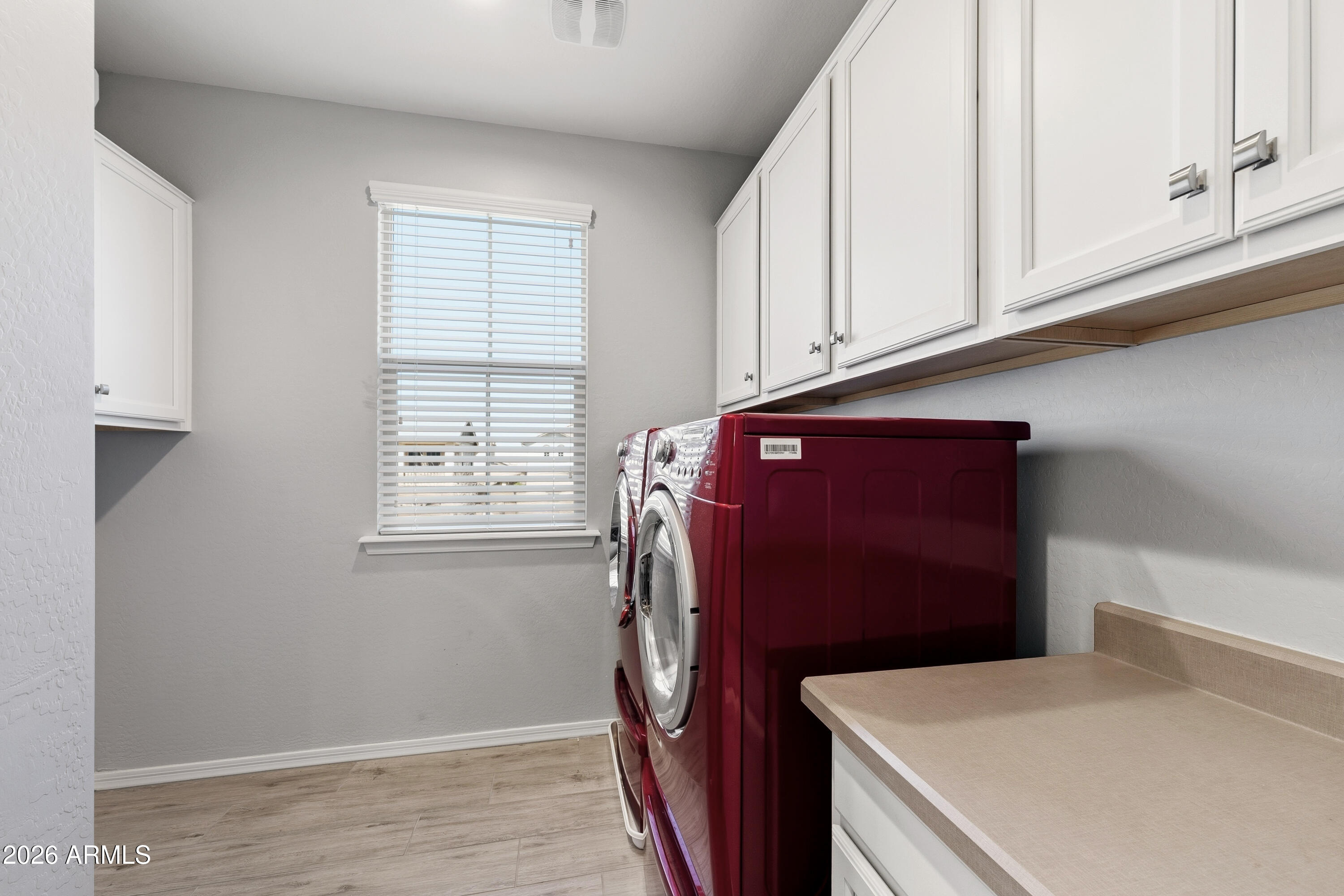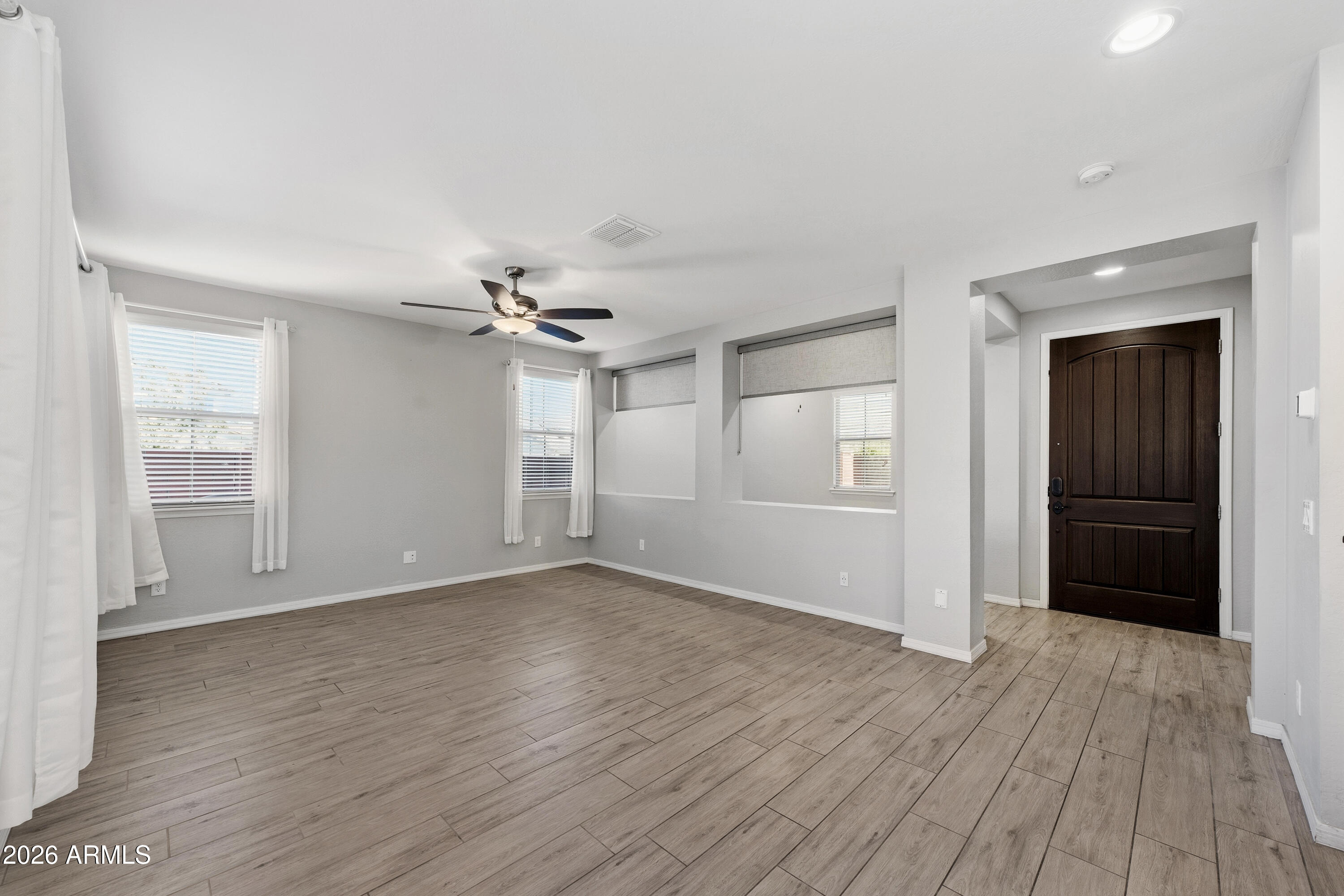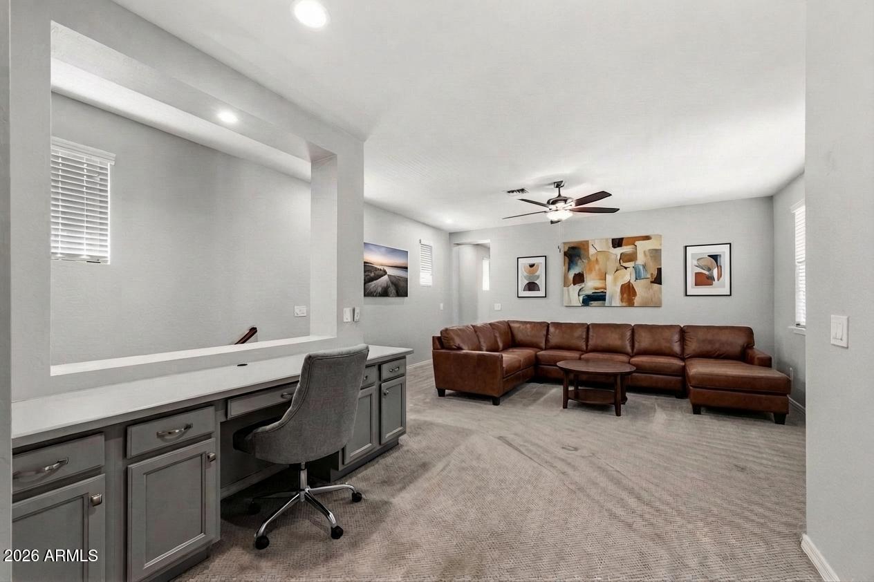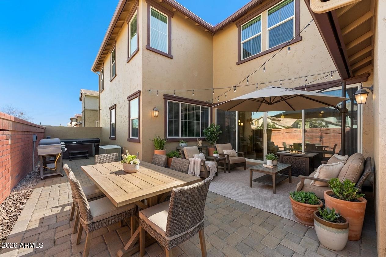 The gourmet kitchen is a true centerpiece, boasting granite countertops, subway tile backsplash, gas range, stainless steel appliances, a pantry, and additional under-stair pantry storage. Large sliders open to the paver backyard patio and concrete pad under the spa, perfect for entertaining. The spa conveys, and the backyard is enclosed by a 6-ft patio wall for privacy. Upstairs, the master suite features a balcony, dual vanities, soaker tub, separate shower, and a master closet with custom shelving. A large loft with built-in desk area provides flexible space for an office, playroom, or study.