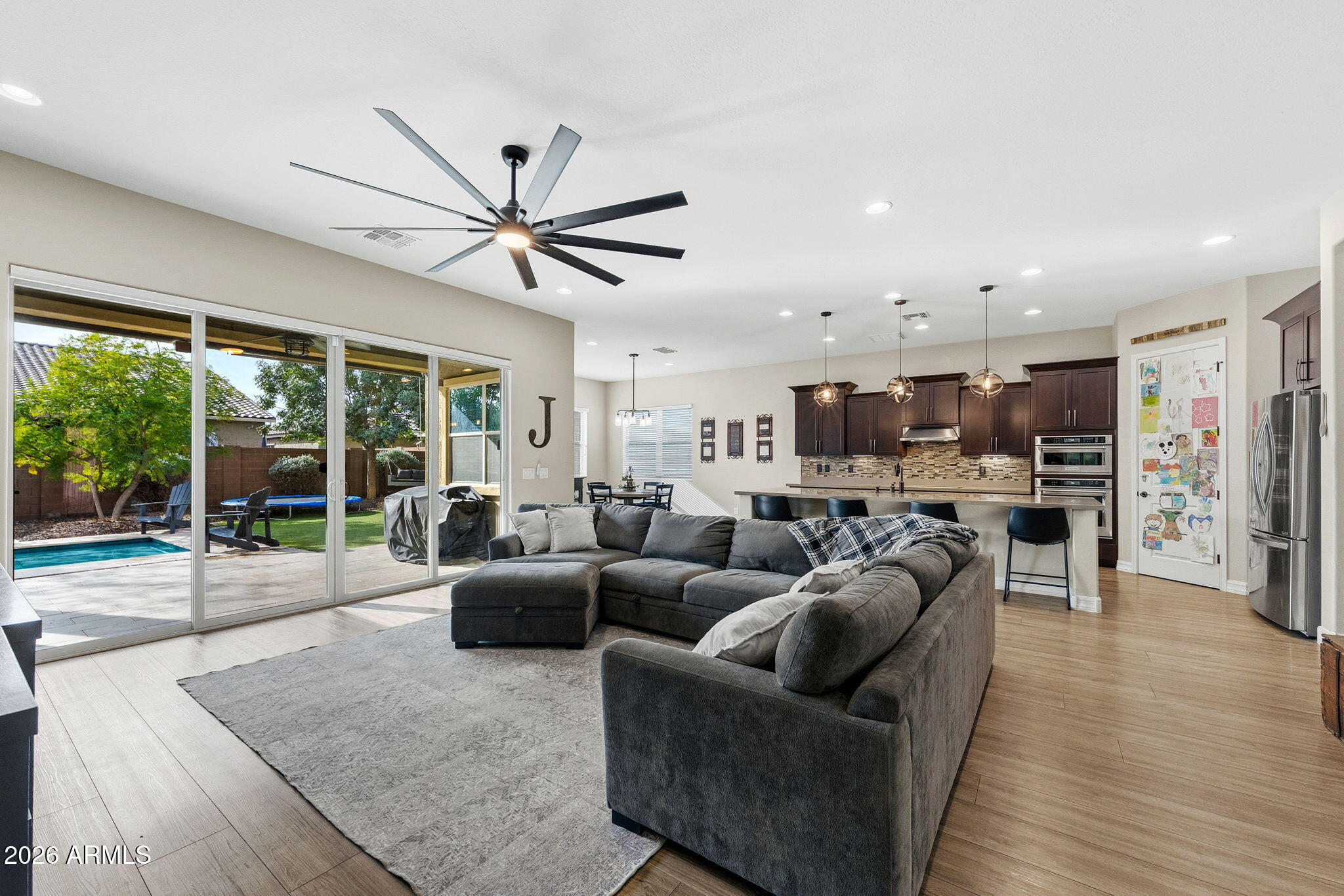 This impeccably maintained, move-in-ready Meritage residence welcomes you through a grand foyer that opens seamlessly into expansive living and dining spaces designed for both everyday elegance and elevated entertaining. At the heart of the home, the chef's kitchen impresses with 42'' staggered, java-stained cherry wood shaker cabinetry, premium stainless-steel KitchenAid appliances, and an effortless flow into the main living areas. Step outside to your private oasis: a thoughtfully designed pool with cascading waterfall and color-changing SMART lighting, all controlled from an app. The space is further enhanced by a UV pool filtration system, travertine patio, turf accents, and a striking outdoor fireplace--creating a true year-round resort experience. A removable pool fence offers peace of mind without compromising aesthetics.
