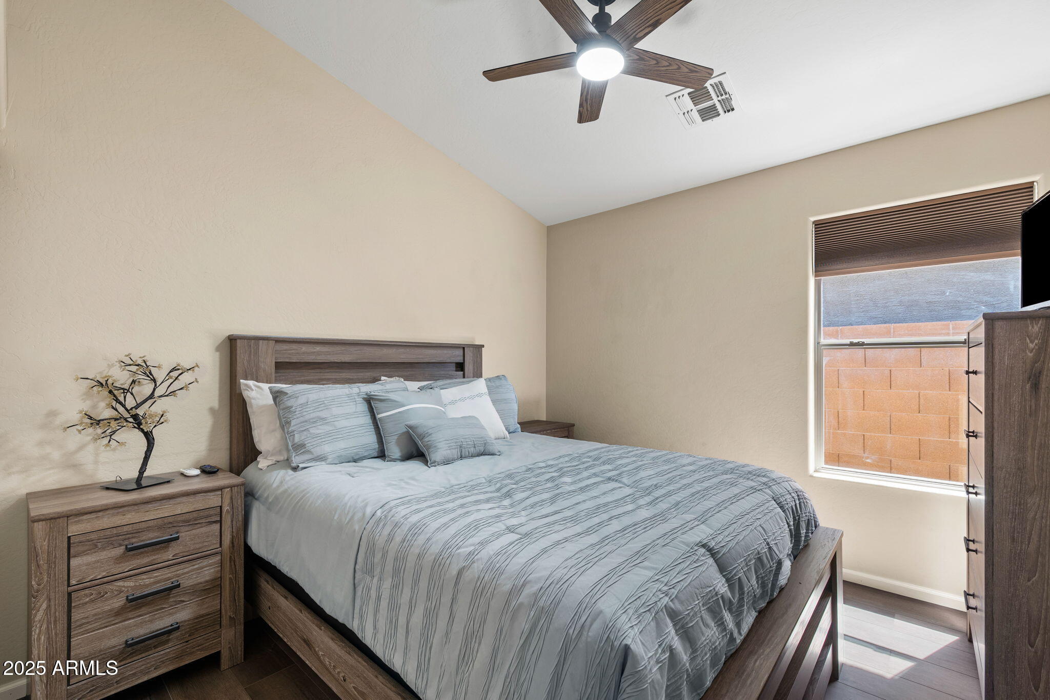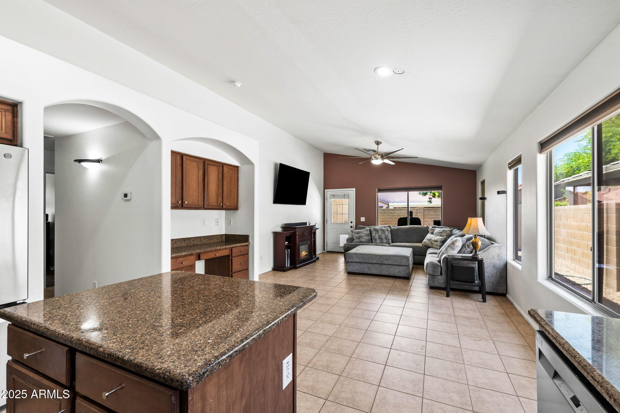Inside, the main living spaces feature sleek tile flooring, while the bedrooms boast brand-new luxury vinyl plank for a seamless, modern look. The gourmet kitchen is a showstopper with granite countertops throughout, matching stainless steel appliances, a built-in desk area, and upgraded LED ceiling fans that elevate both comfort and style. The home's recent upgrades are impressive: a 1-year-old high-efficiency AC system, a 4-year-old water heater, and fully-owned solar panels (loan through Dividend) that generate 40% more power than needed, providing both performance and long-term savings.