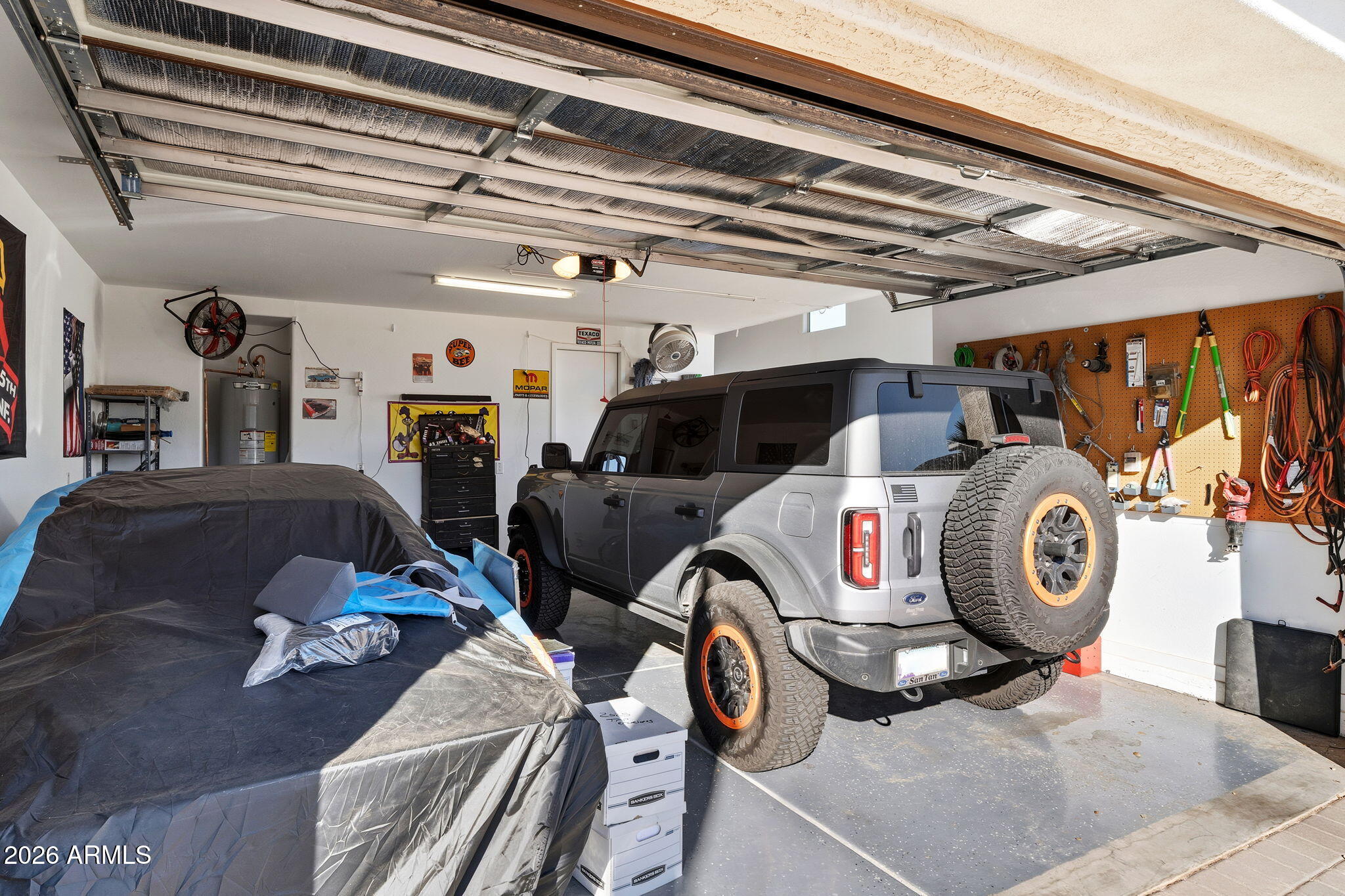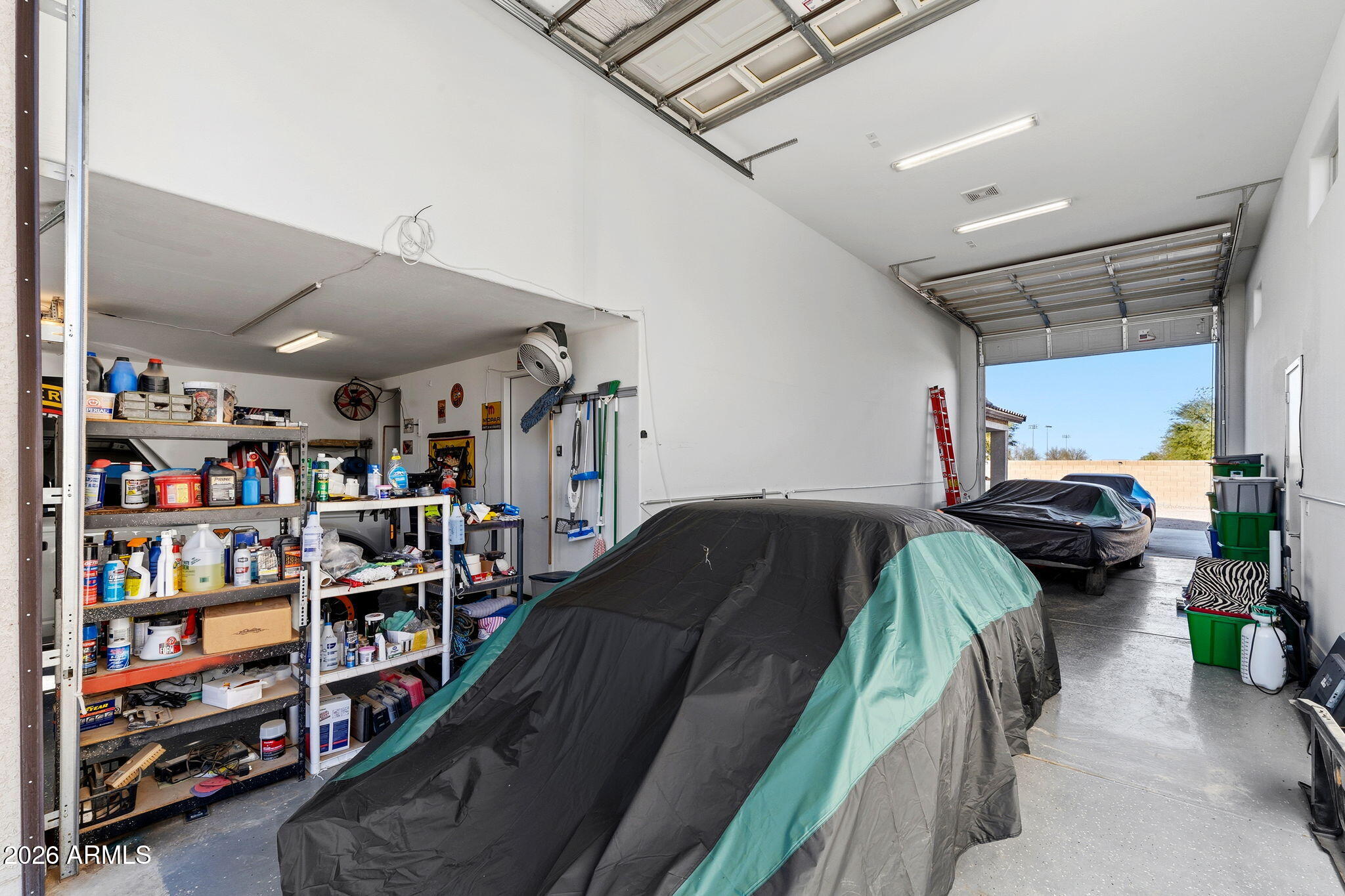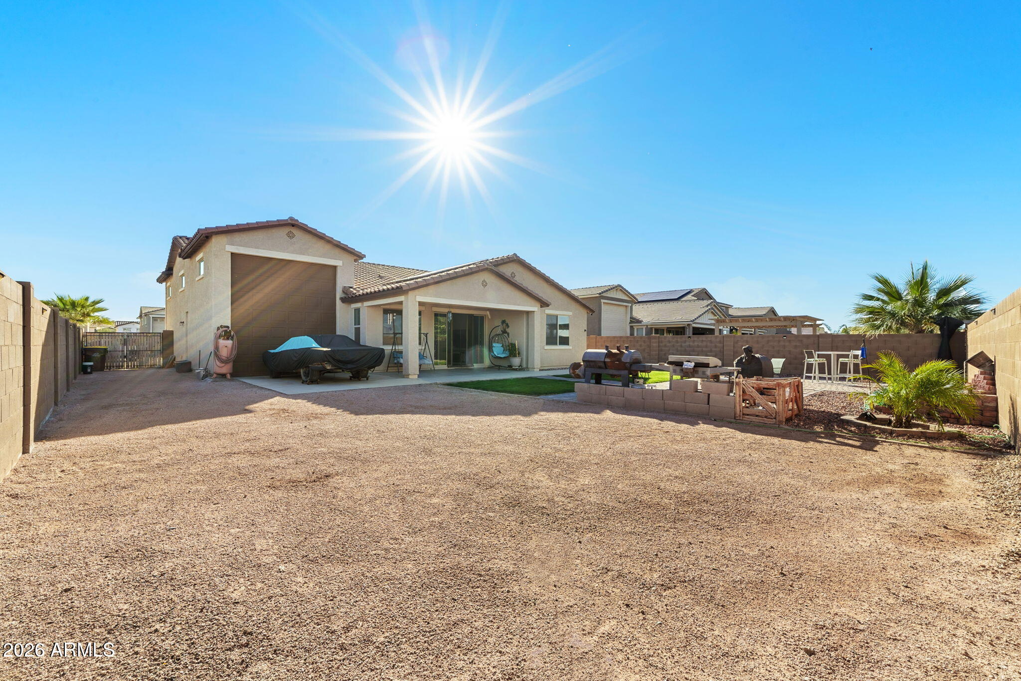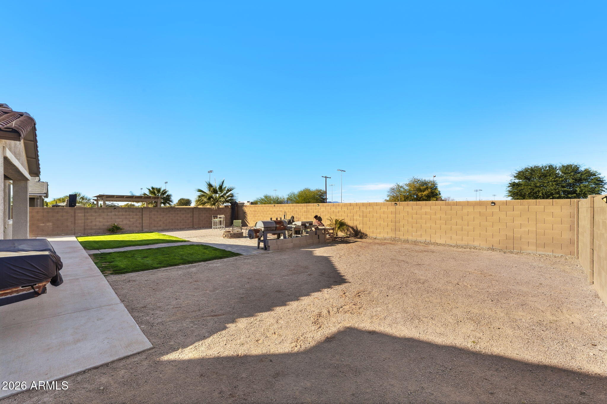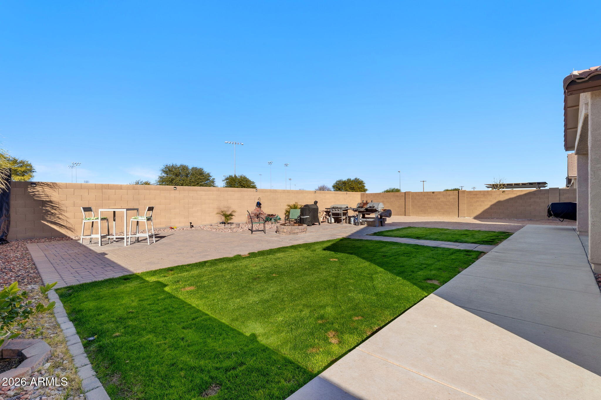 A standout feature is the RV garage with drive-through doors, complemented by an additional concrete RV parking pad--perfect for toys, trailers, or extra vehicles. The large laundry room with built-in shelving adds everyday convenience, and the shed conveys for additional storage. Step outside to a low-maintenance backyard designed for enjoyment, featuring a paver patio with a firepit, artificial turf, and easy-care landscaping. Both the front and backyard are equipped with sprinkler and drip systems, making upkeep a breeze. A paver driveway enhances curb appeal, while the backyard waterfall feature is ready to be filled and enjoyed.