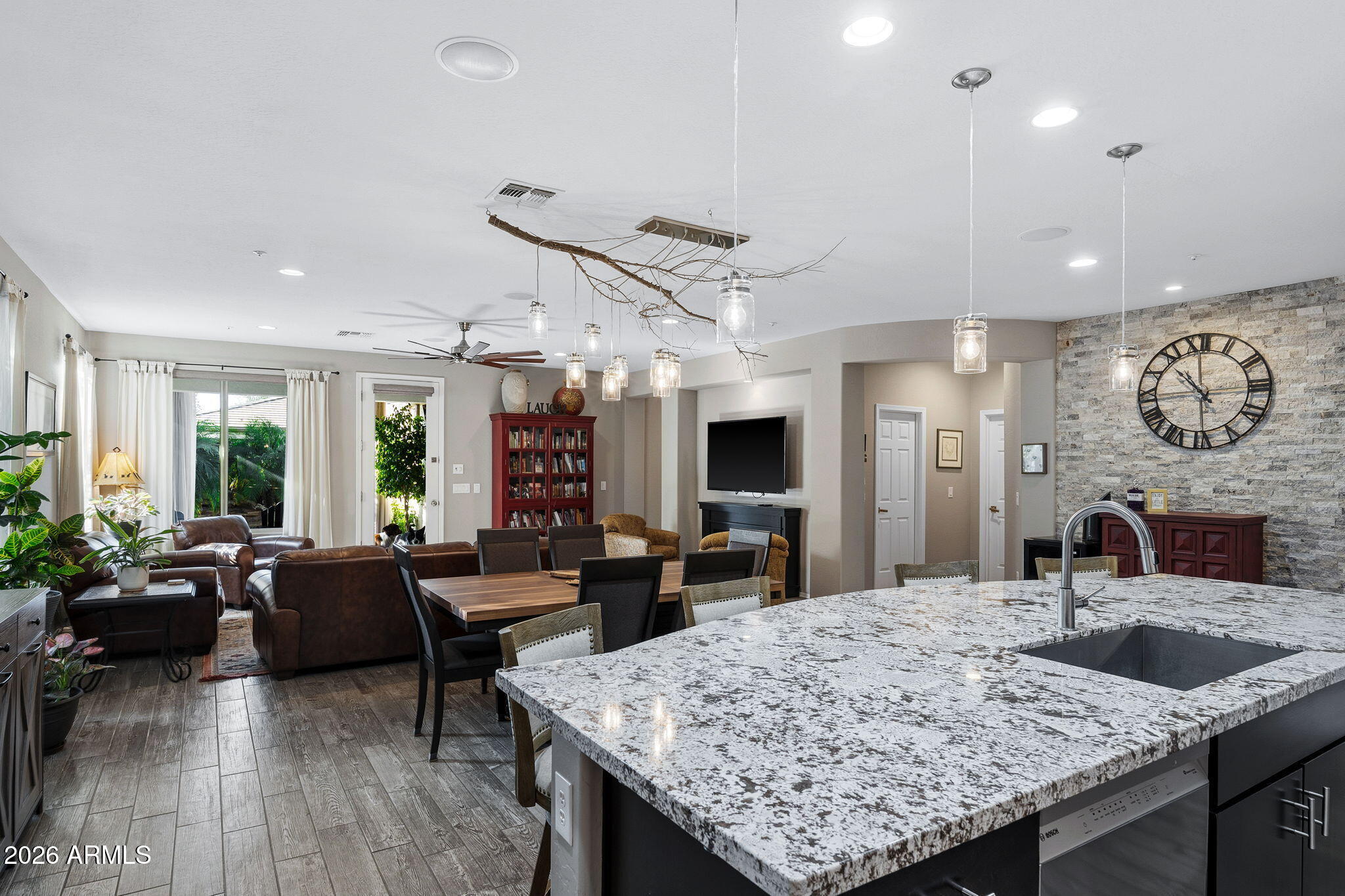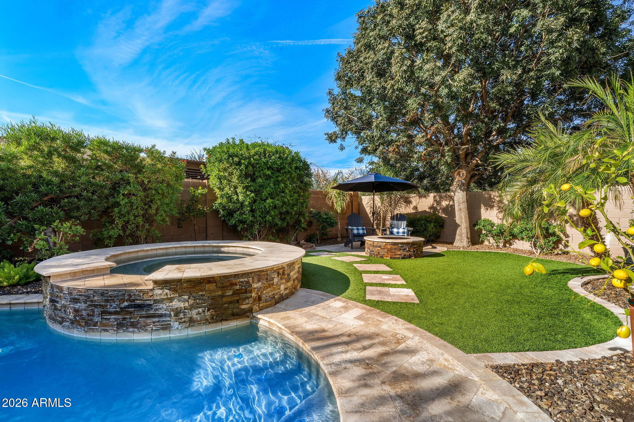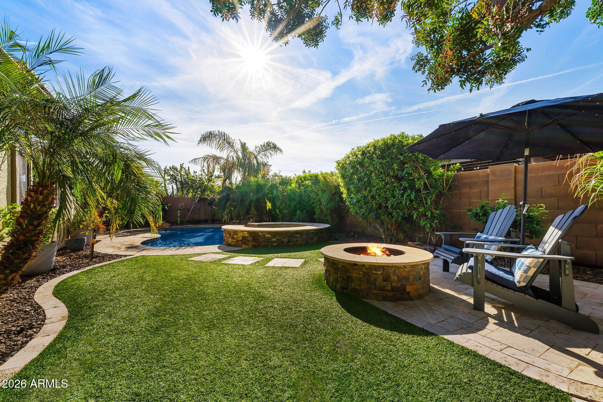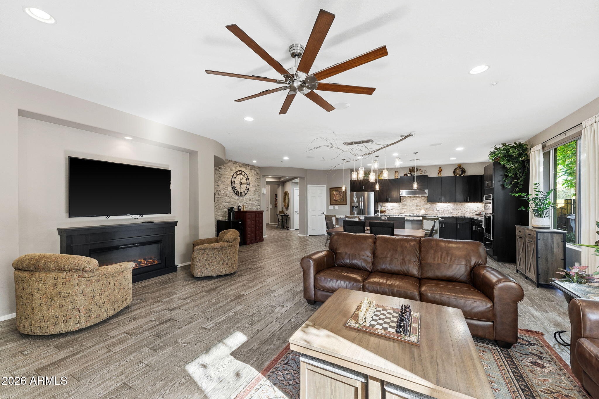 The living space is anchored by a striking stone accent wall and a sleek electric fireplace, creating a warm yet modern atmosphere. Throughout the home, enjoy a light-filled interior enhanced by motorized window shades, solar tubes in the entry and primary closet, and whole-home surround sound that extends seamlessly to the back patio. Outdoors, the backyard delivers a true resort-style experience with a sparkling pool and spa, travertine tile, low-maintenance turf, and a custom wood-burning firepit. A removable soft pool fence offers pet-friendly peace of mind, while the thoughtfully designed landscape provides effortless upkeepperfect for hosting or relaxing under the Arizona sun.