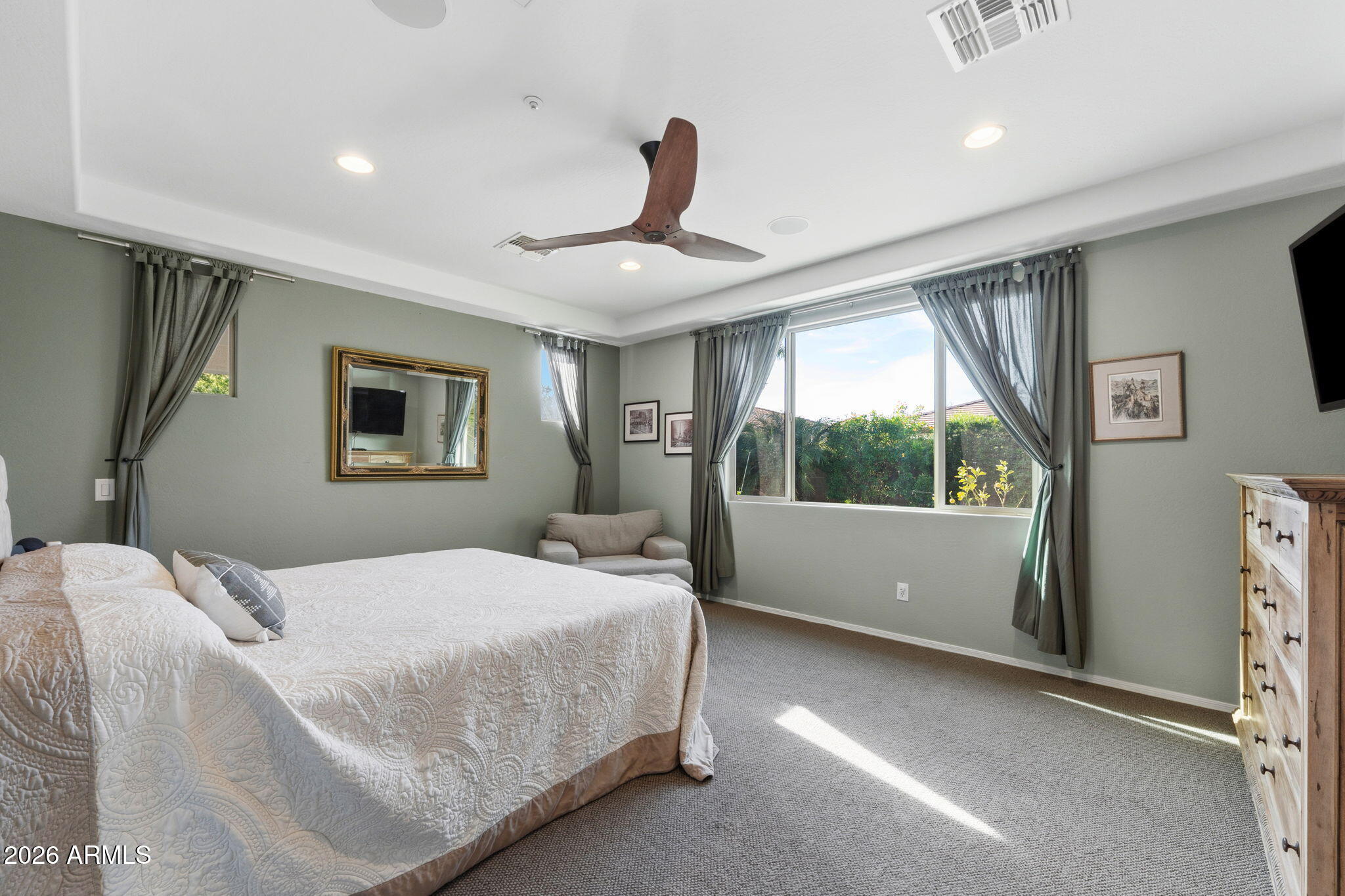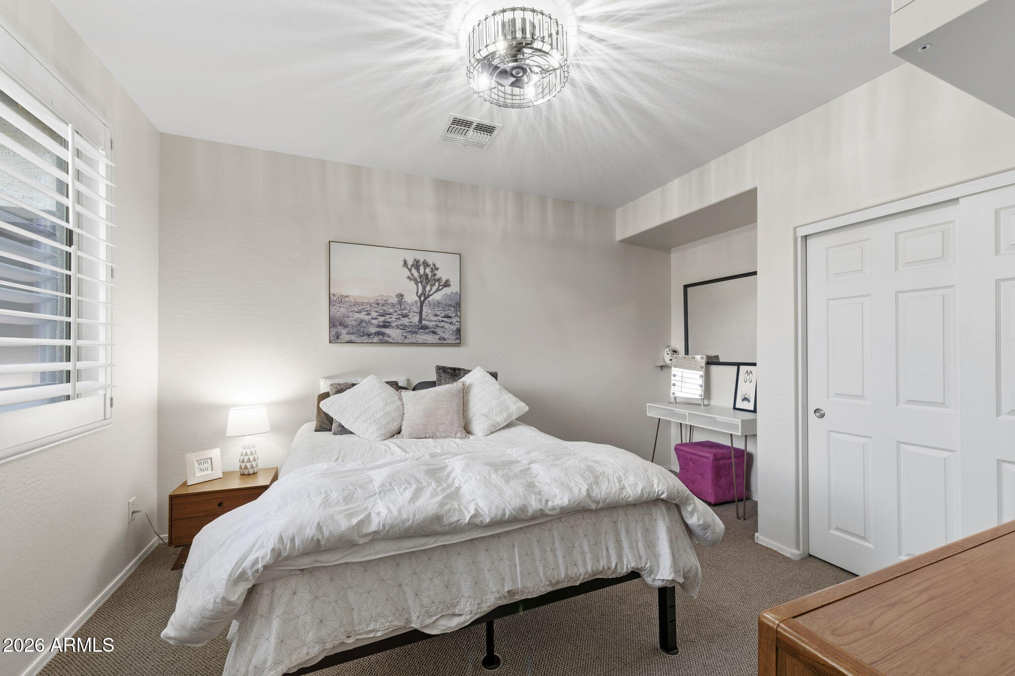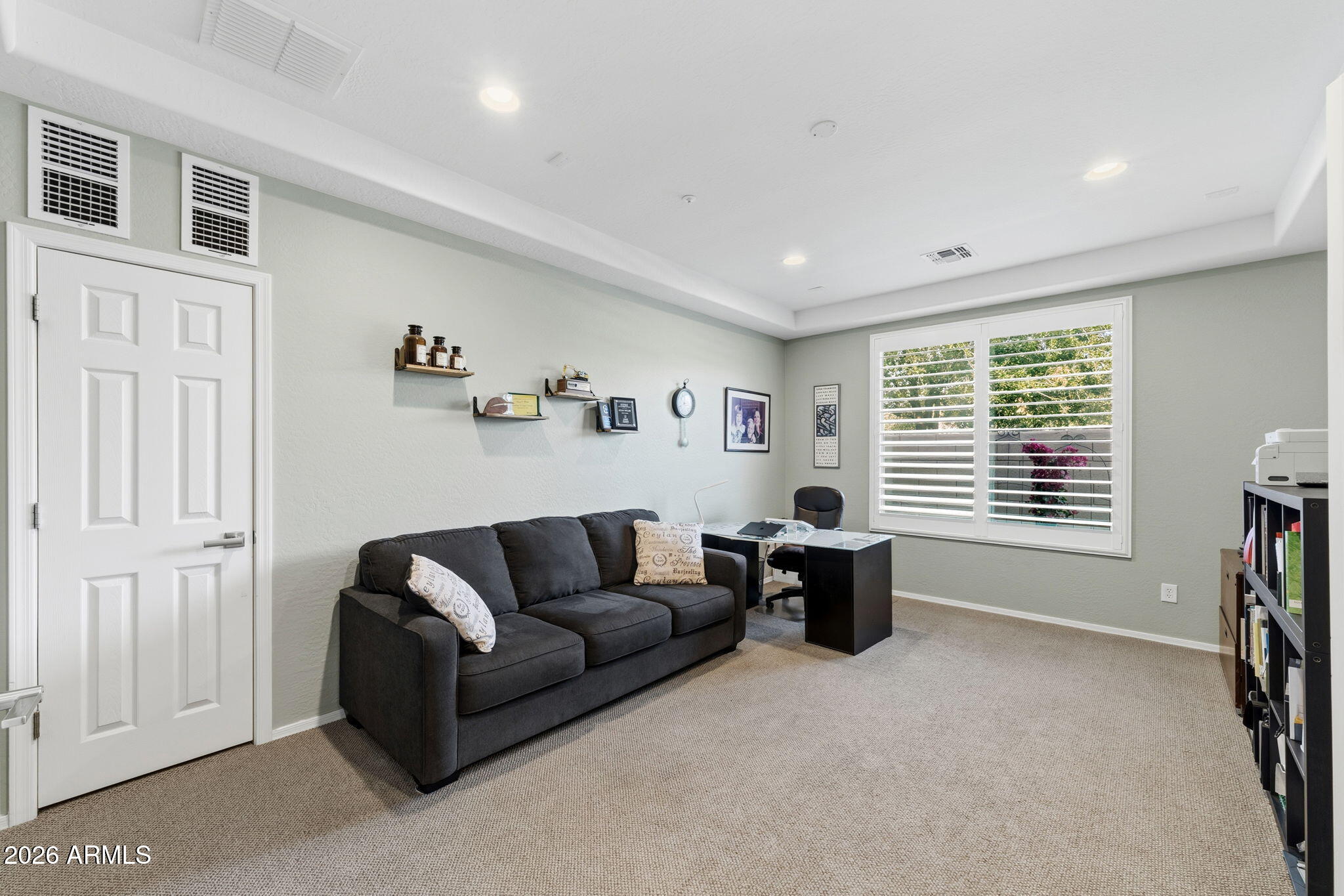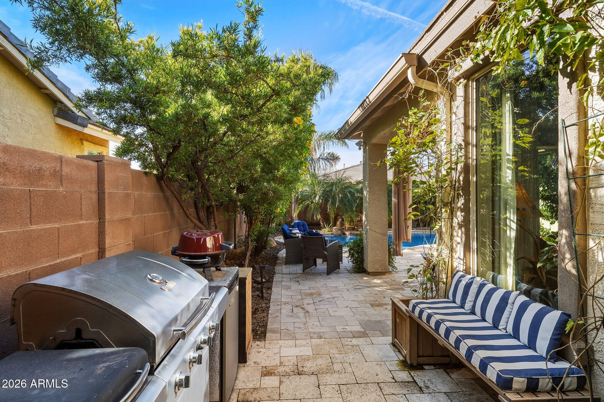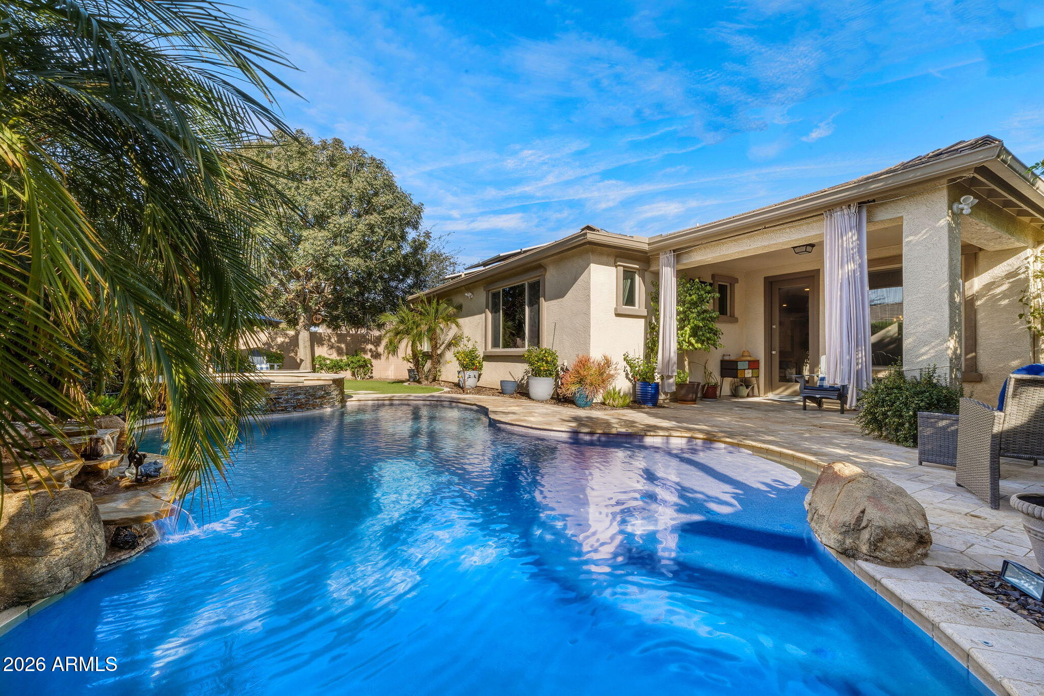 The living space is anchored by a striking stone accent wall and a sleek electric fireplace, creating a warm yet modern atmosphere. Throughout the home, enjoy a light-filled interior enhanced by motorized window shades, solar tubes in the entry and primary closet, and whole-home surround sound that extends seamlessly to the back patio. Outdoors, the backyard delivers a true resort-style experience with a sparkling pool and spa, travertine tile, low-maintenance turf, and a custom wood-burning firepit. A removable soft pool fence offers pet-friendly peace of mind, while the thoughtfully designed landscape provides effortless upkeepperfect for hosting or relaxing under the Arizona sun.