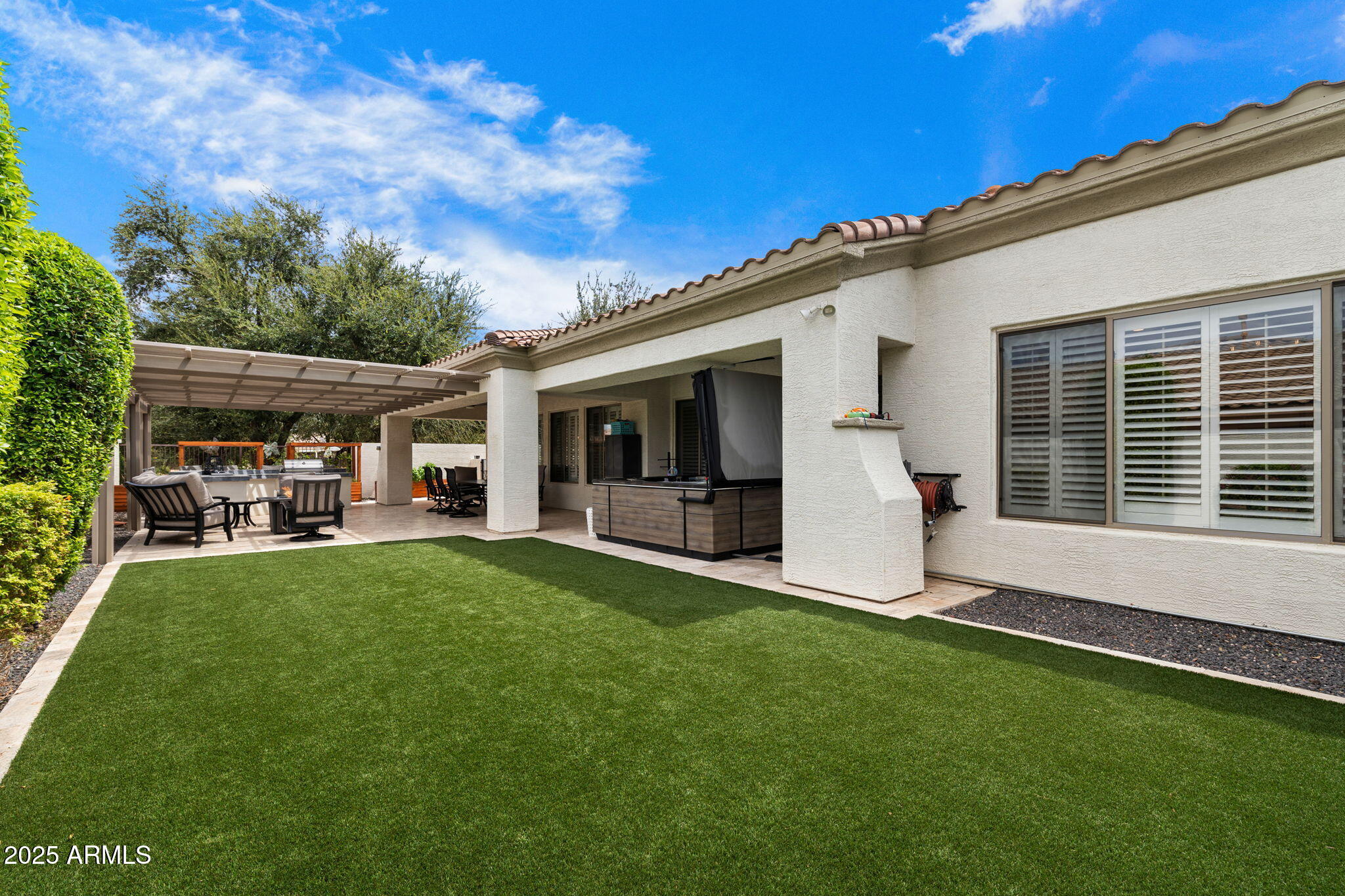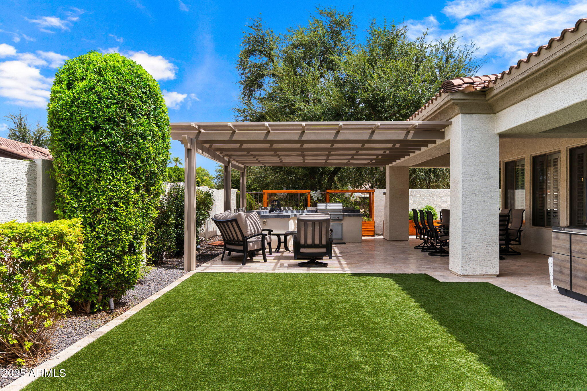 The updates continue outdoors with a true resort-style backyard: expansive travertine patios, custom pergolas, pavered courtyards, a built-in BBQ island, artificial turf, new irrigation, and a brand-new 10-person Bullfrog spa. Whether hosting a sunset dinner under the pergola or relaxing in the hot tub, this backyard is your private paradise.