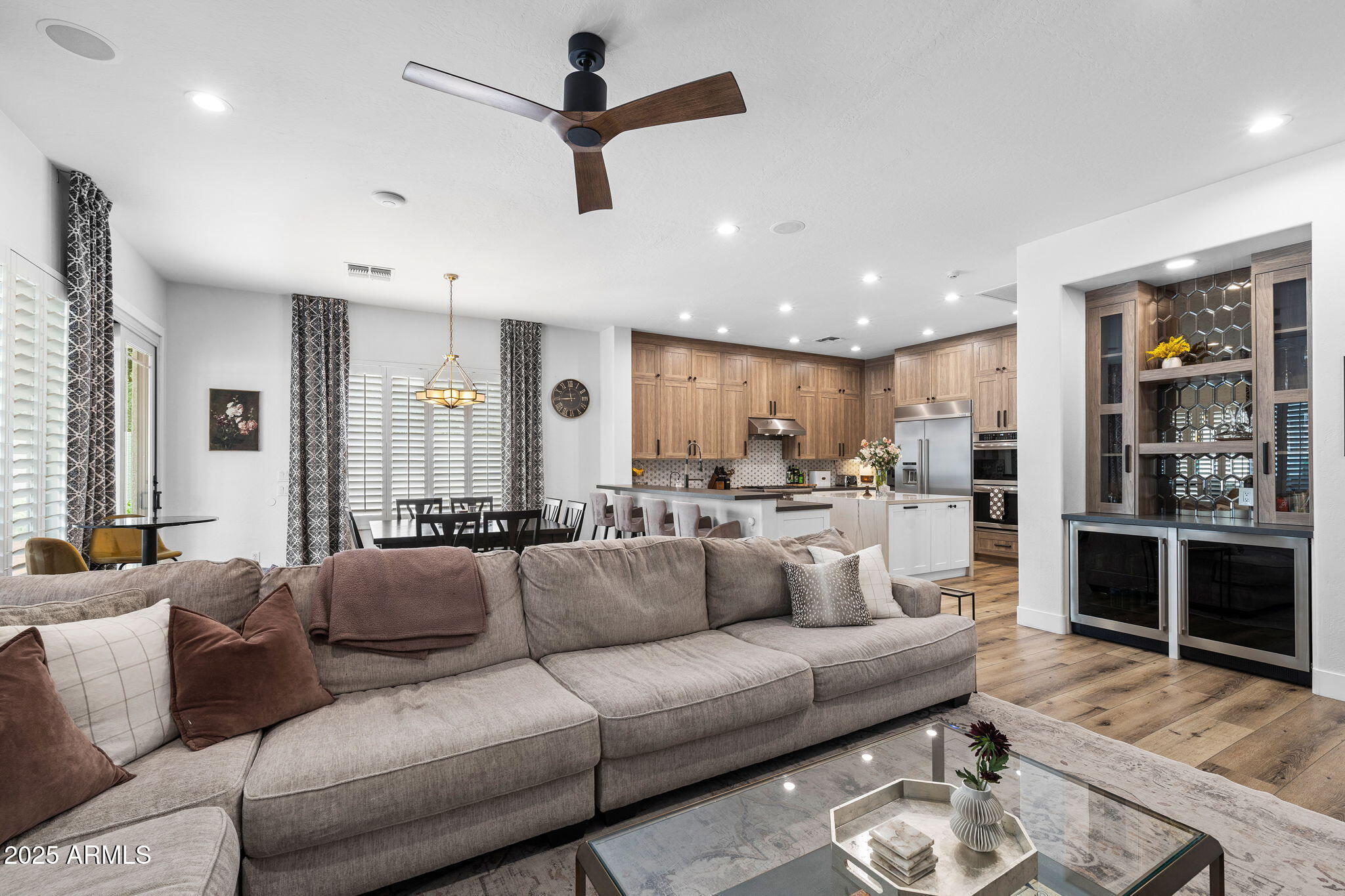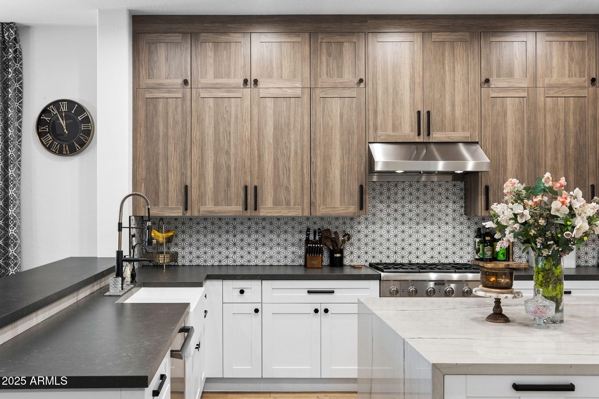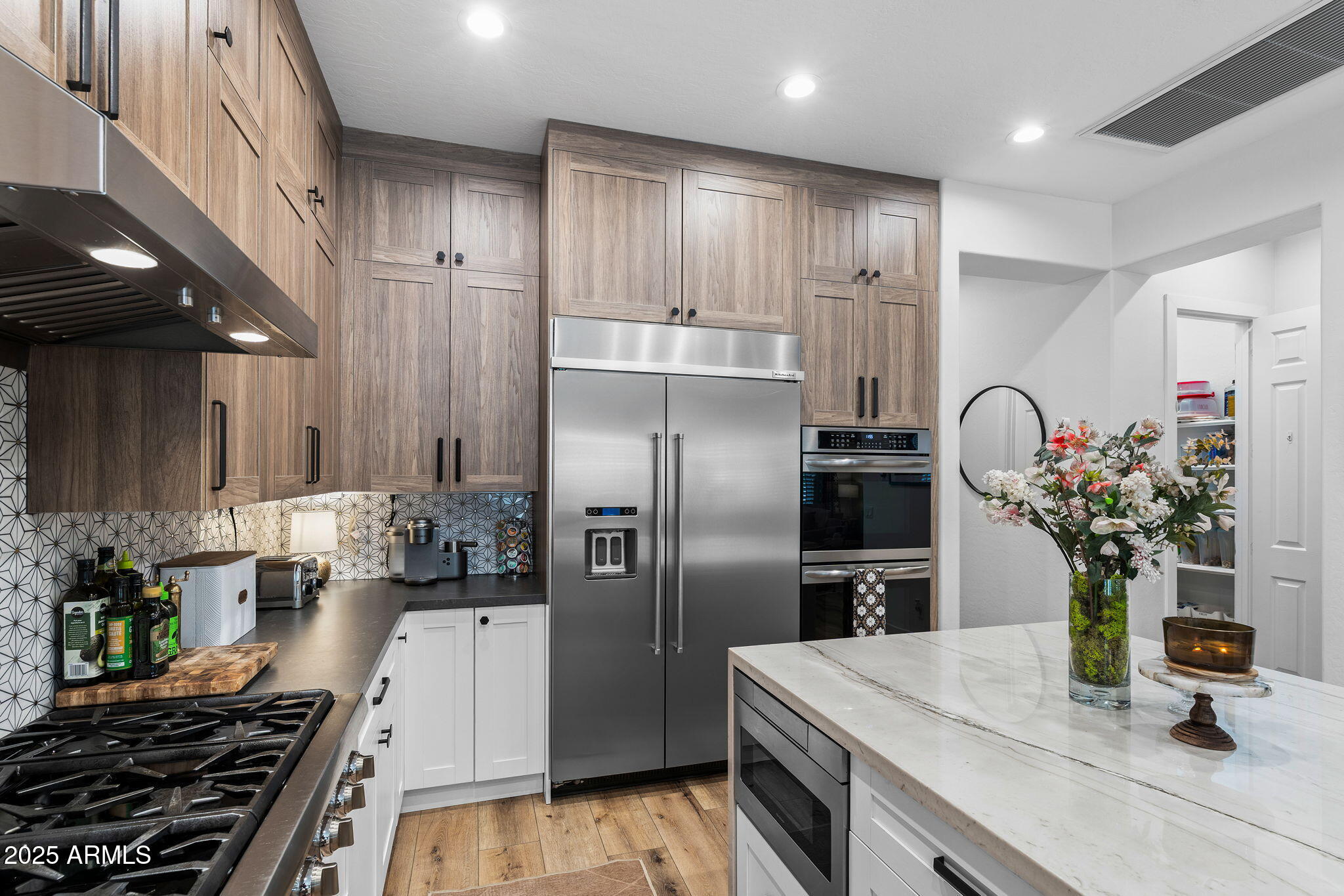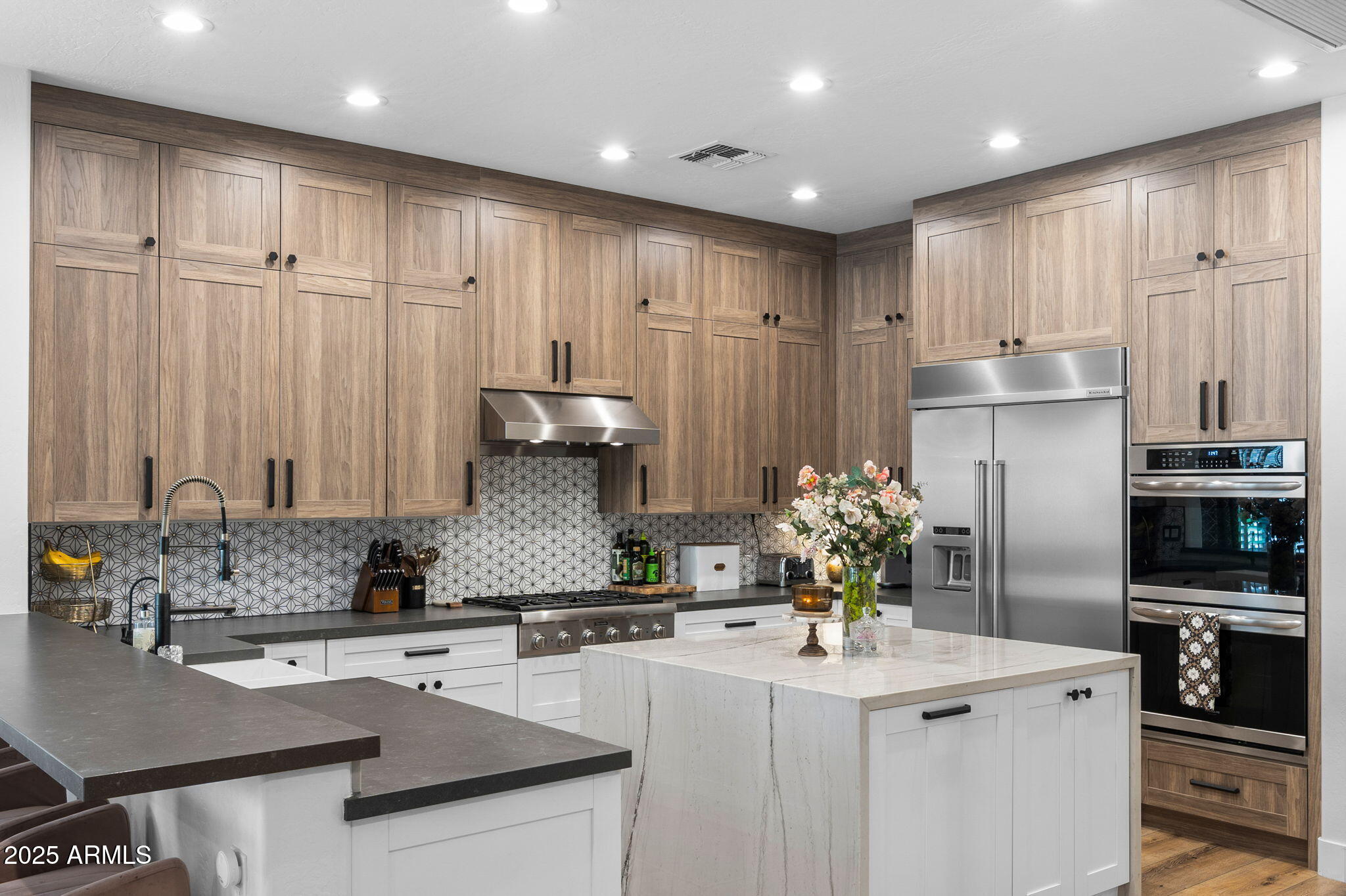 Step inside to a show-stopping chef's kitchen, rebuilt from the ground up with custom Madera cabinetry, Mont Blanc quartzite waterfall island, hand-laid marble and brass backsplash, professional appliances, and a full beverage/wine center. The adjoining living spaces are elevated with designer lighting, custom millwork, and a reimagined fireplace wall that feels both modern and timeless. Throughout the home, you'll find luxury finishes at every turnwide-plank flooring, custom cabinetry, high-end fixtures, and thoughtfully designed bathrooms, including a spa-like kids' suite wrapped in floor-to-ceiling marble.