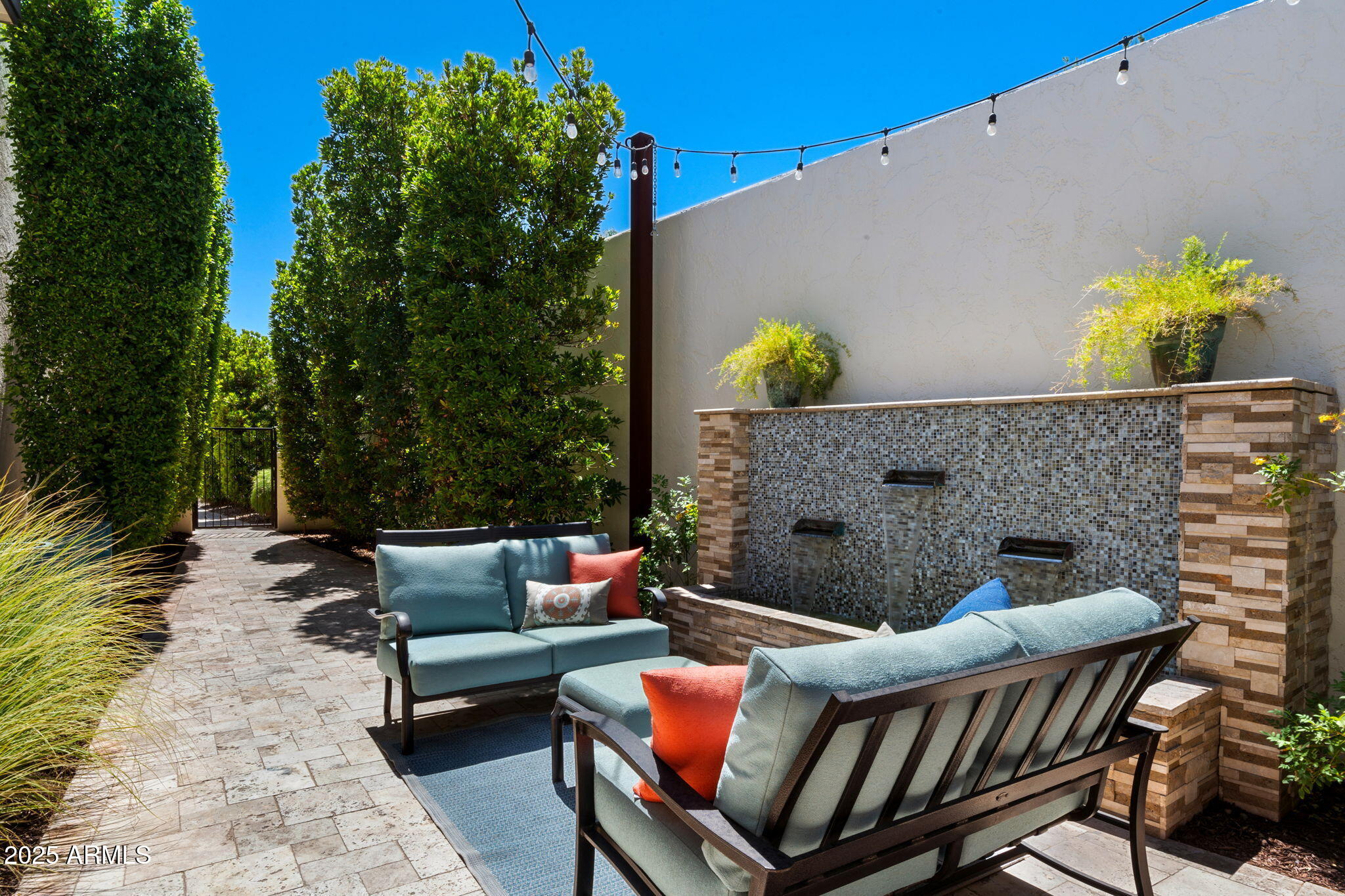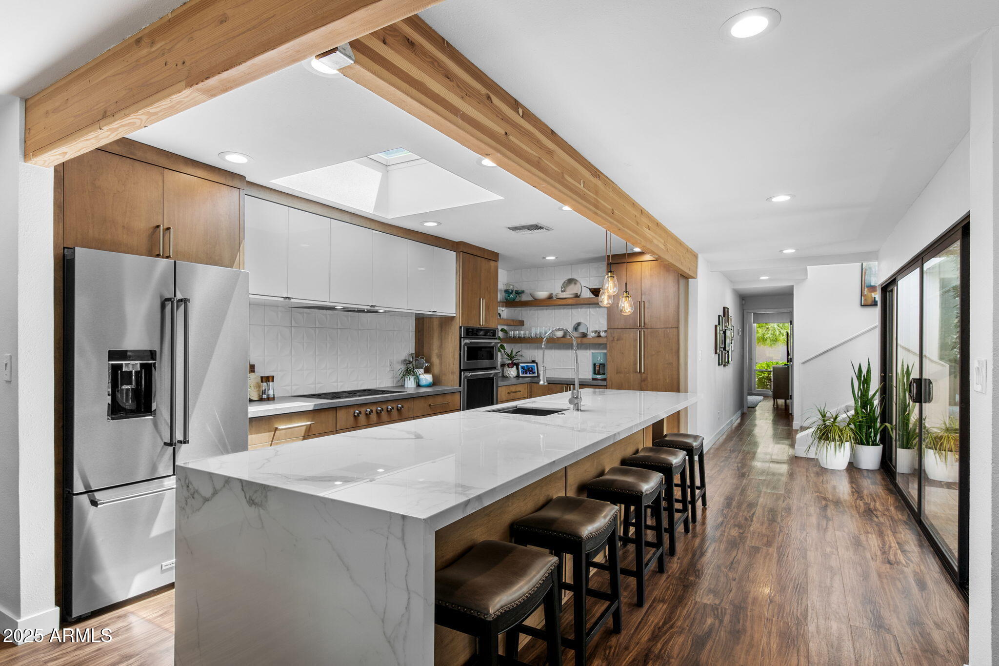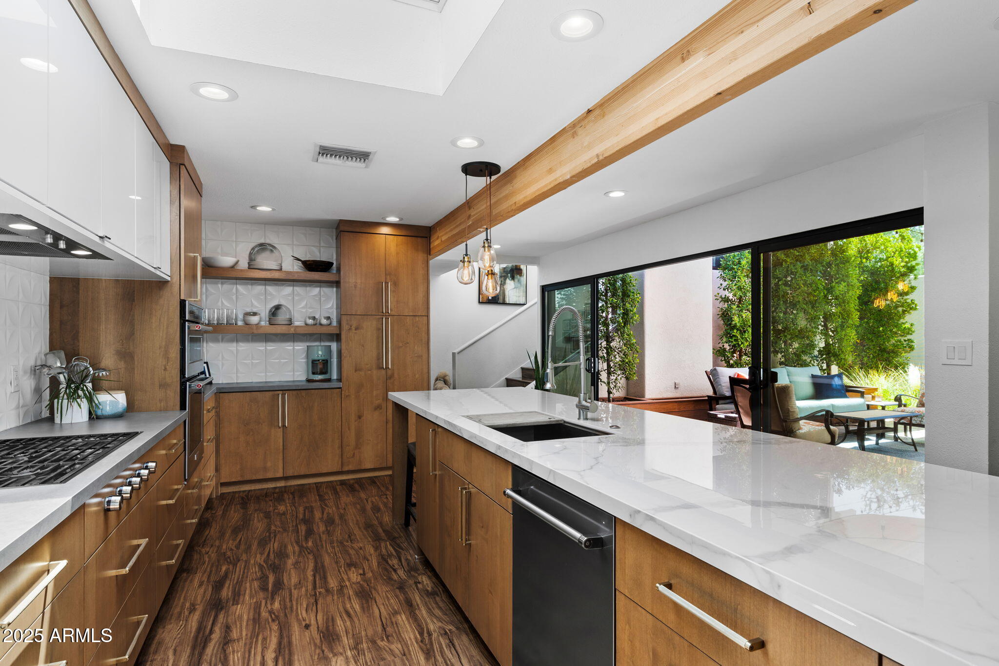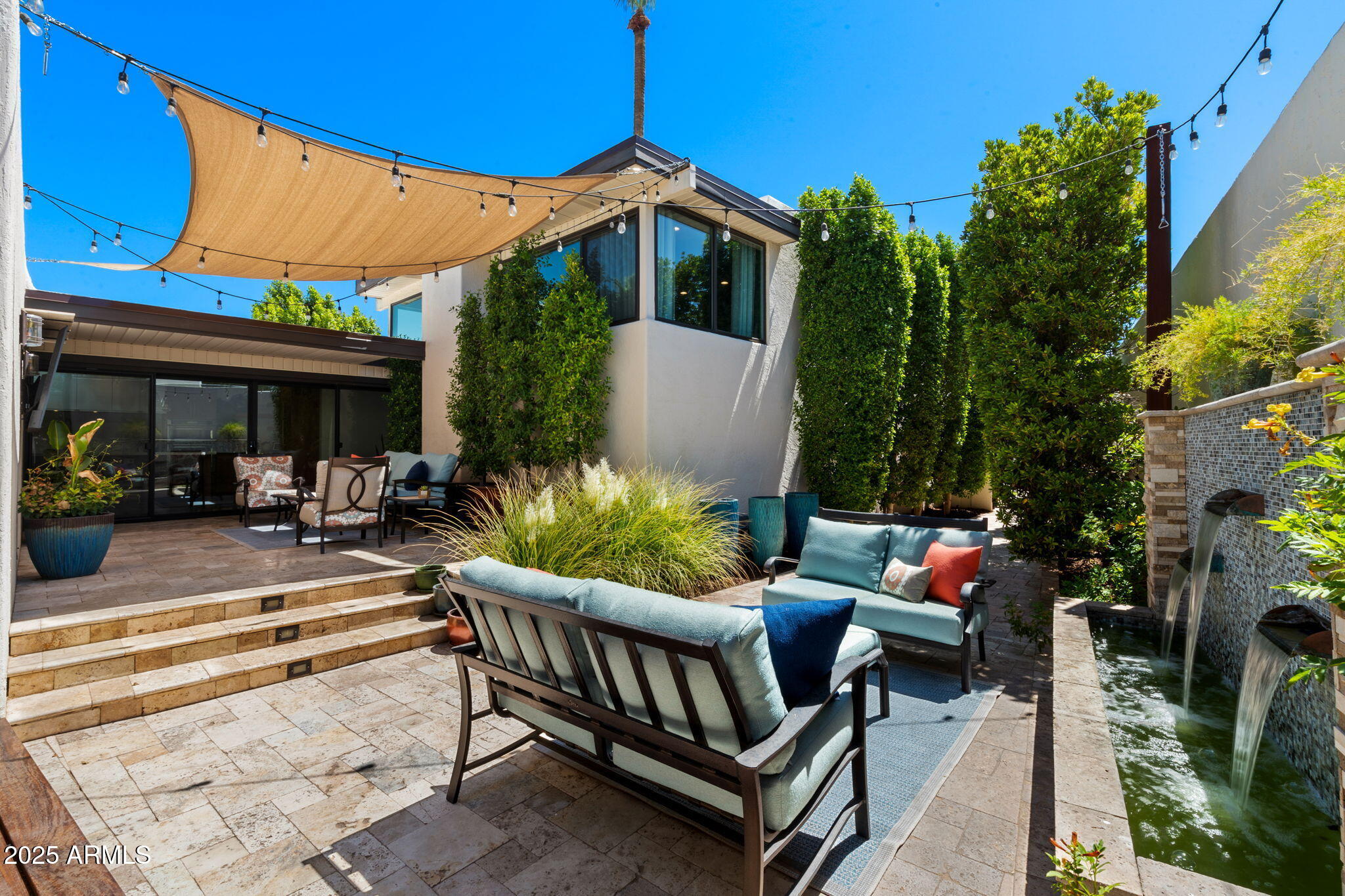 Welcome to an exceptional retreat nestled in the heart of Arcadia Green, one of the area's most coveted mid-century modern communities. This fully renovated residence blends architectural integrity with contemporary sophistication, offering an entertainer's dream and a chef's haven in one elegant package. Step inside to discover seamless indoor-outdoor living, where expansive sliders open to a lush courtyard featuring an outdoor fountain wall, a fully equipped natural gas BBQ, refrigerator and entertainment zone, and a spa for year-round relaxation, all framed by Italian travertine flooring and Brazilian hardwood decking. The chef's kitchen is a true centerpiece: flush gas Wolf cooktop, custom Alderwood cabinetry is continuous throughout the kitchen, dining, and bath, and show-stopping lighting details that elevate every culinary moment. Porcelain countertops, designer fixtures, and high-end KitchenAid appliances complete the space, while a sunroof-style skylight bathes the room in natural light. With the ability to comfortably seat 35 guests, this home was designed to host. Whether an intimate dinner or a grand celebration. Every inch has been thoughtfully curated, from custom light fixtures to the Delta Trinsic bath fixtures, back-lit mirrors and elegant planter boxes.