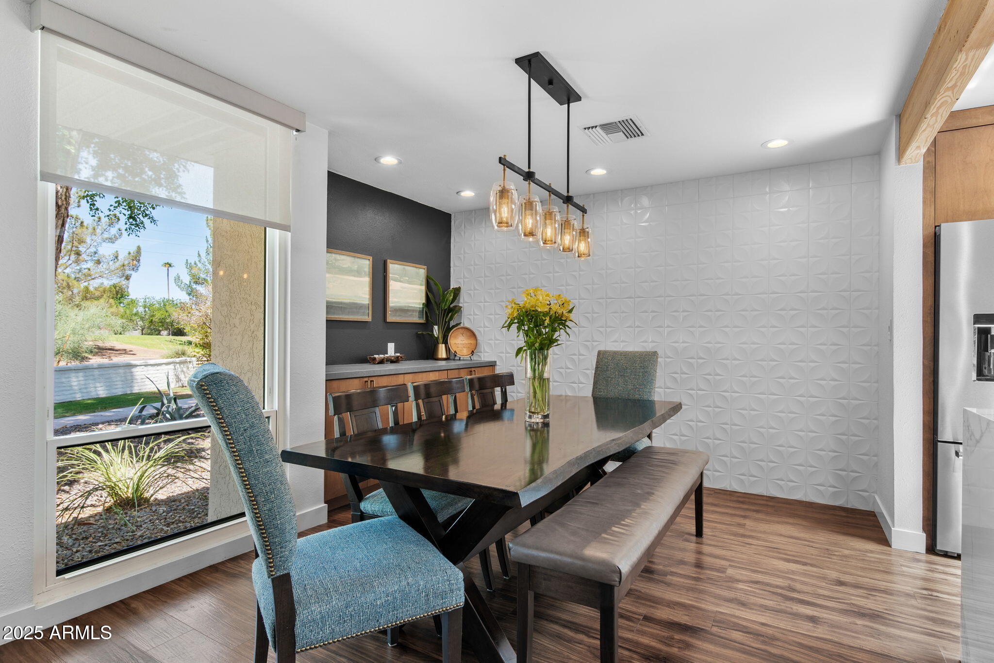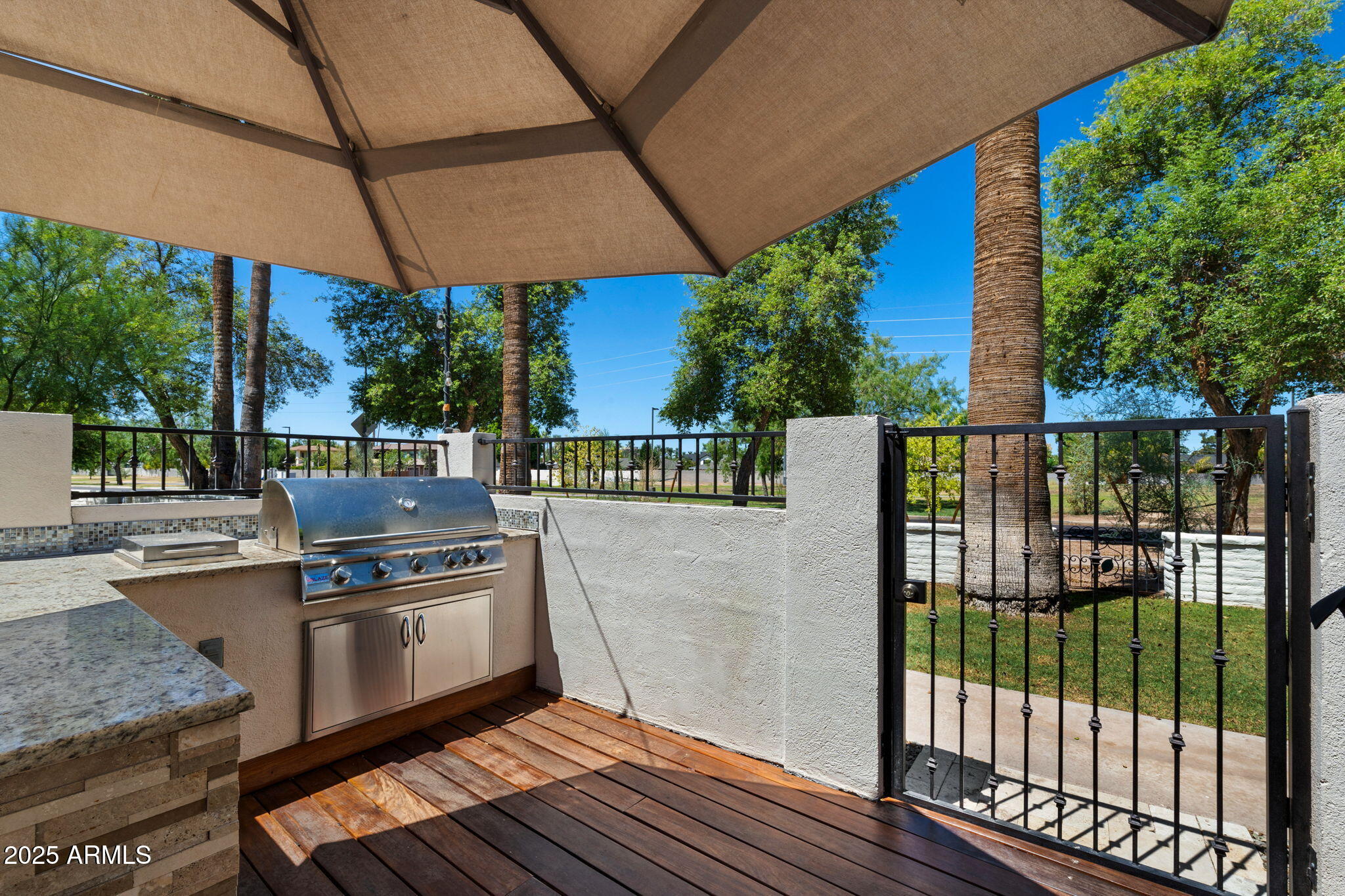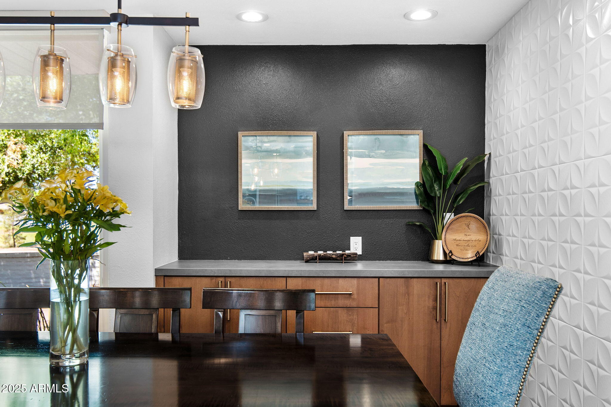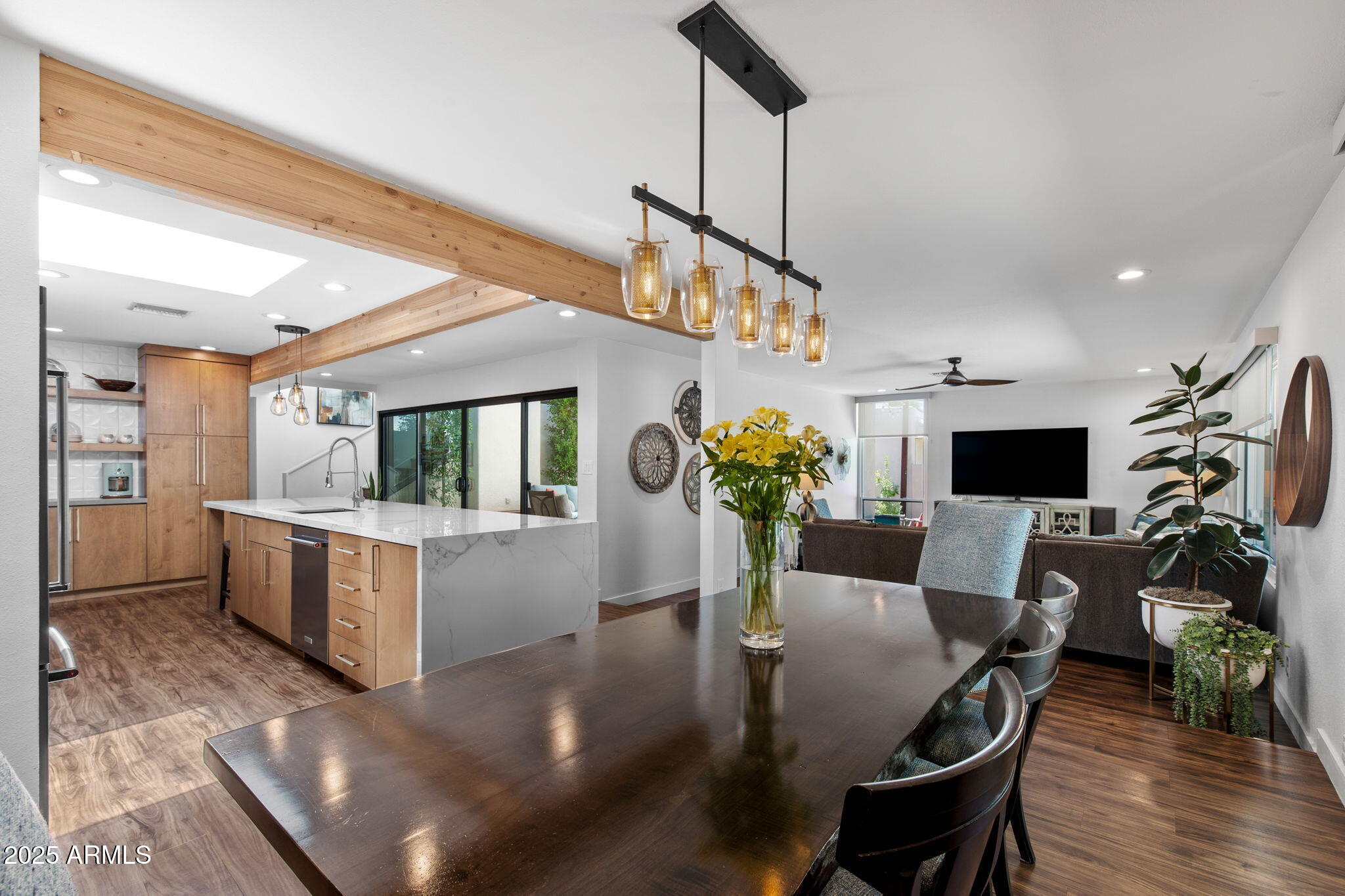 Welcome to an exceptional retreat nestled in the heart of Arcadia Green, one of the area's most coveted mid-century modern communities. This fully renovated residence blends architectural integrity with contemporary sophistication, offering an entertainer's dream and a chef's haven in one elegant package. Step inside to discover seamless indoor-outdoor living, where expansive sliders open to a lush courtyard featuring an outdoor fountain wall, a fully equipped natural gas BBQ, refrigerator and entertainment zone, and a spa for year-round relaxation, all framed by Italian travertine flooring and Brazilian hardwood decking. The chef's kitchen is a true centerpiece: flush gas Wolf cooktop, custom Alderwood cabinetry is continuous throughout the kitchen, dining, and bath, and show-stopping lighting details that elevate every culinary moment. Porcelain countertops, designer fixtures, and high-end KitchenAid appliances complete the space, while a sunroof-style skylight bathes the room in natural light. With the ability to comfortably seat 35 guests, this home was designed to host. Whether an intimate dinner or a grand celebration. Every inch has been thoughtfully curated, from custom light fixtures to the Delta Trinsic bath fixtures, back-lit mirrors and elegant planter boxes.