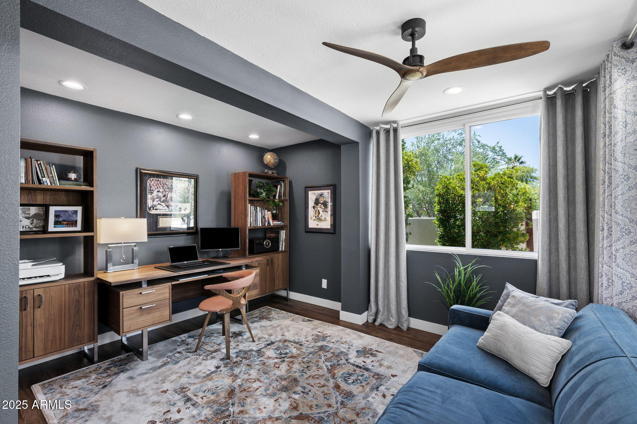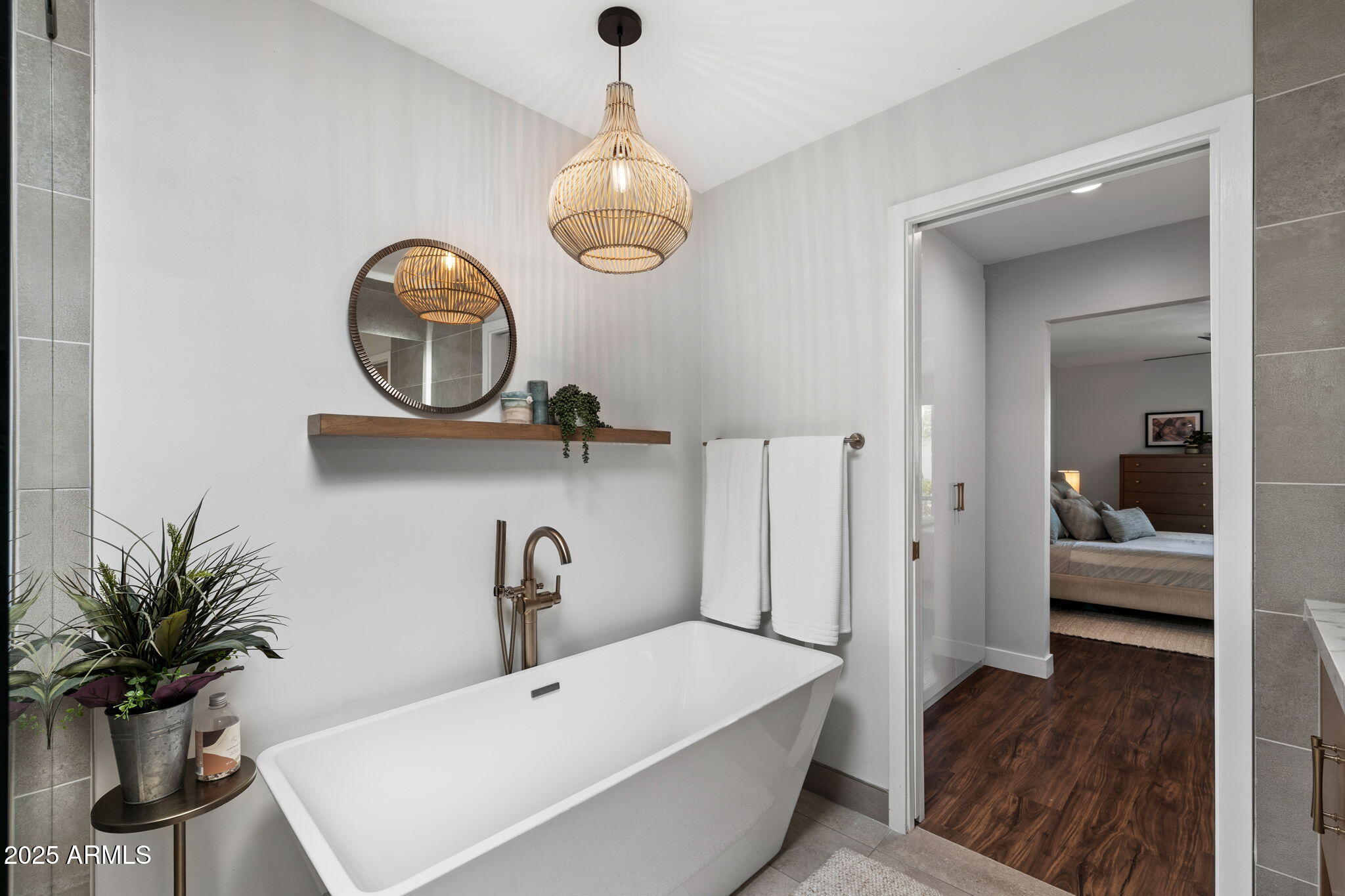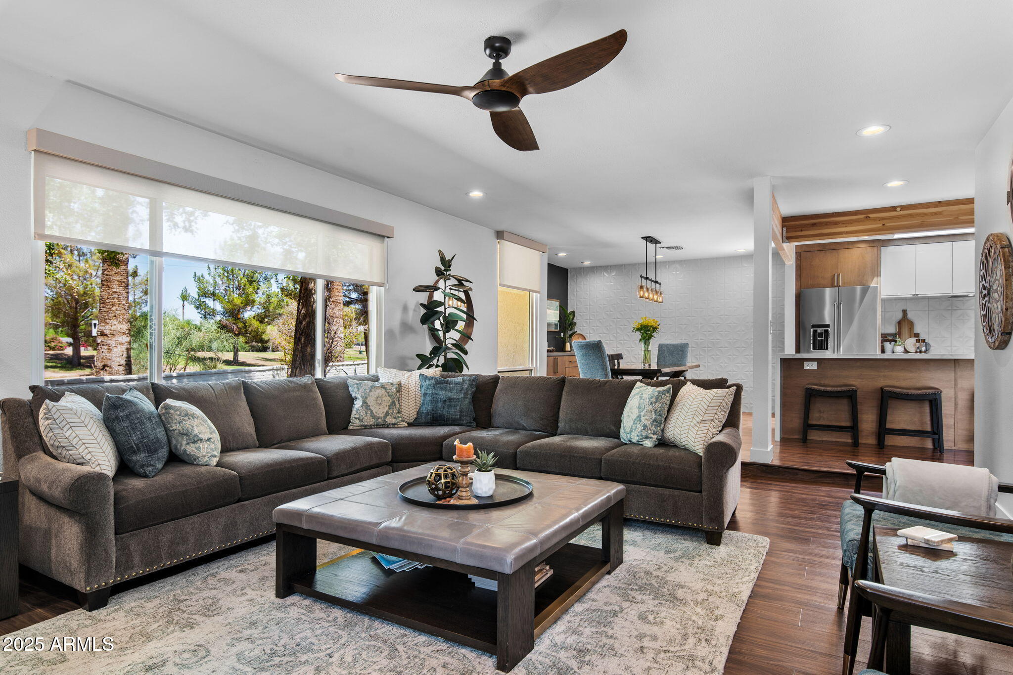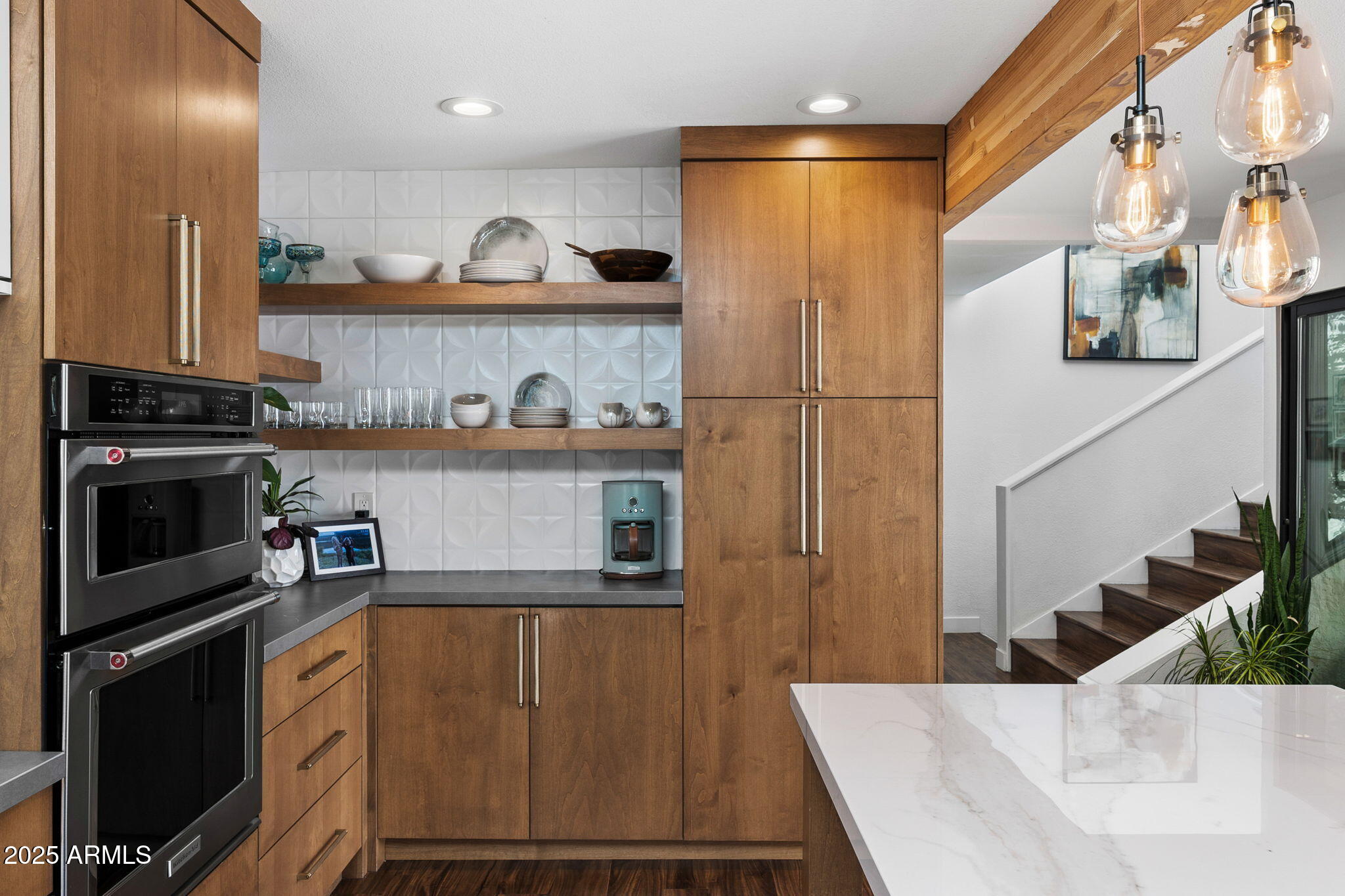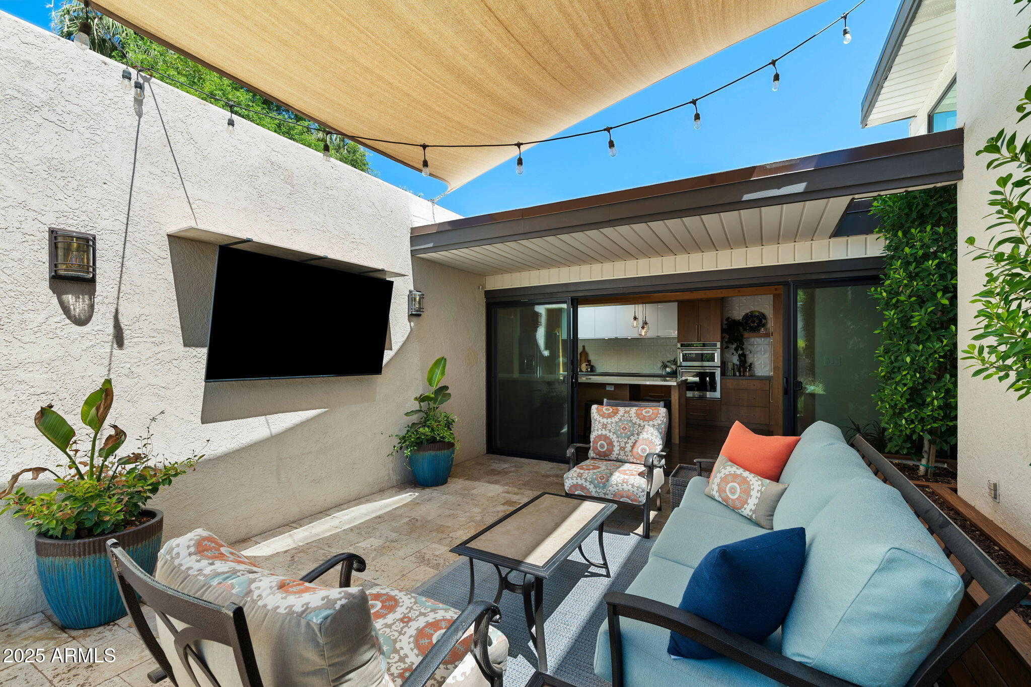 Welcome to an exceptional retreat nestled in the heart of Arcadia Green, one of the area's most coveted mid-century modern communities. This fully renovated residence blends architectural integrity with contemporary sophistication, offering an entertainer's dream and a chef's haven in one elegant package. Step inside to discover seamless indoor-outdoor living, where expansive sliders open to a lush courtyard featuring an outdoor fountain wall, a fully equipped natural gas BBQ, refrigerator and entertainment zone, and a spa for year-round relaxation, all framed by Italian travertine flooring and Brazilian hardwood decking. The chef's kitchen is a true centerpiece: flush gas Wolf cooktop, custom Alderwood cabinetry is continuous throughout the kitchen, dining, and bath, and show-stopping lighting details that elevate every culinary moment. Porcelain countertops, designer fixtures, and high-end KitchenAid appliances complete the space, while a sunroof-style skylight bathes the room in natural light. With the ability to comfortably seat 35 guests, this home was designed to host. Whether an intimate dinner or a grand celebration. Every inch has been thoughtfully curated, from custom light fixtures to the Delta Trinsic bath fixtures, back-lit mirrors and elegant planter boxes.