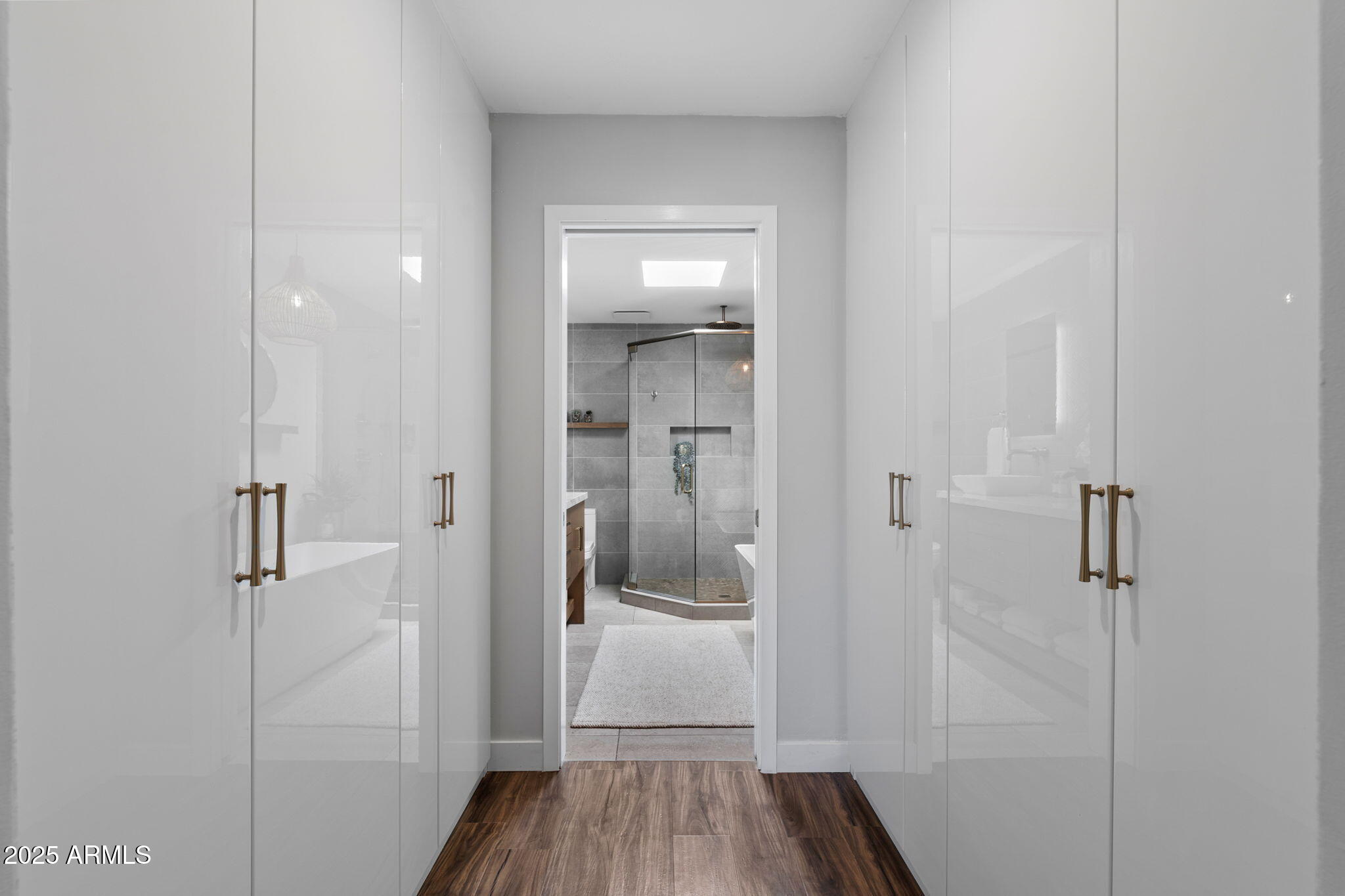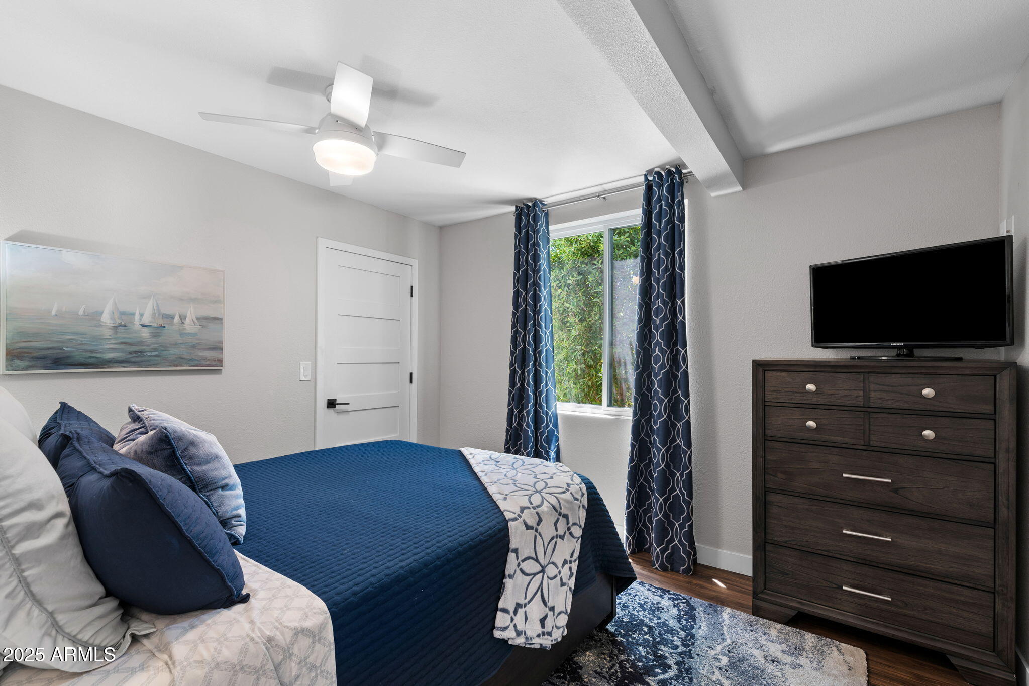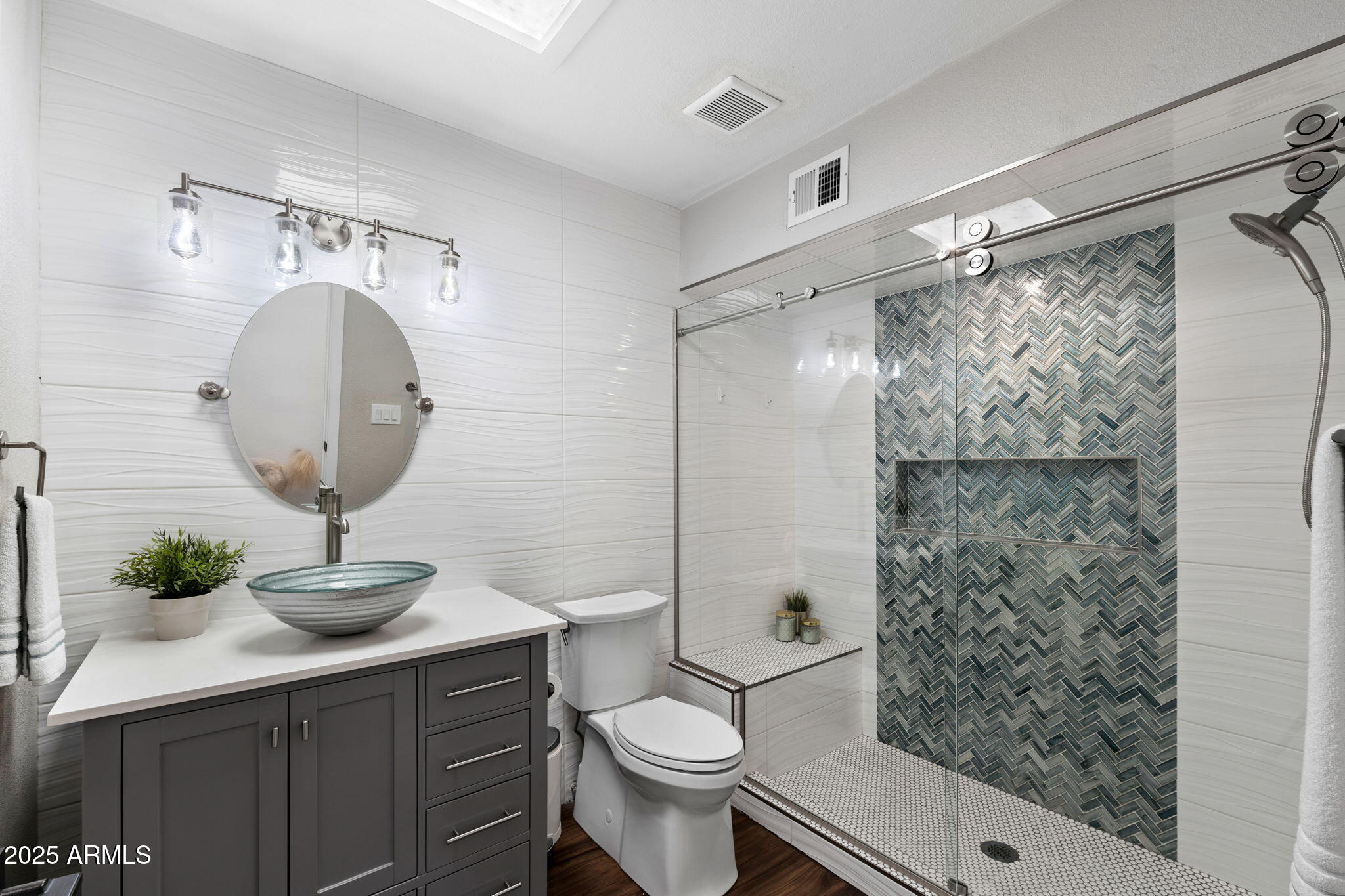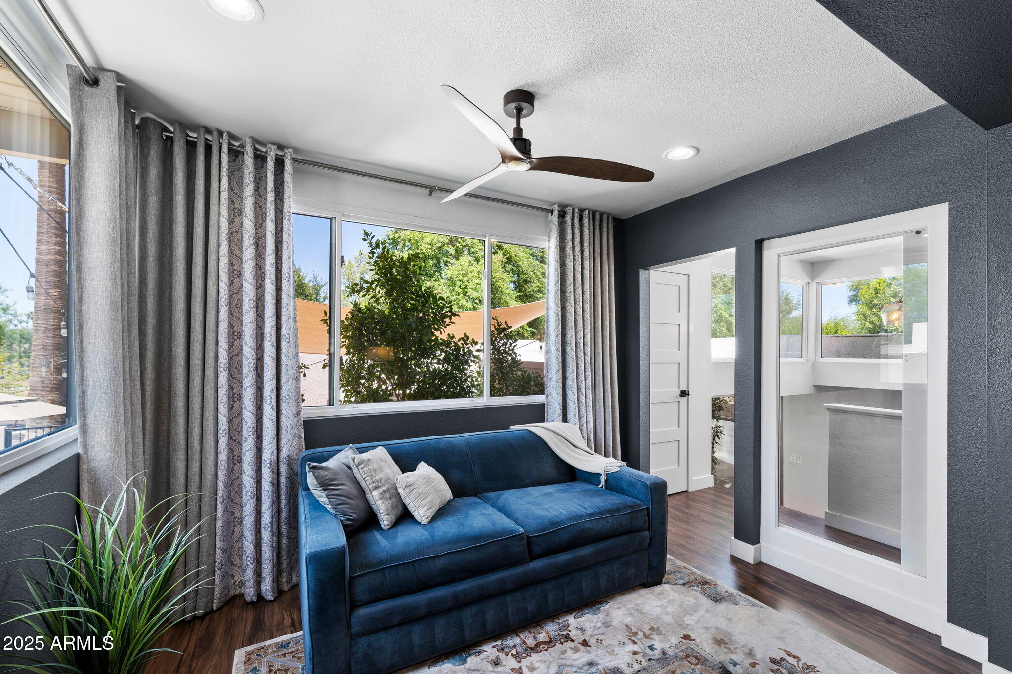 Welcome to an exceptional retreat nestled in the heart of Arcadia Green, one of the area's most coveted mid-century modern communities. This fully renovated residence blends architectural integrity with contemporary sophistication, offering an entertainer's dream and a chef's haven in one elegant package. Step inside to discover seamless indoor-outdoor living, where expansive sliders open to a lush courtyard featuring an outdoor fountain wall, a fully equipped natural gas BBQ, refrigerator and entertainment zone, and a spa for year-round relaxation, all framed by Italian travertine flooring and Brazilian hardwood decking. The chef's kitchen is a true centerpiece: flush gas Wolf cooktop, custom Alderwood cabinetry is continuous throughout the kitchen, dining, and bath, and show-stopping lighting details that elevate every culinary moment. Porcelain countertops, designer fixtures, and high-end KitchenAid appliances complete the space, while a sunroof-style skylight bathes the room in natural light. With the ability to comfortably seat 35 guests, this home was designed to host. Whether an intimate dinner or a grand celebration. Every inch has been thoughtfully curated, from custom light fixtures to the Delta Trinsic bath fixtures, back-lit mirrors and elegant planter boxes.