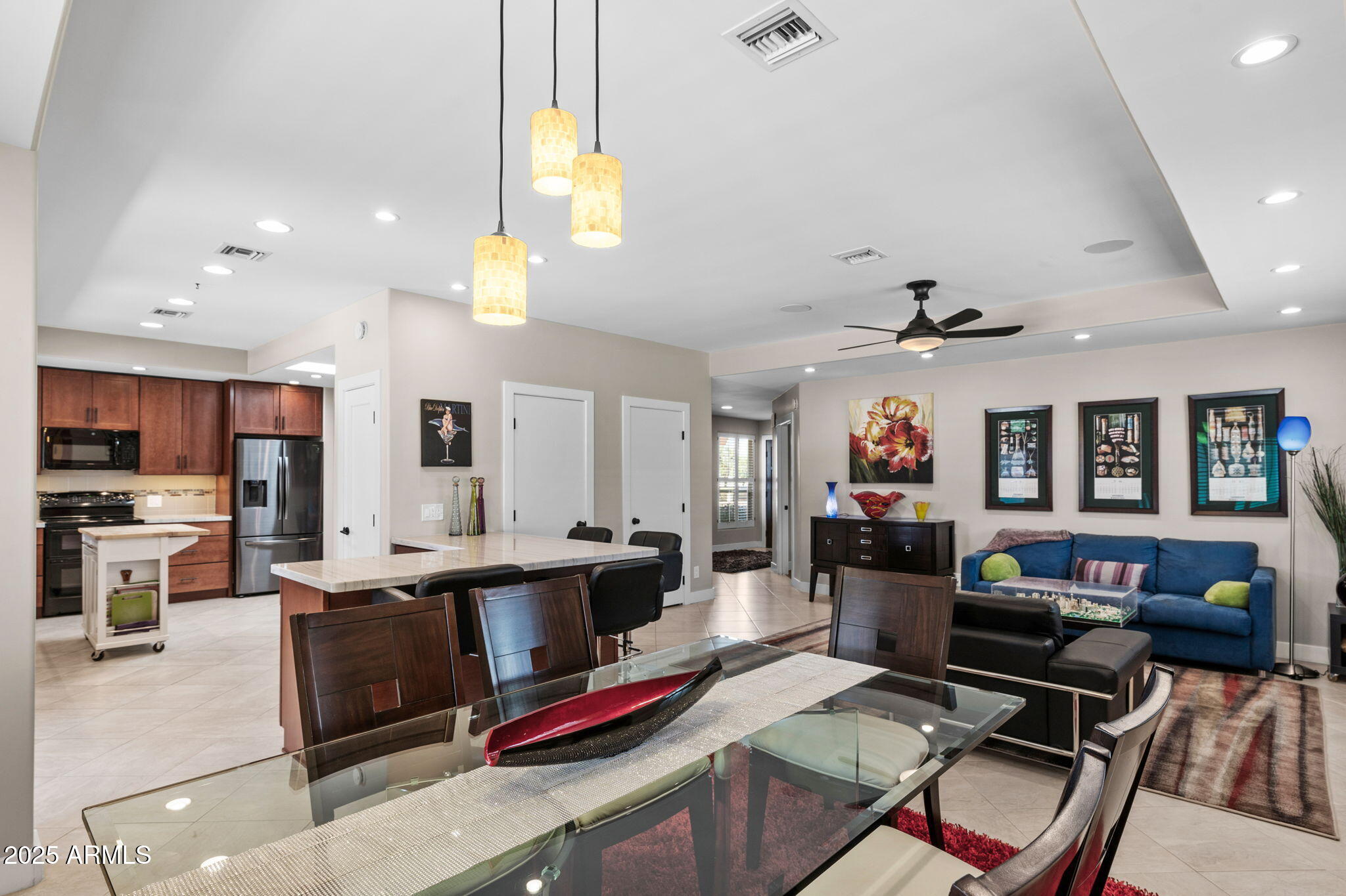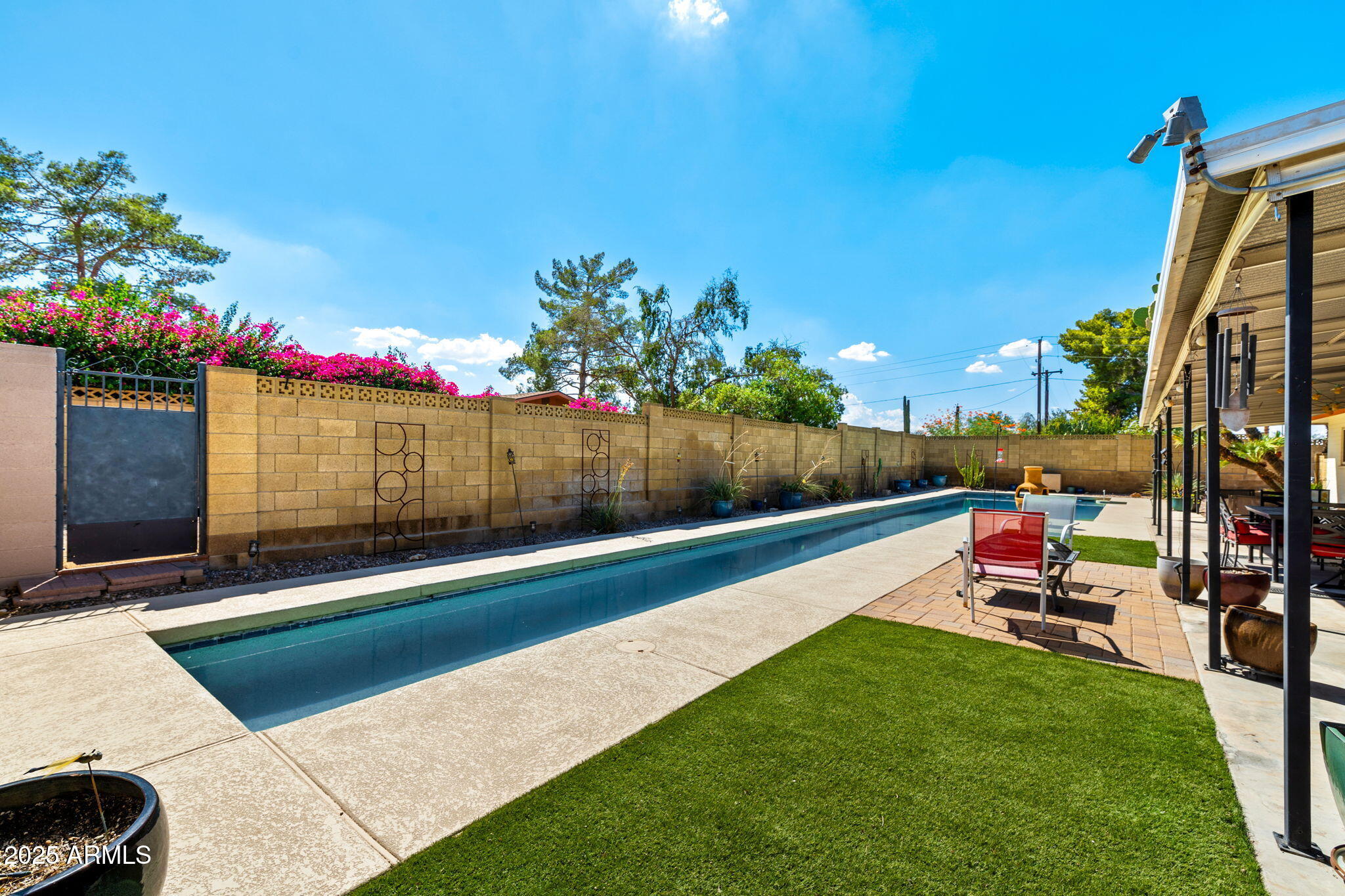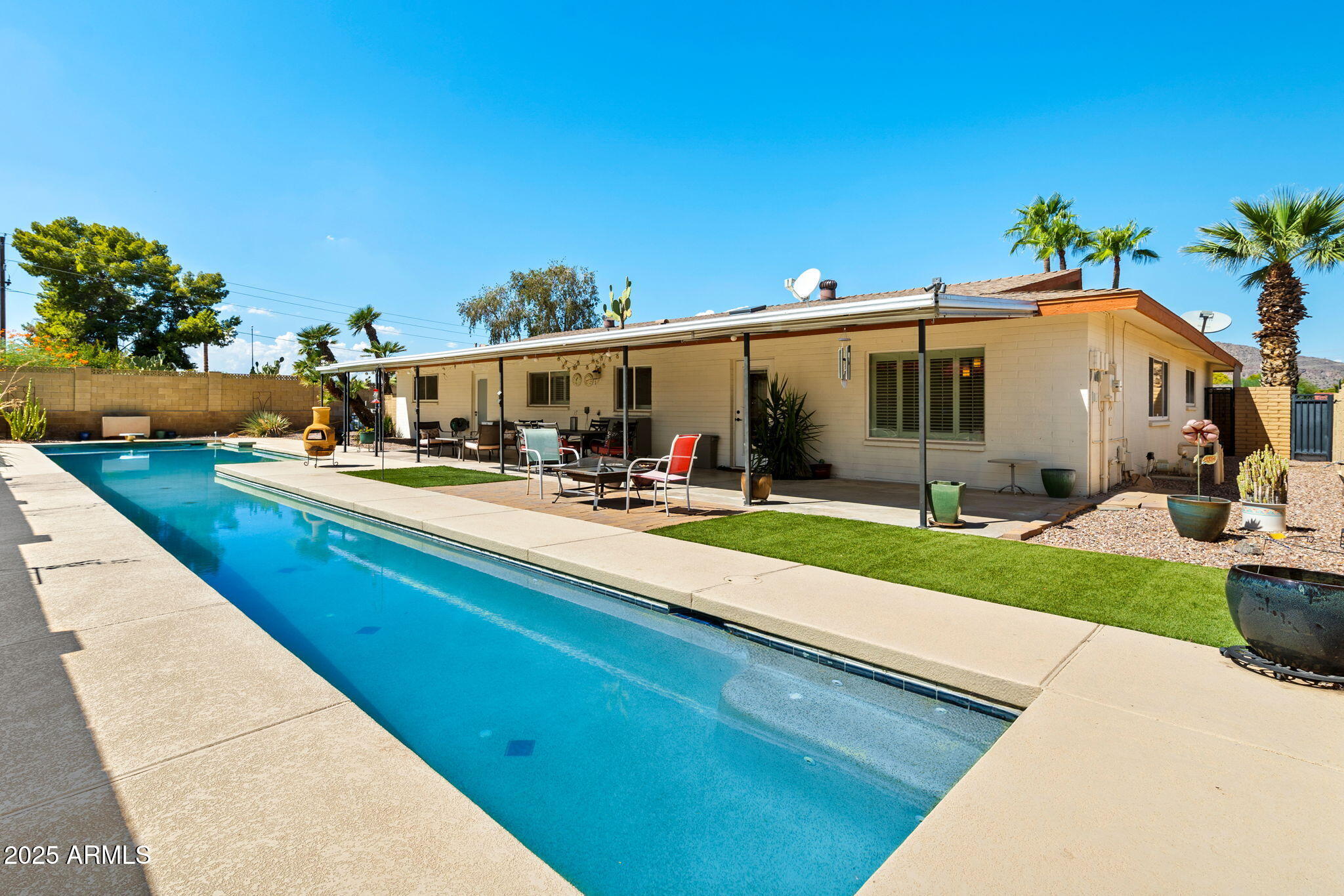 Welcome to this stunning single-level retreat in the coveted Heritage East community, where modern upgrades meet classic Scottsdale charm, and where no HOA means you set the rules. Spanning approximately 2,510 sq. ft., this 3-bedroom residence also features a dedicated office with custom built-ins, making it as functional as it is beautiful. Inside, soaring 9-foot ceilings with recessed lighting and skylights bathe the home in natural light, highlighting neutral ceramic tile and elegant quartz countertops. The entertainer's kitchen boasts self-closing cabinetry and a thoughtful flow that opens seamlessly to the living and dining areas. The primary suite is a sanctuary with luxury vinyl plank flooring and an oversized closet, while guest bedrooms and hallways offer exceptional storage throughout. The office's built-in workspace ensures productivity without sacrificing style. Step outside to your own private desert oasis: a covered patio overlooking a sparkling diving and lap poolperfect for summer fun or early morning swims. The third garage bay opens directly to the backyard, making pool days and entertaining a breeze. With epoxy-coated floors, built-in storage, and desert landscaping front and back, the home is designed for both beauty and practicality. Recent updates bring peace of mind: new AC (2021), water heater (2025), pool pump, and $30k in new sewer plumbing. All that's left to do is move in and enjoy your quarter-acre of Scottsdale living.